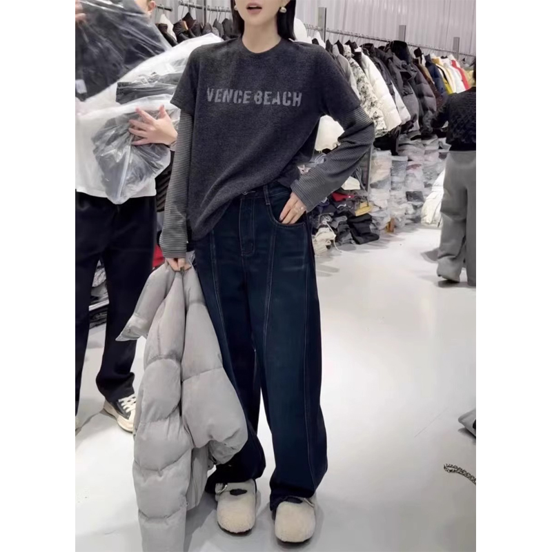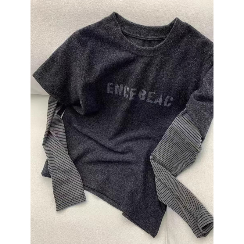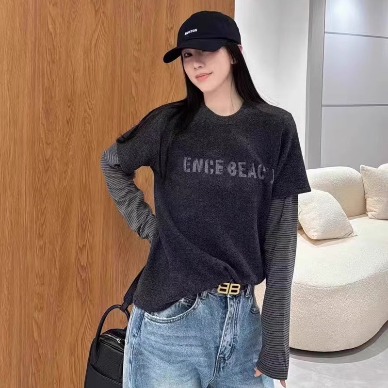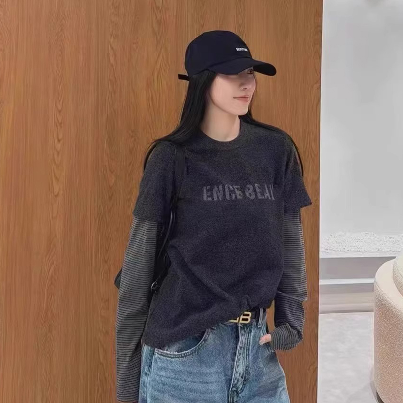 Plus Size Patchwork Stripes Sleeve Fake Two-Piece Long Sleeves T-shirt Female European Station 2024 Fall and Winter New Arrival Letter Printed Bottoming Shirt