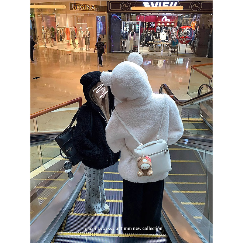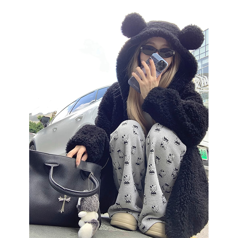 Plus Size Women's Clothing Bear Hooded Long Sleeves Pure Color Outwear Female Winter Warm and Loose Casual Lamb Wool Cardigan Top Female