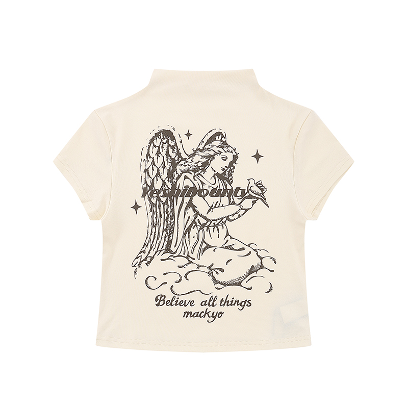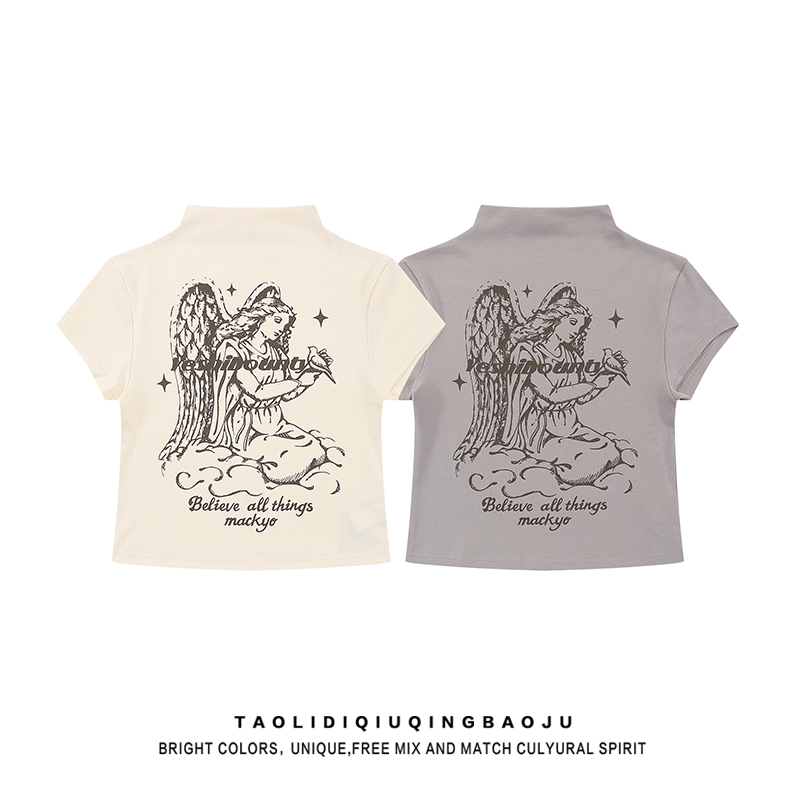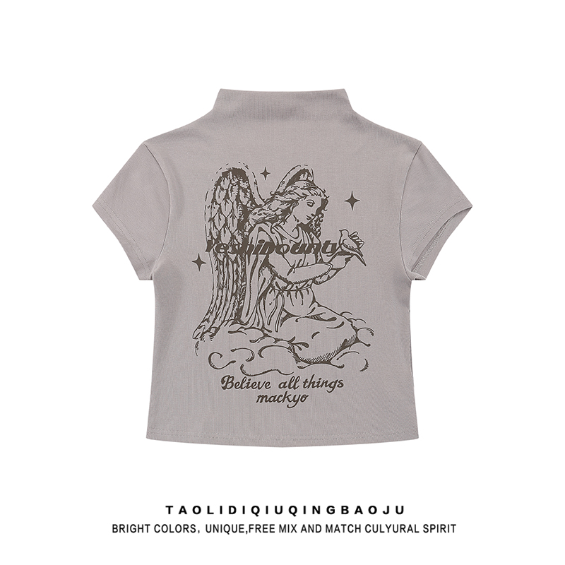 Print Half Turtleneck Summer Slim Fit Shoulder Short Sleeve T-shirt