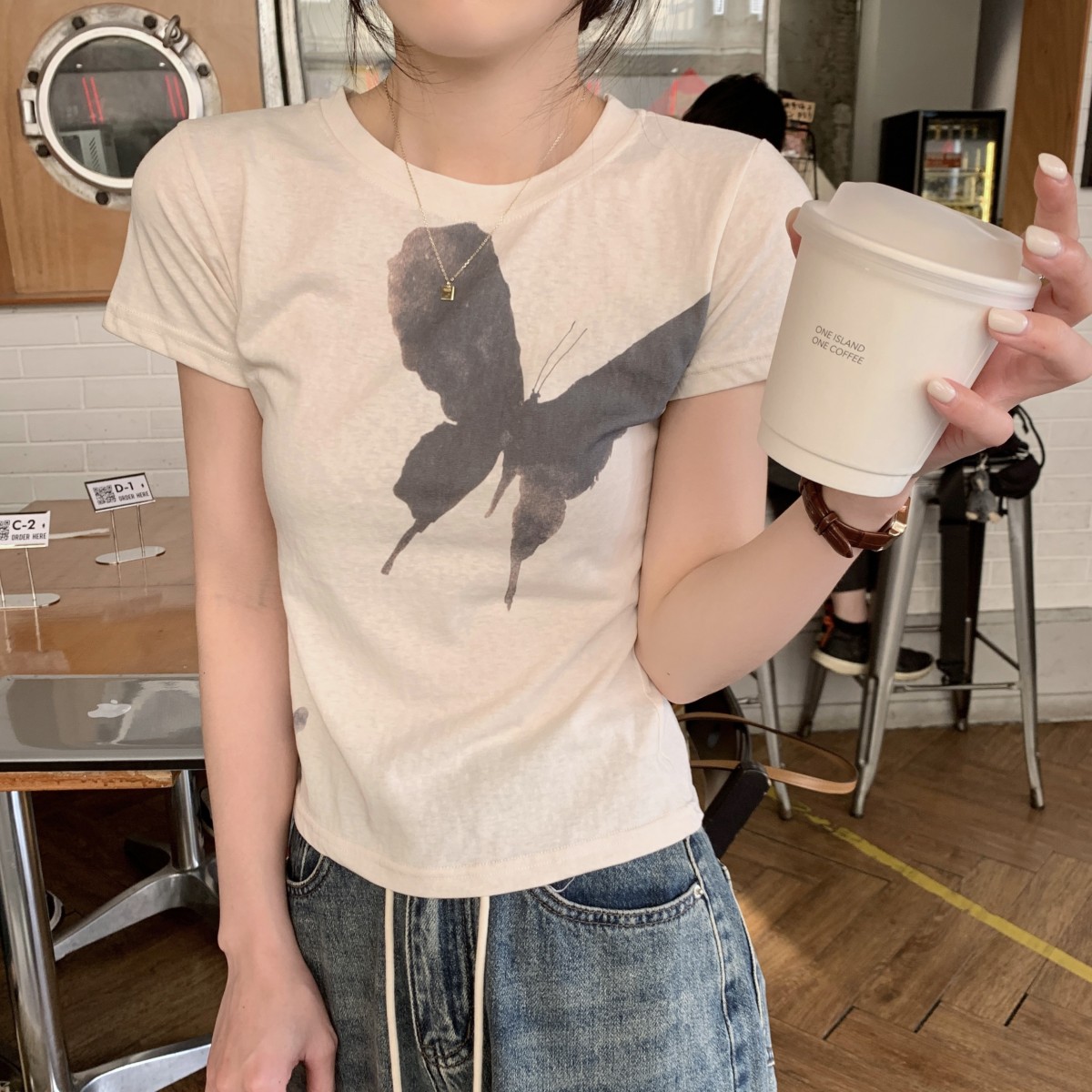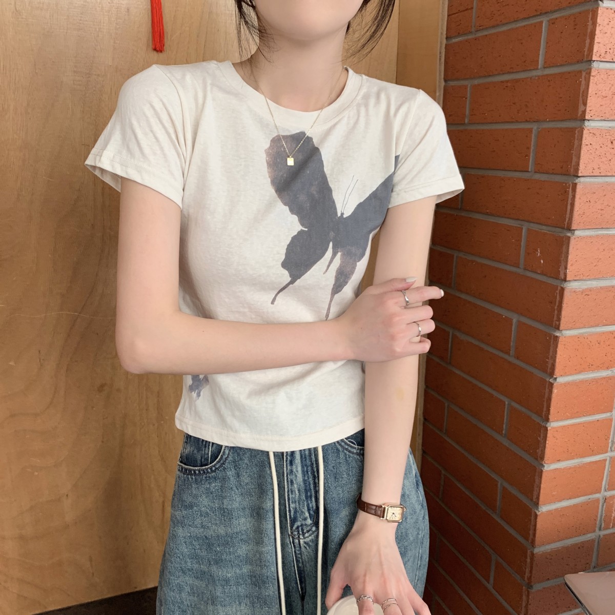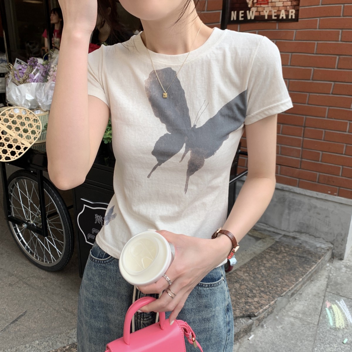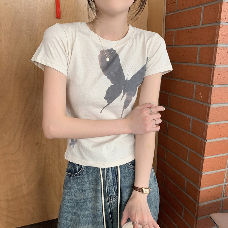 Print Shoulder Women's Summer Silm Chic Short-Sleeved T-shirt
