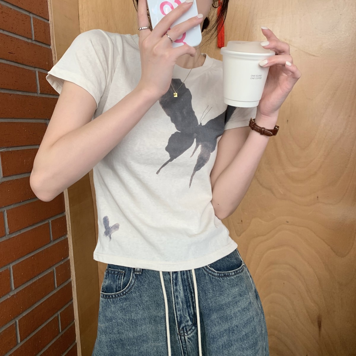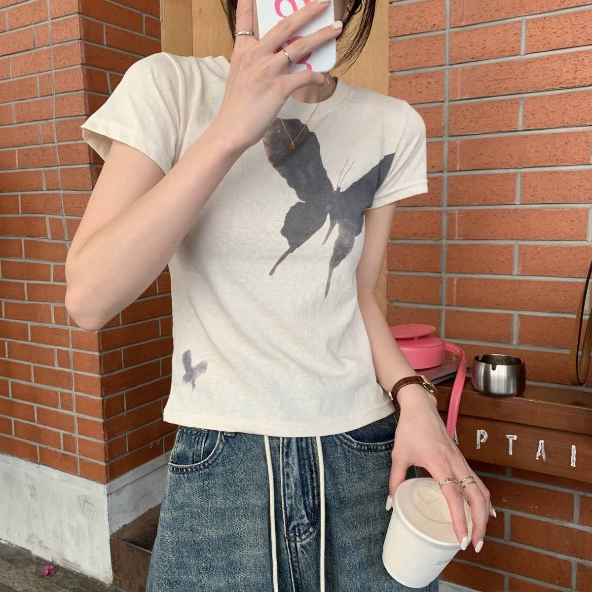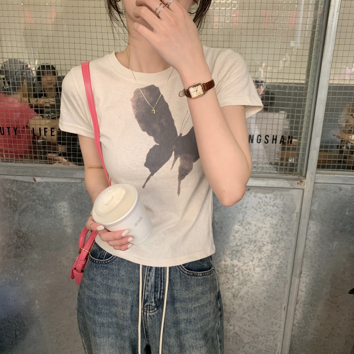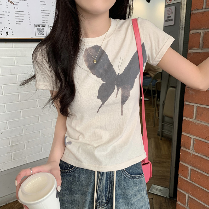 Print Shoulder Women's Summer Silm Chic Short-Sleeved T-shirt