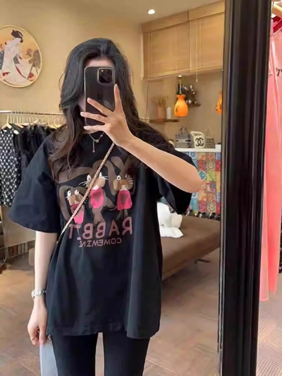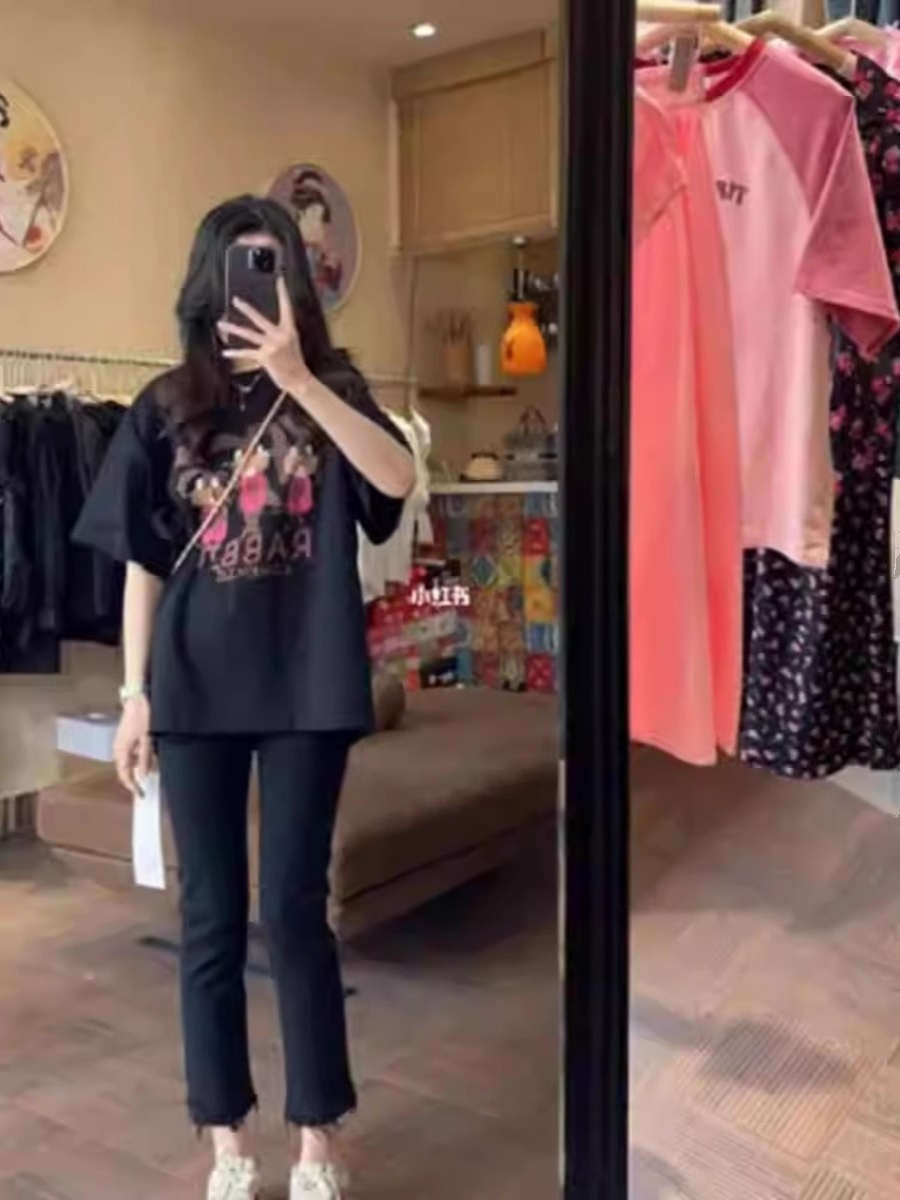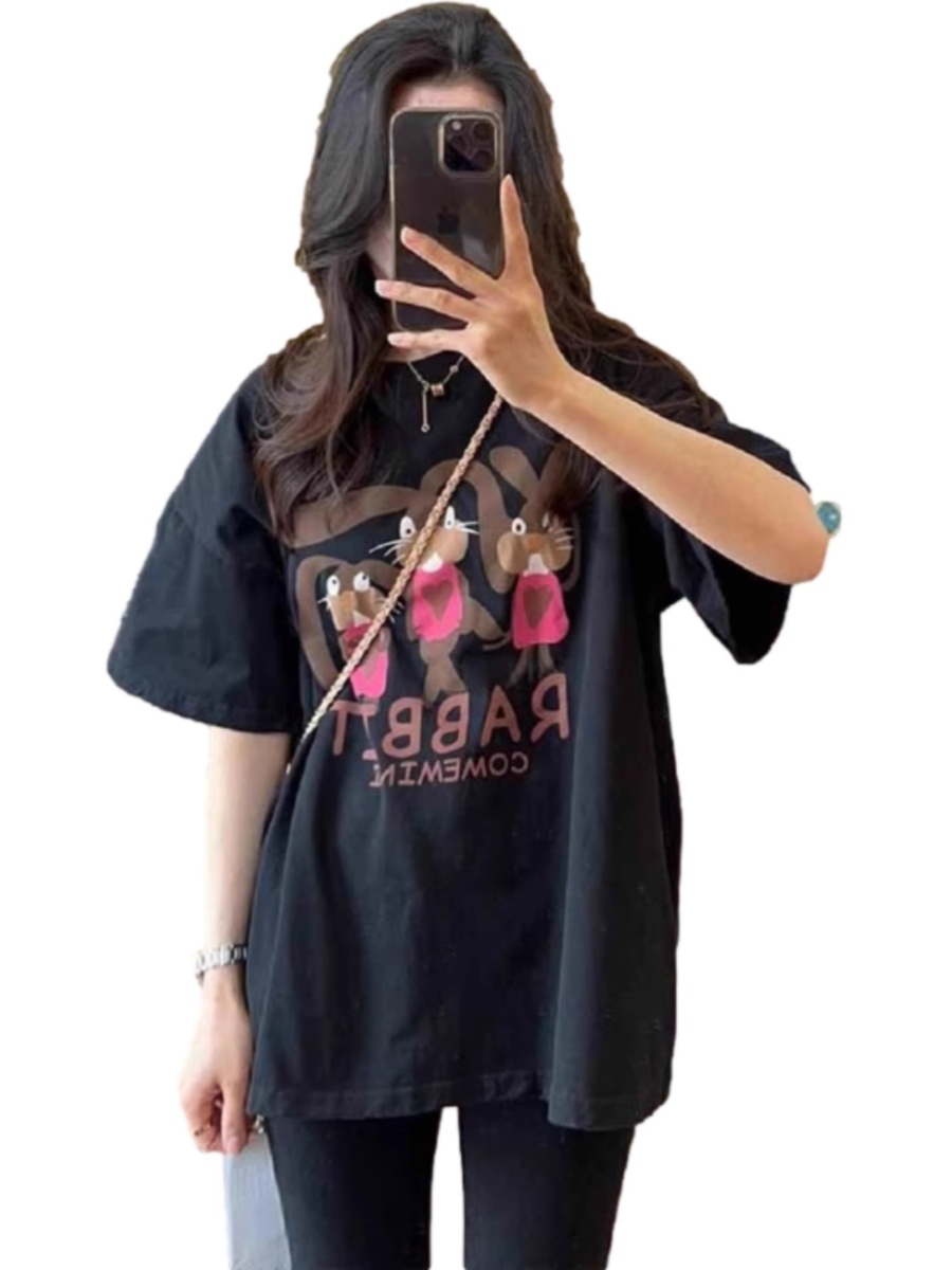 Pure Cotton Shoulder Sweet Cool Retro Black Short-Sleeved T-shirt Female 2025 Summer New Arrival Loose Slim-Looking Half-Sleeved Top