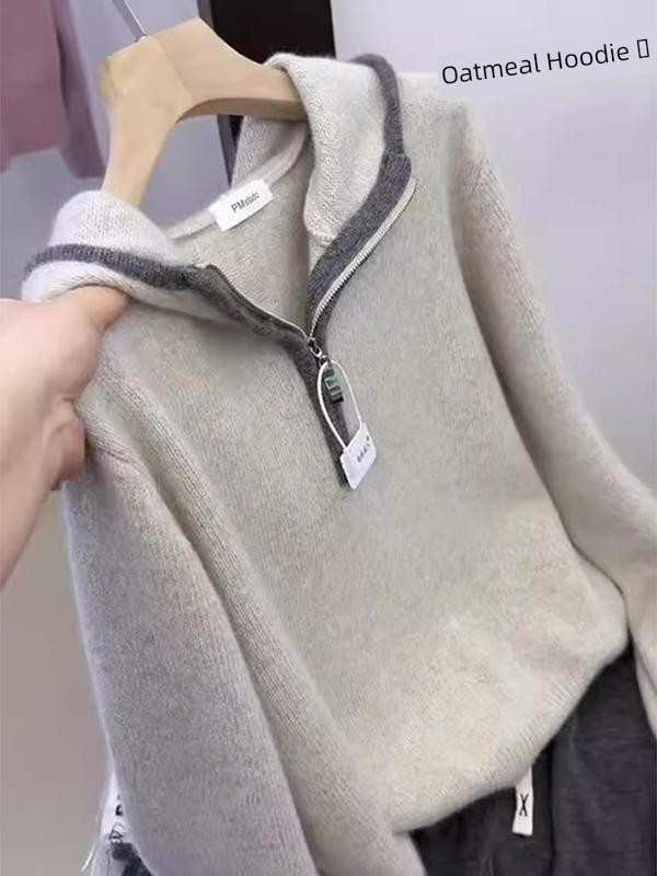 Recommendable! European Goods Classy Hooded Half Zipper Oatmeal Color Cashmere Sweater Women's Spring Thickened Thermal Sweater