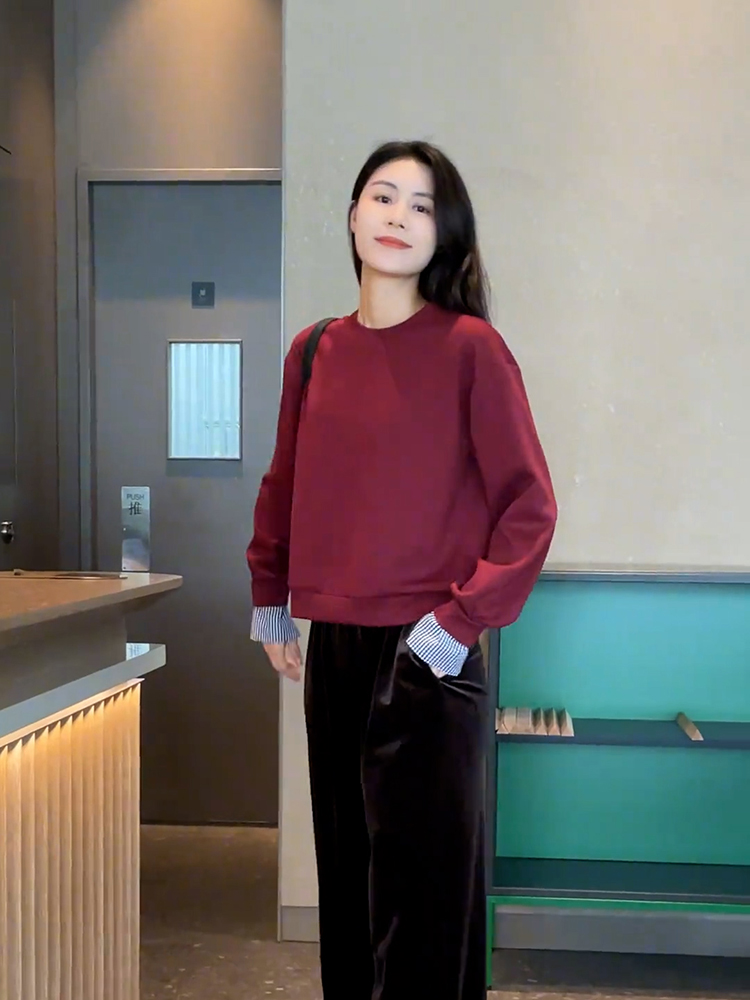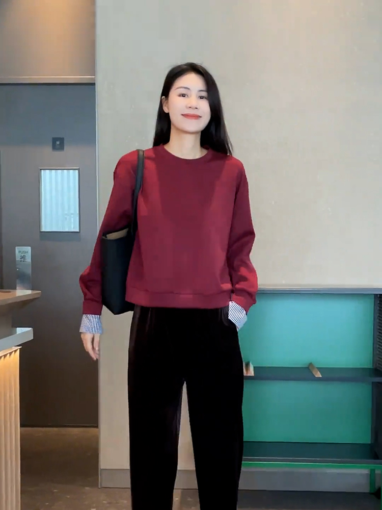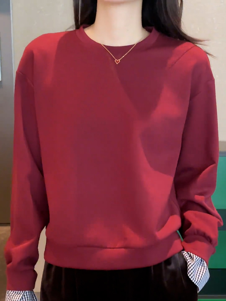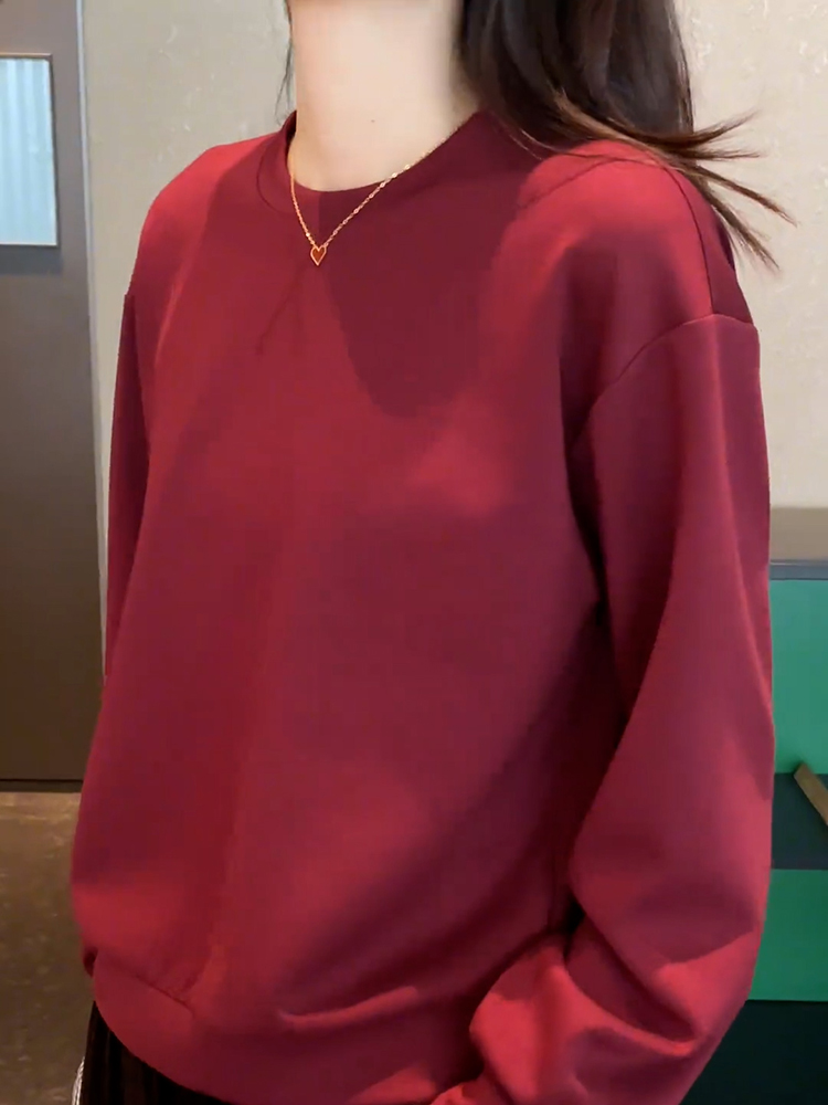 Red round-Neck Sweatshirt Women's Autumn Clothing 2025 New Arrival Fleece-lined Thickened Loose Design Niche Style Unique Chic Tops