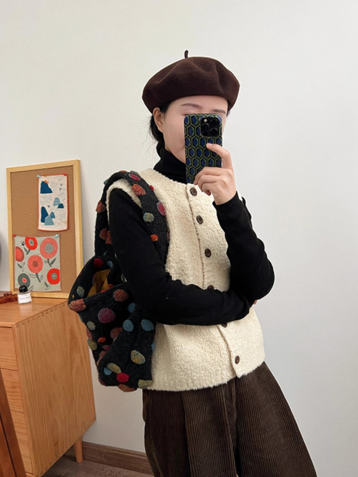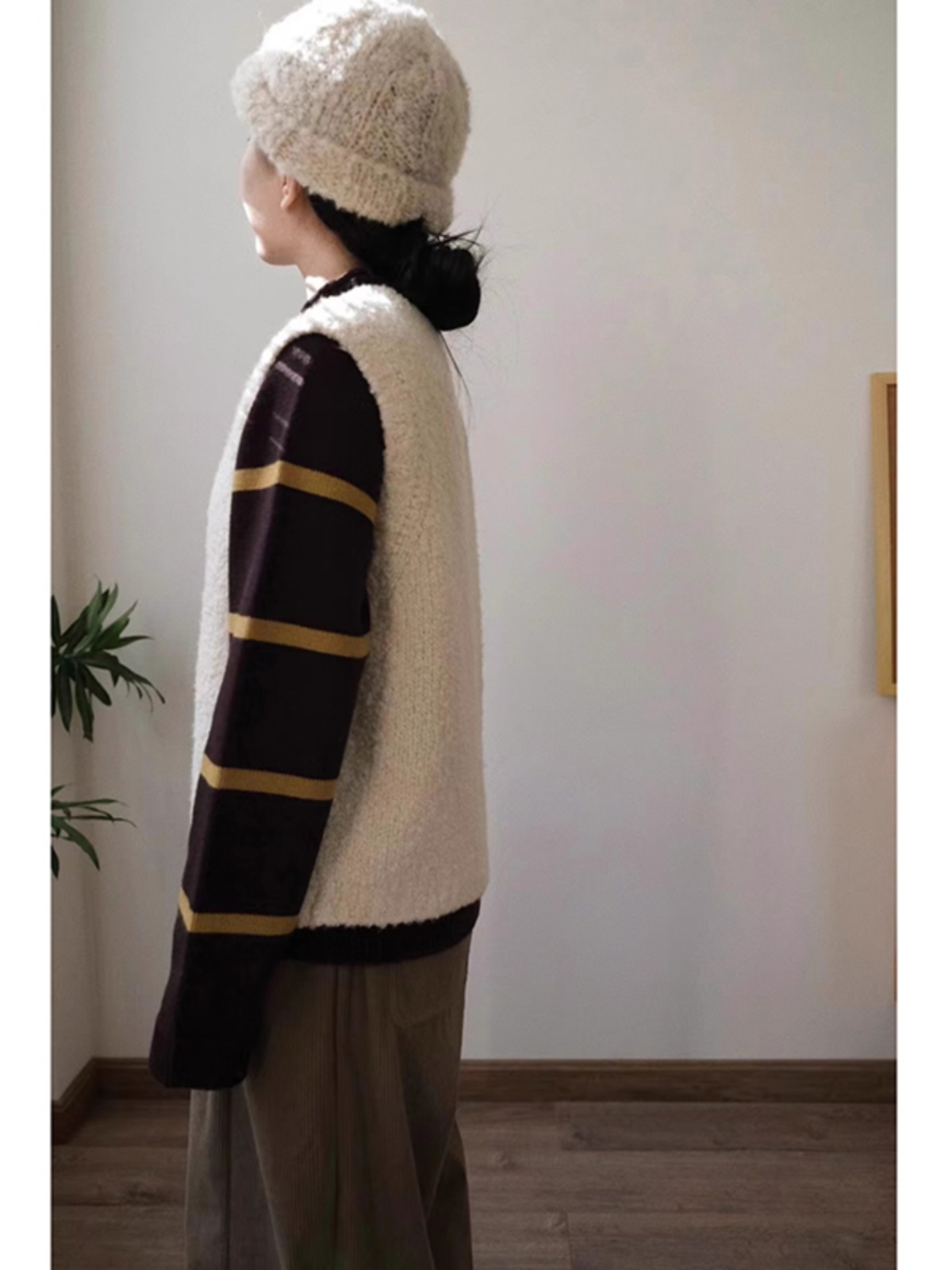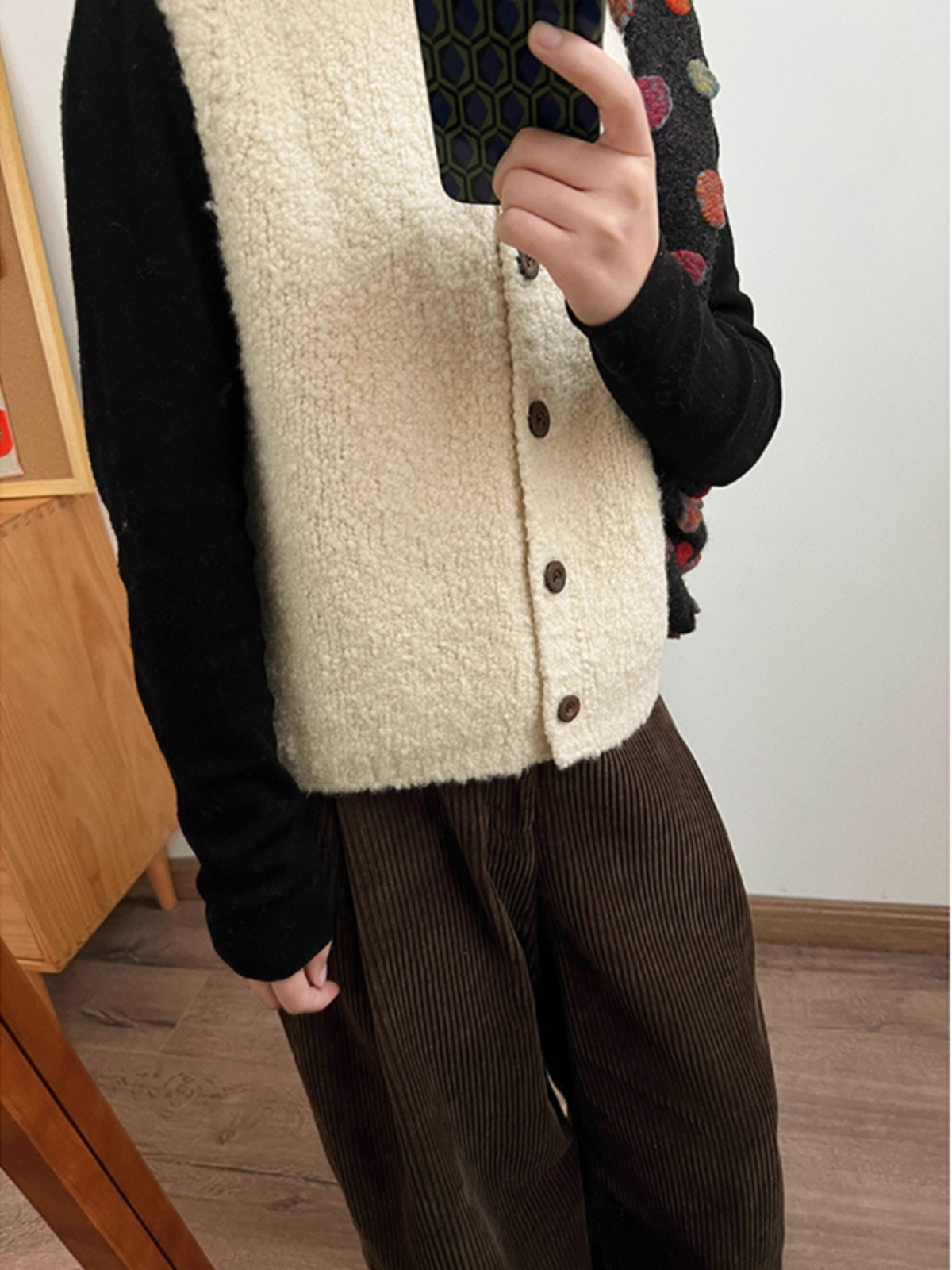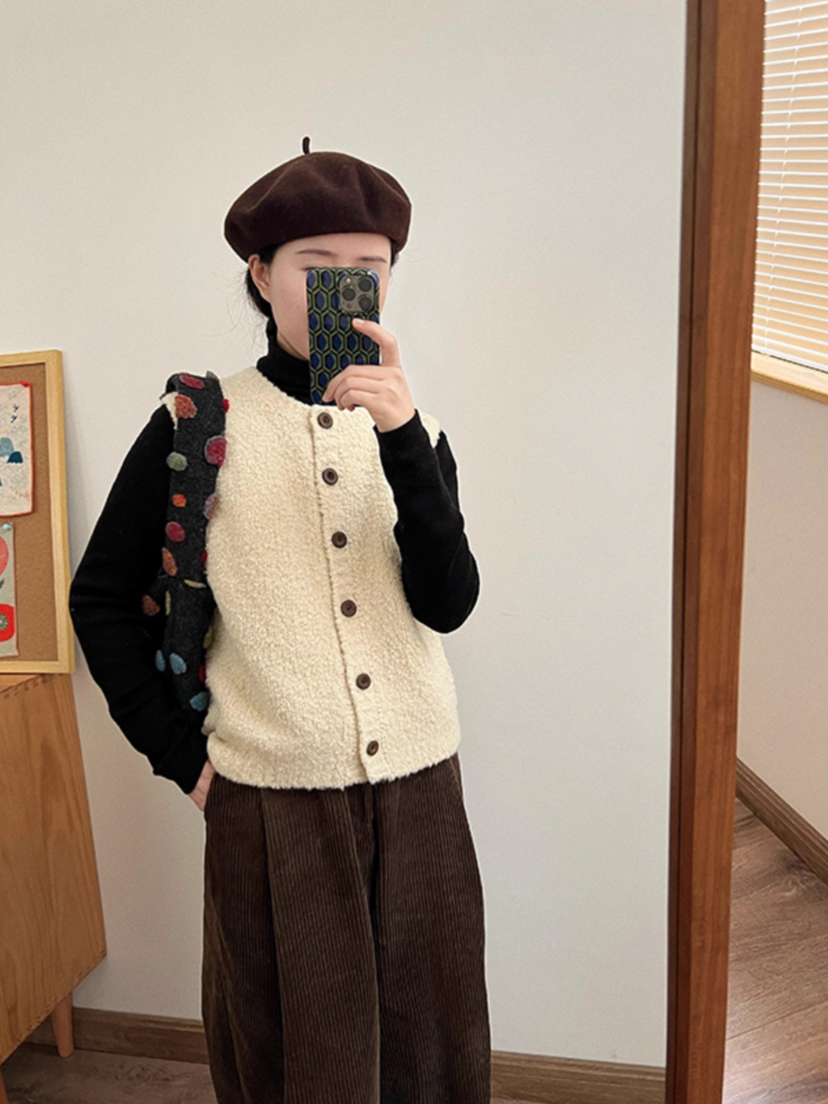 French Retro Alpaca Fleece V-Neck Sweater Vest - Chic & Slimming Outerwear for Spring/Autumn Layering