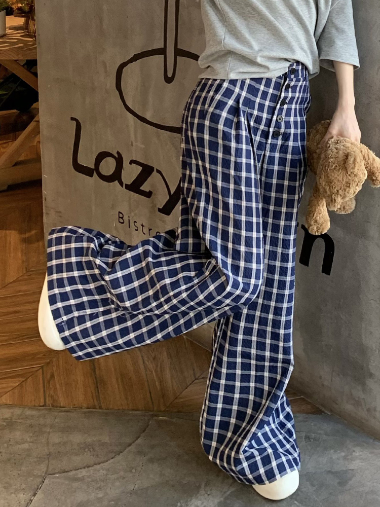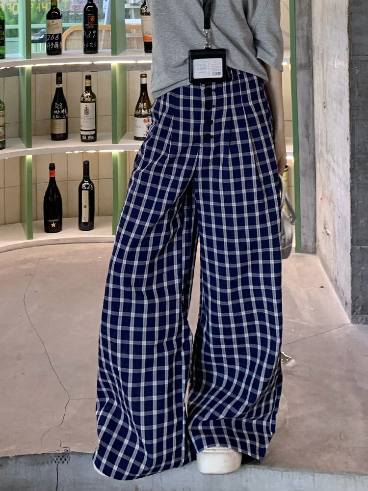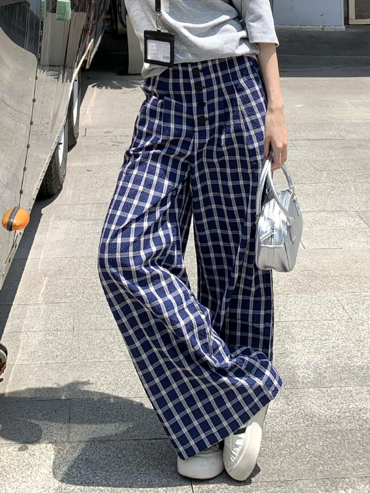 Retro Blue Gingham Casual Pants for Women 2025 New Arrival Lazy Relaxed Pants Loose Drooping Straight Mopping Pants