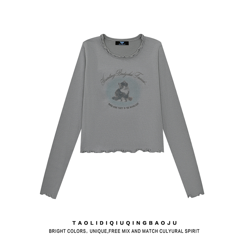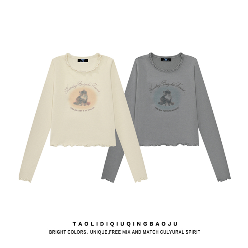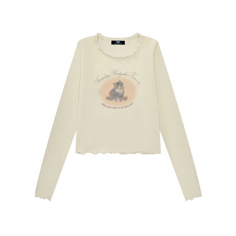 Retro Cat Wooden Ear Small Top Long Sleeves T-shirt