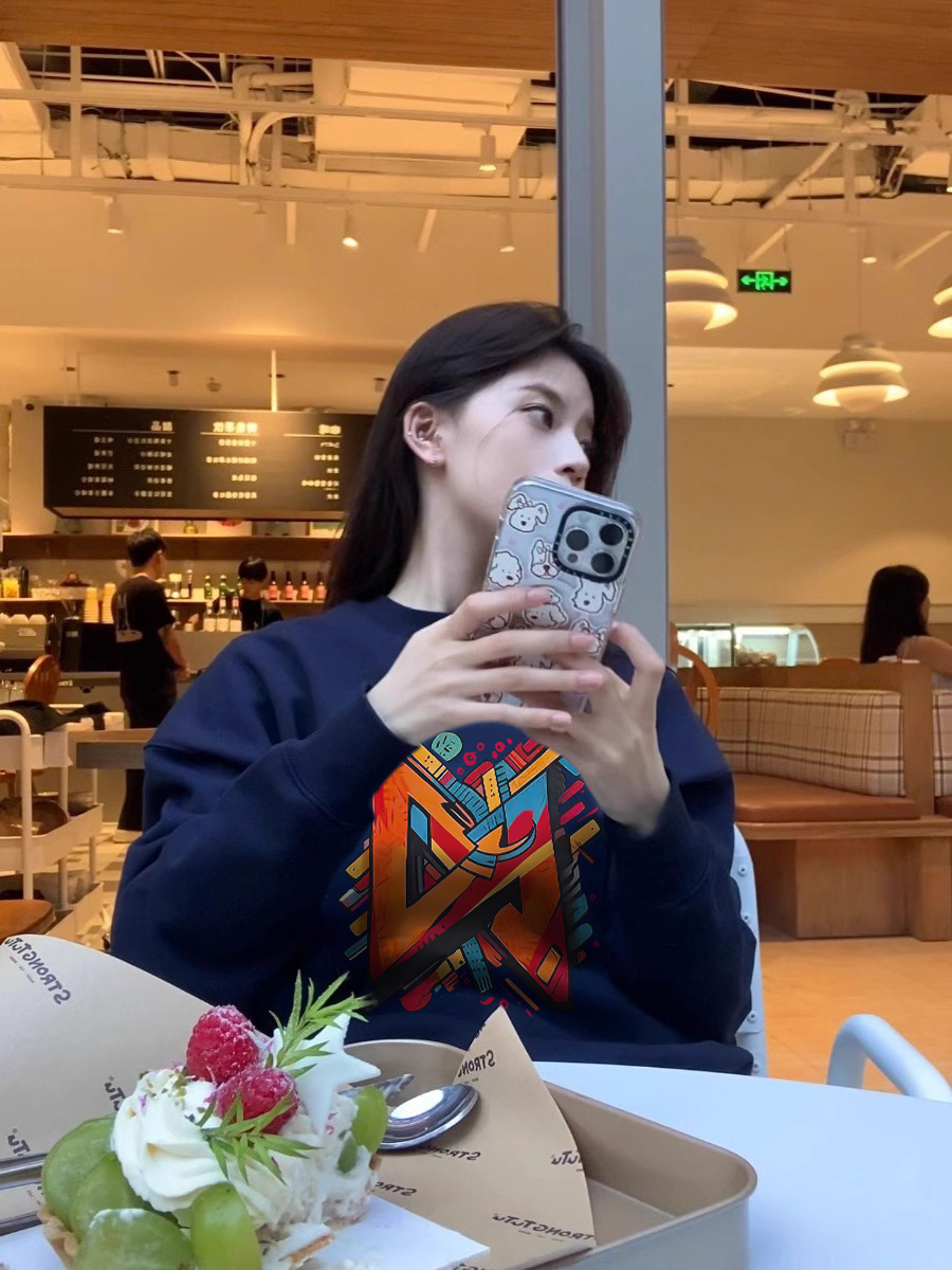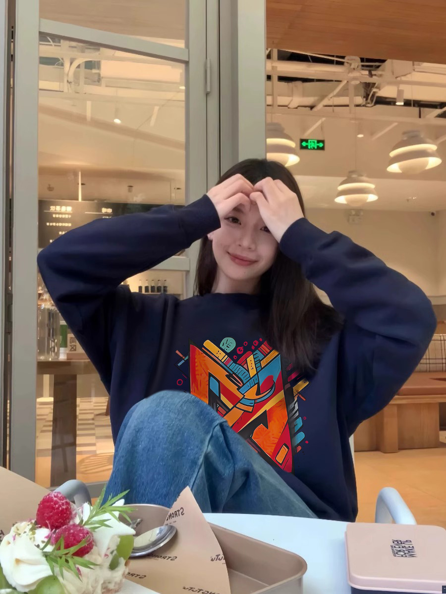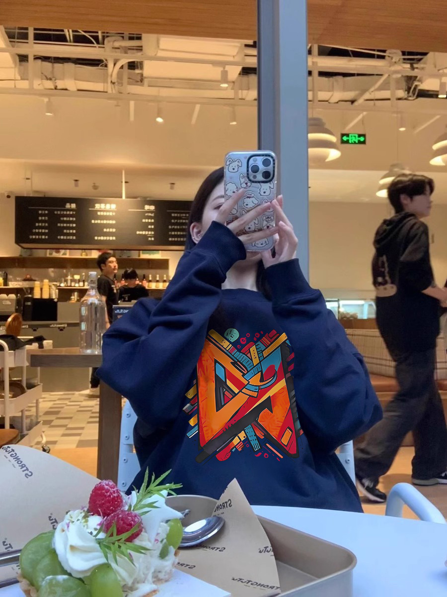 round Neck Lazy Style Sweatshirt Female Spring & Fall 2025 New Arrival Color Graffiti Printing Fleece-lined Thickened Loose Top Coat