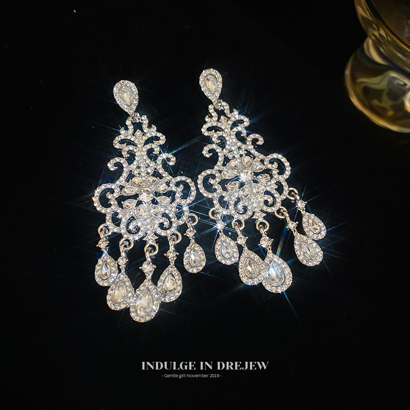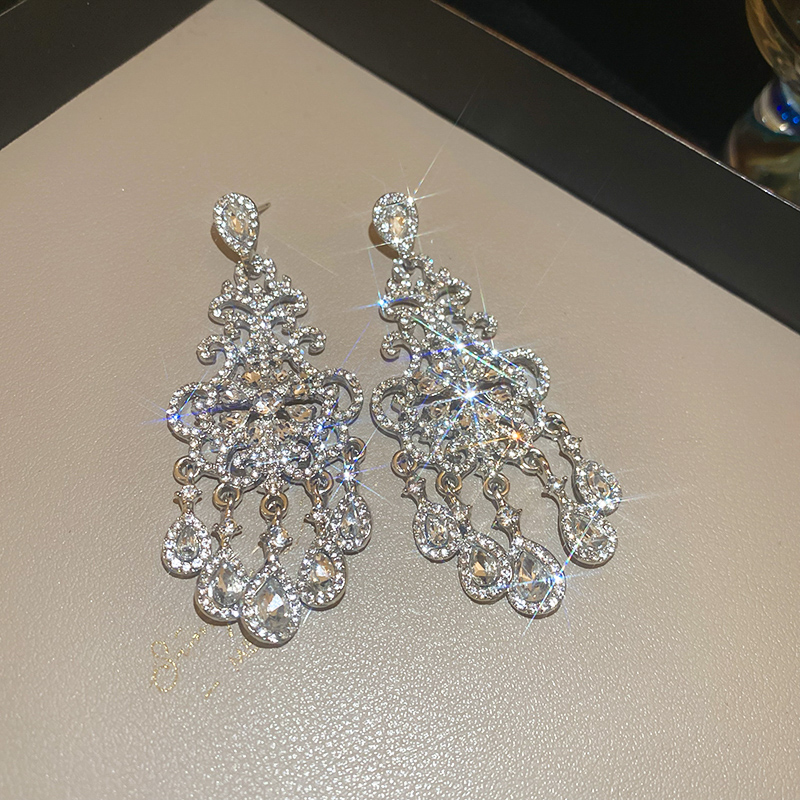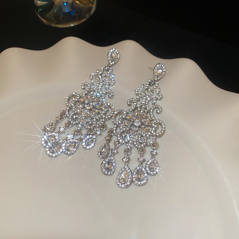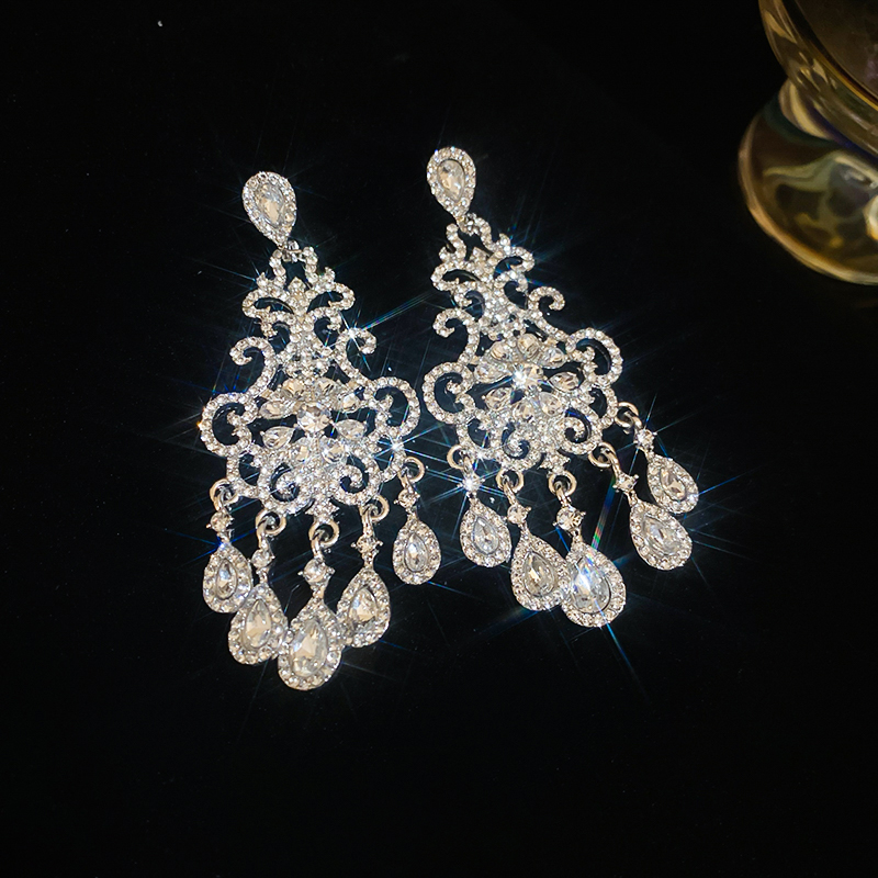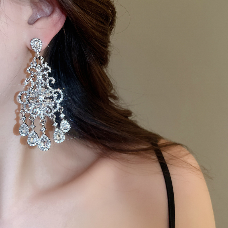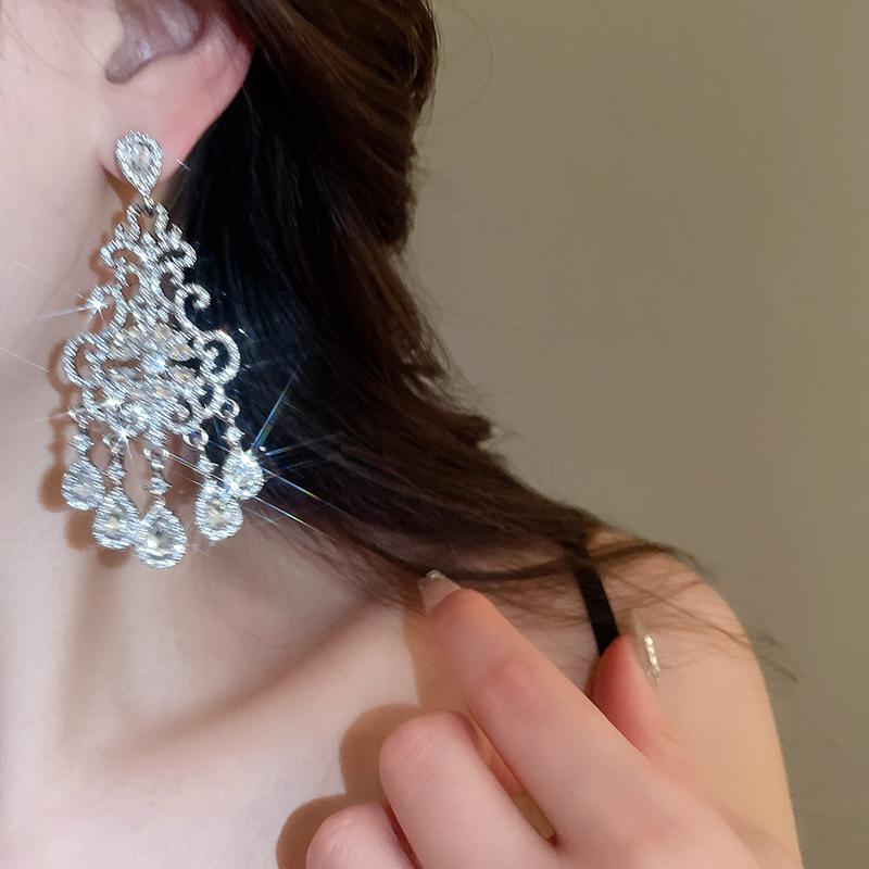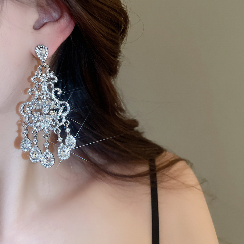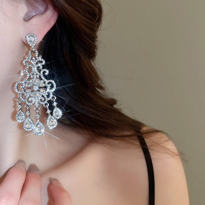 Silver Full Diamond Pattern Water Drop Tassel Earrings for Women Accessible Luxury Fancy Elegant Generous Earrings Exaggerated Delicate Earrings