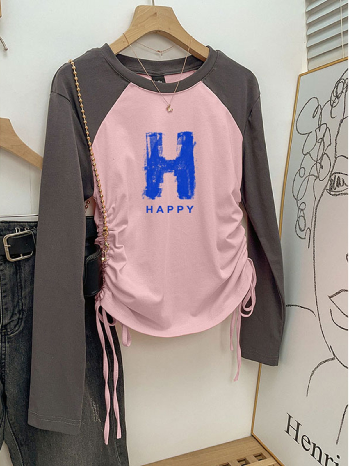 Spring & Fall Plus Size Stylish Drawstring Raglan T-Shirt Women's Long Sleeve Silm Slim Looking Base Short Inner Oversized Girls' Top