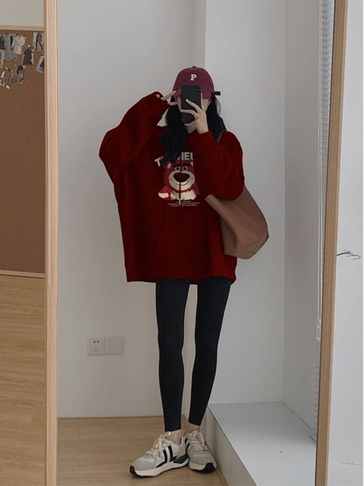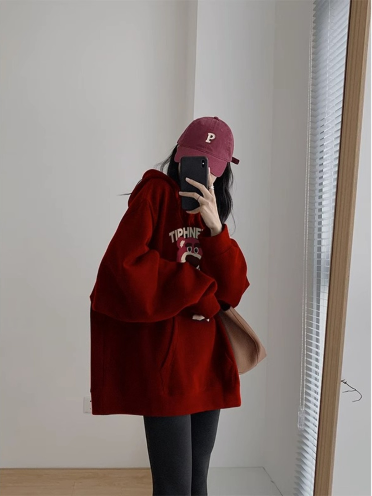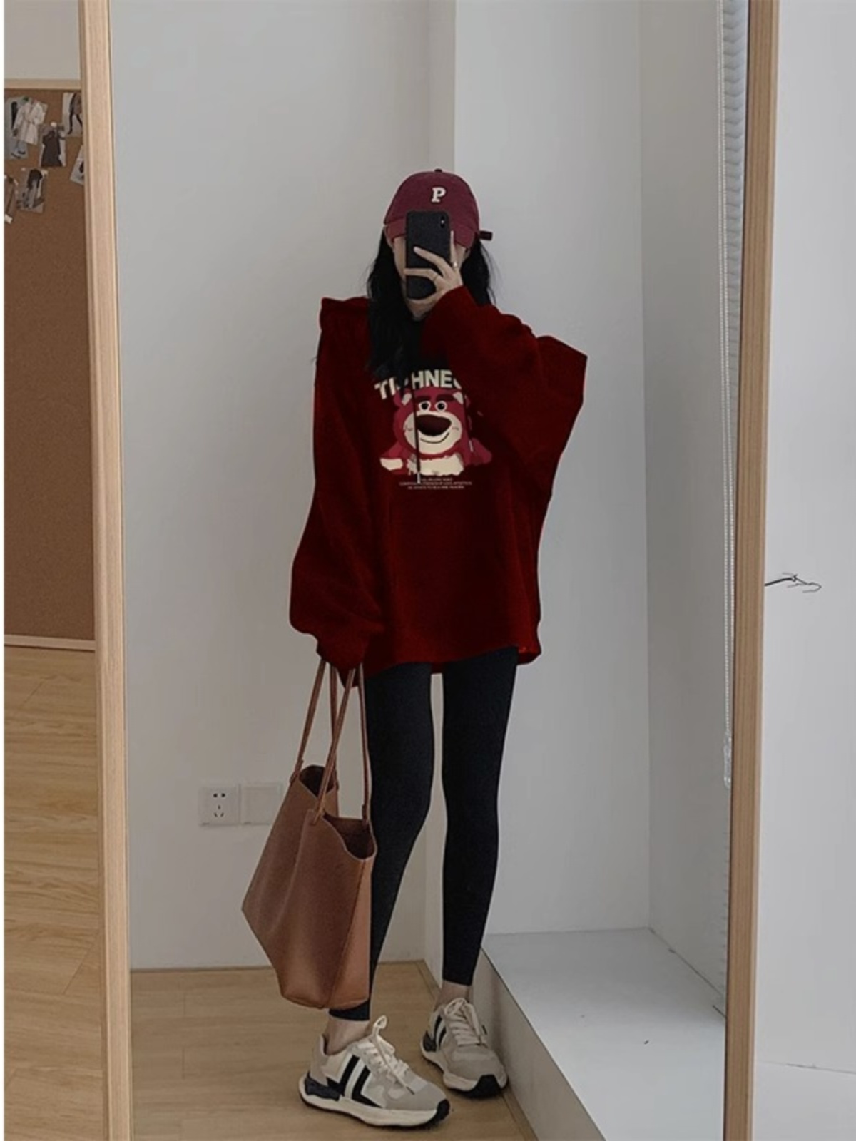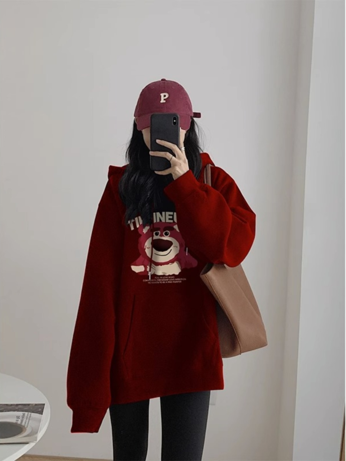 Strawberry Bear Wine Red Hoodie Women Spring and Autumn Thin Unique Chic Super Nice Loose Outerwear Small Top