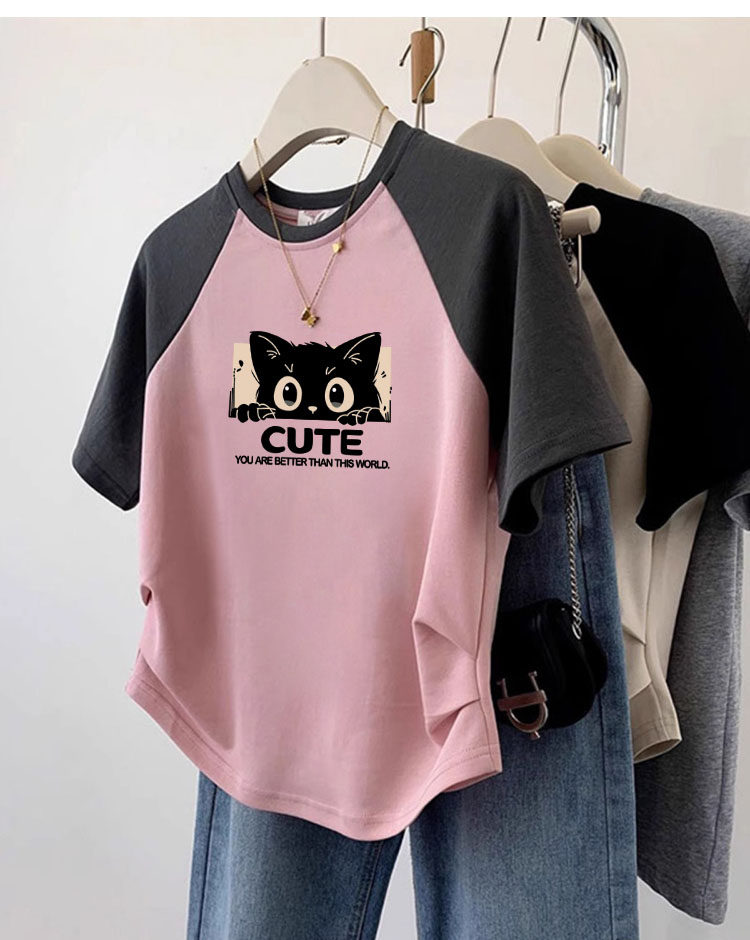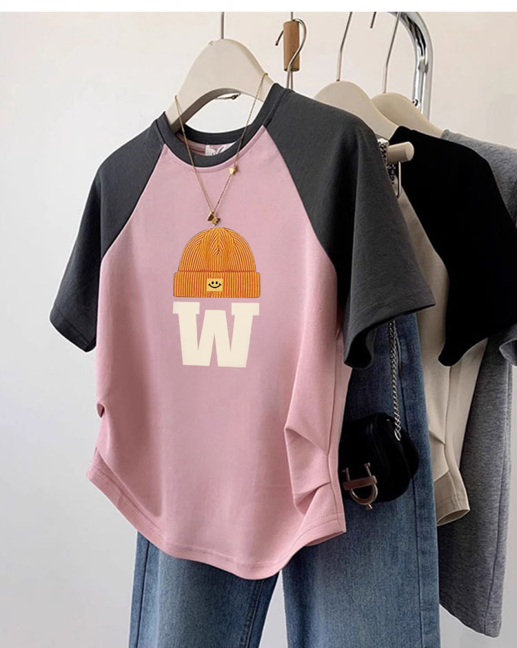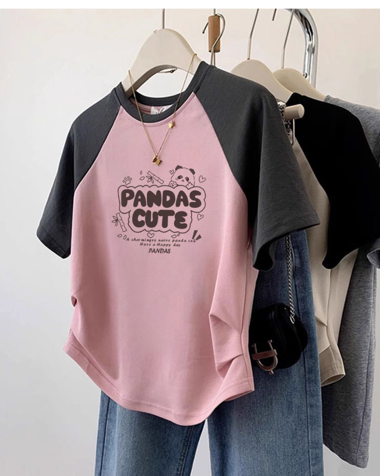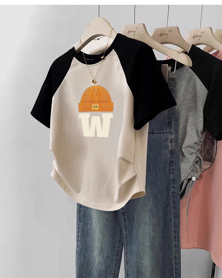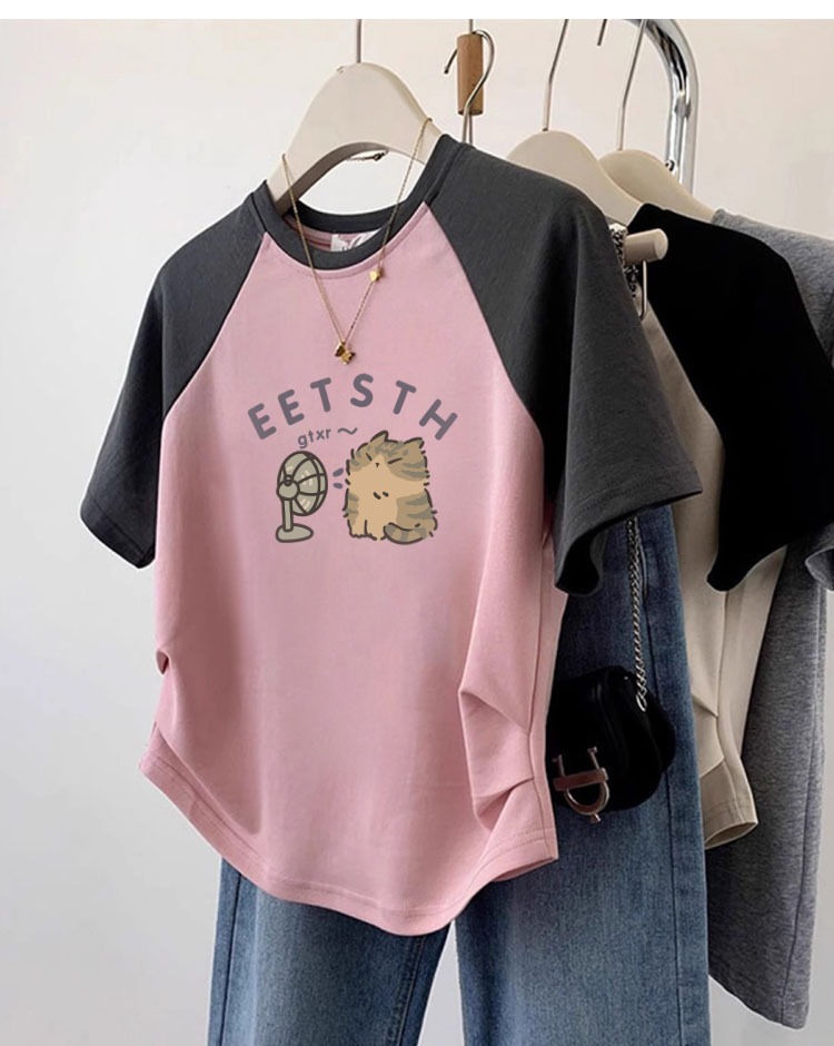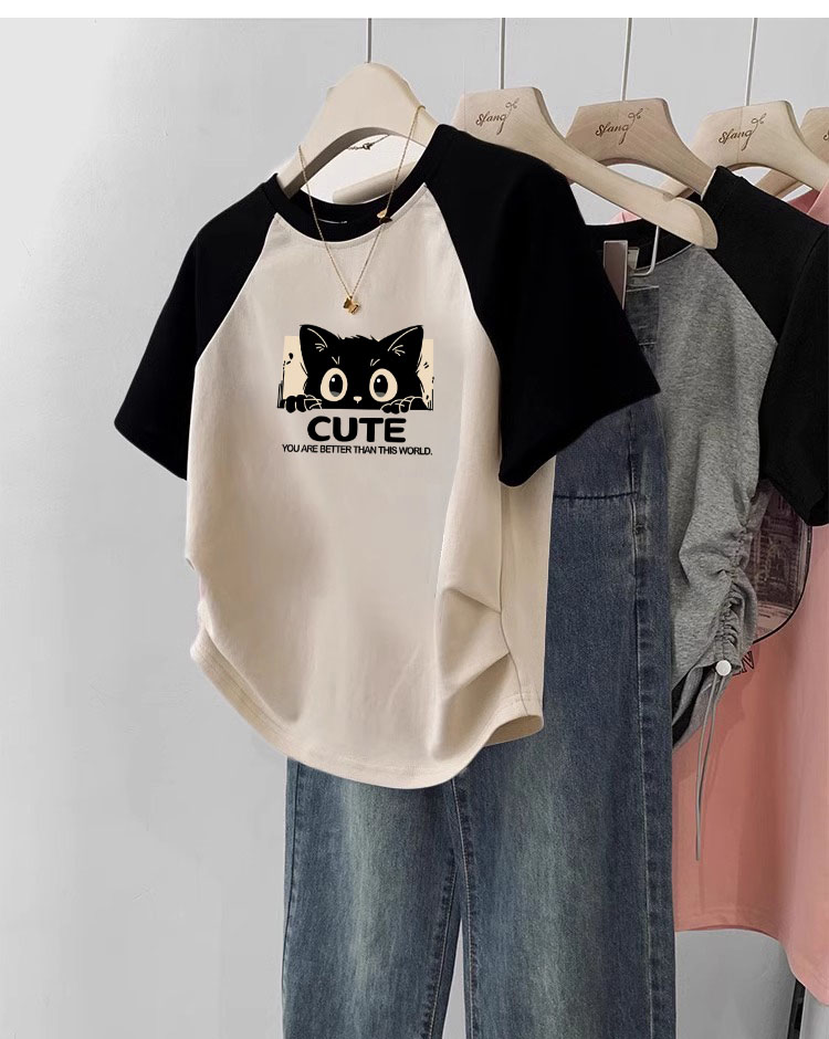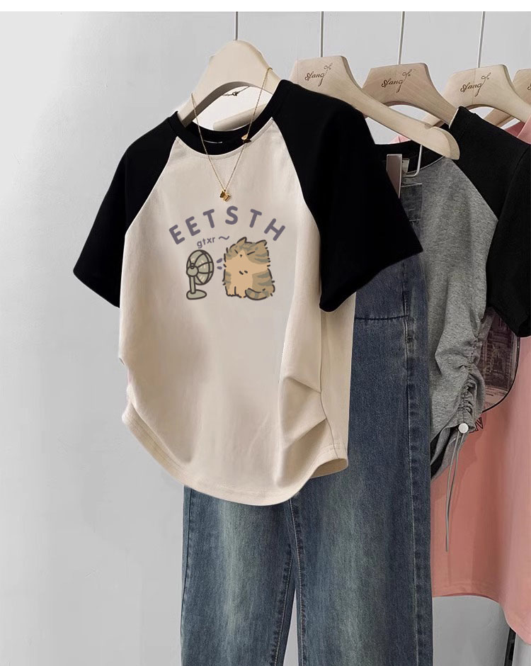 Thirteen Rows Women's Cotton Short-Sleeved T-shirts Women 2025 New Arrival Summer Silm Contrast Colors Slimming Ruched Short Tops