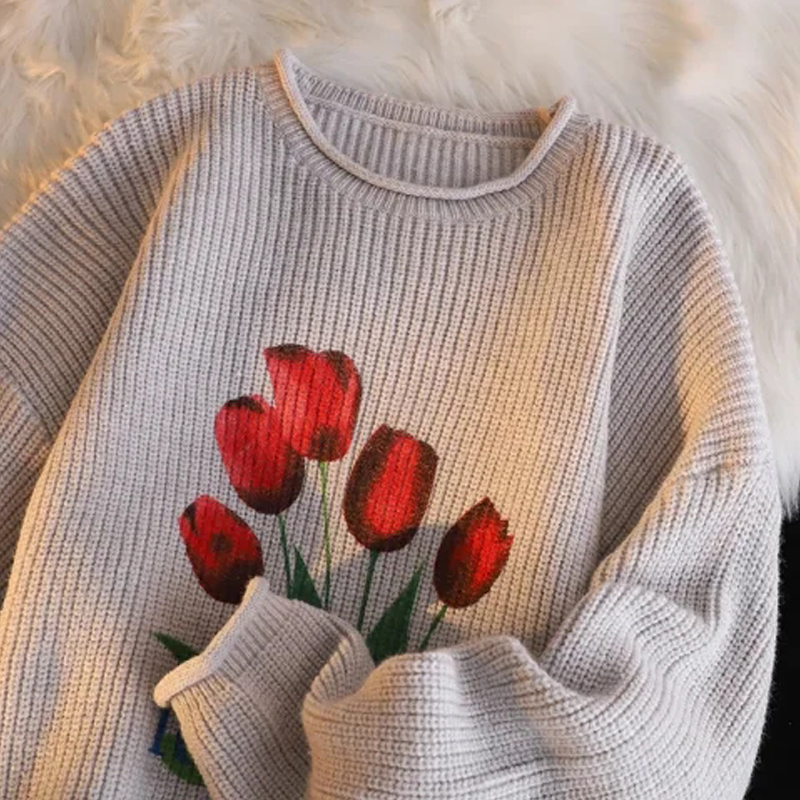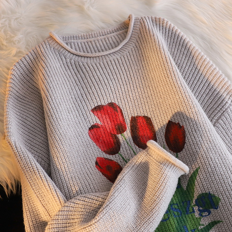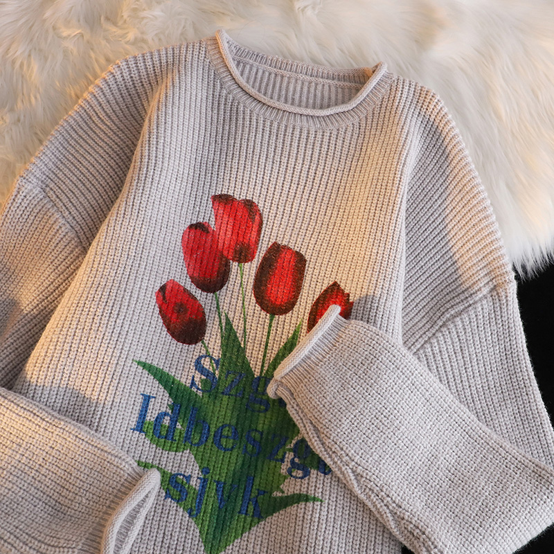 Tulip Print Sweater Women's Autumn and Winter New Arrival Korean Style Lazy Style Loose Letter Pullover Long Sleeves Knitting Tops