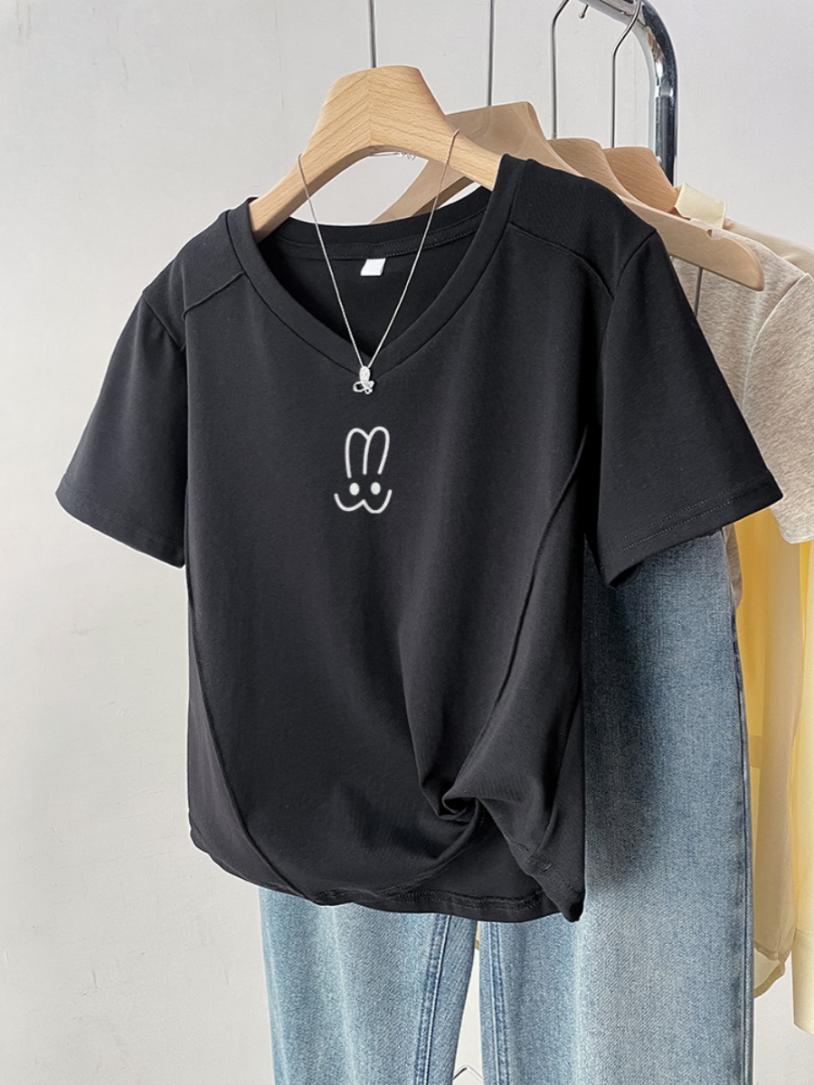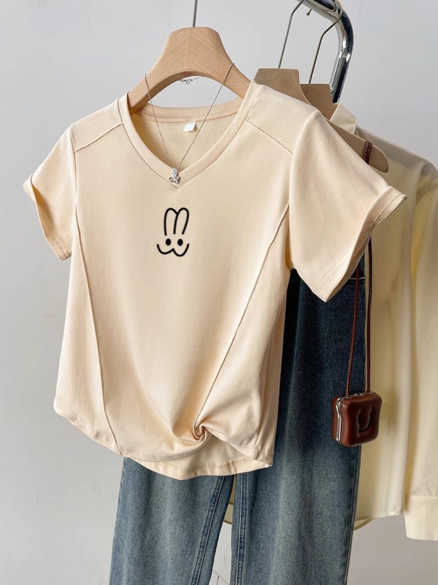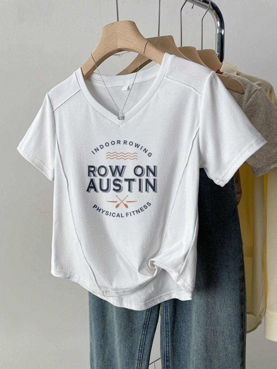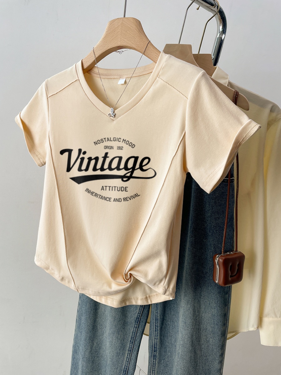 V Neck Shoulder Short Sleeve Silm Summer T-shirt Female American Retro 2025 New Arrival Best Selling Plus Size Plus Size Ladies Slim Looking Tops