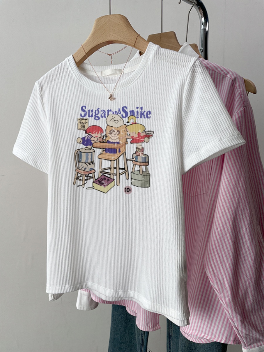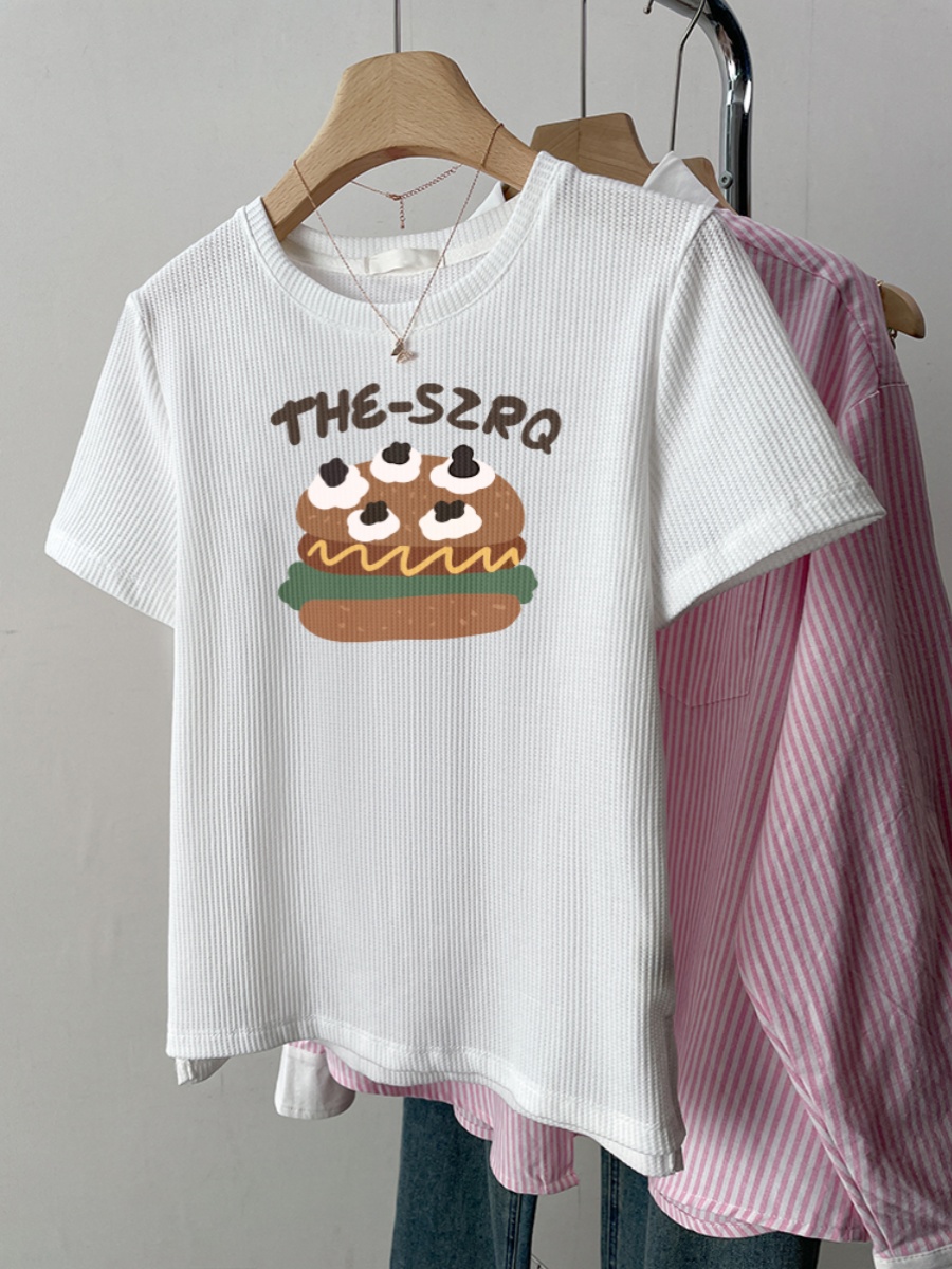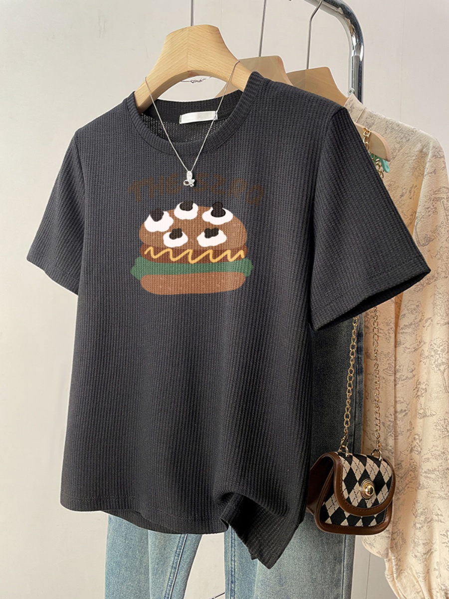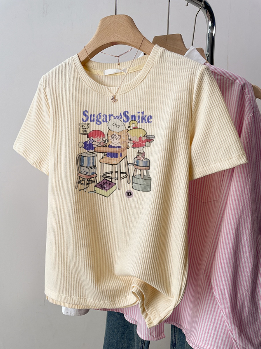 Waffle Short Sleeve T-Shirt Women's Summer Loose 2025 New Arrival Pure Color Crew Neck Half Sleeve T-shirt Plus Size Beige Coat