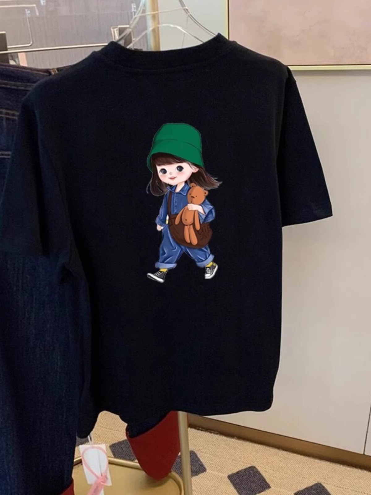 White round Neck Shoulder Short-Sleeved T-shirt for Women 2025 Summer New Design Sense Loose Casual Pure Cotton Print Tops