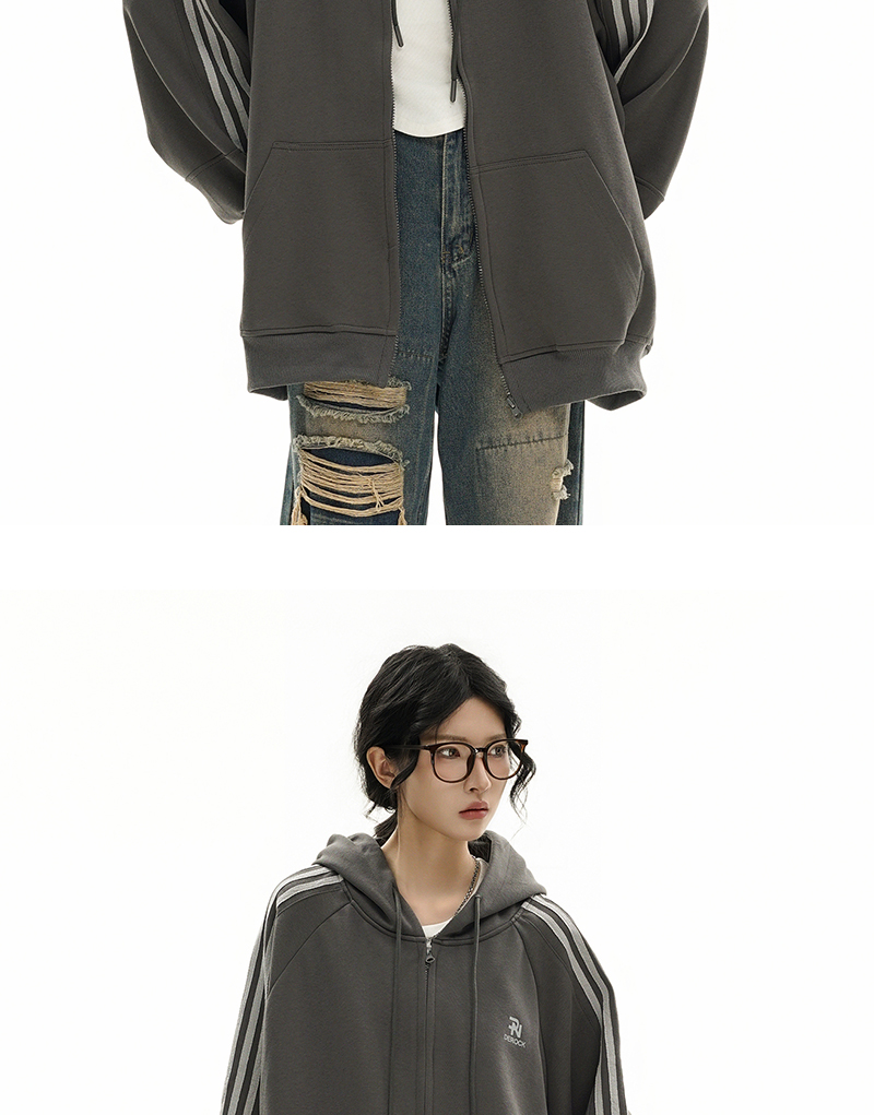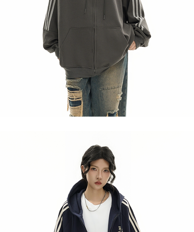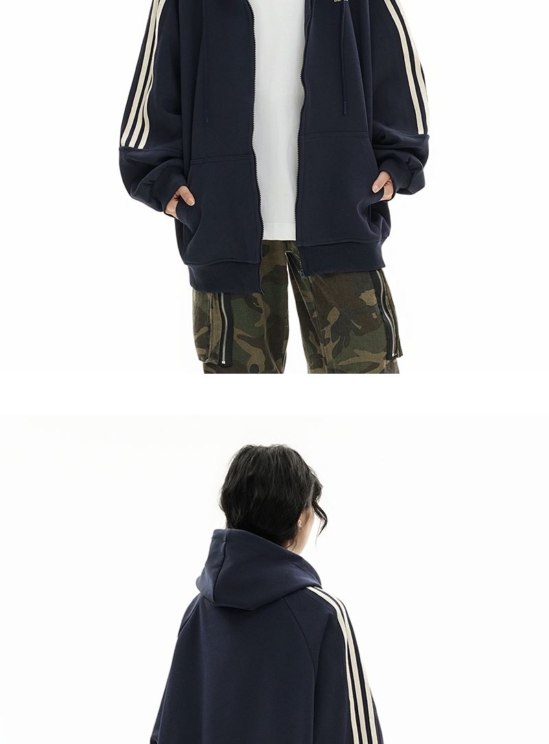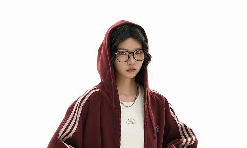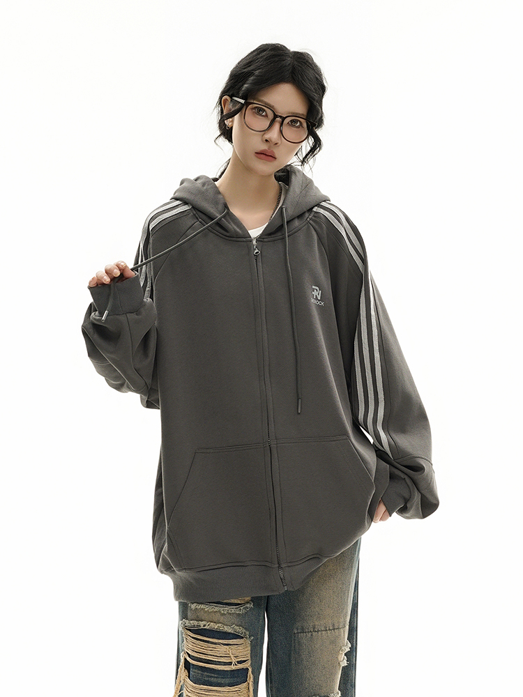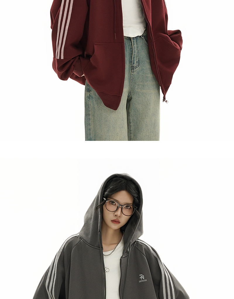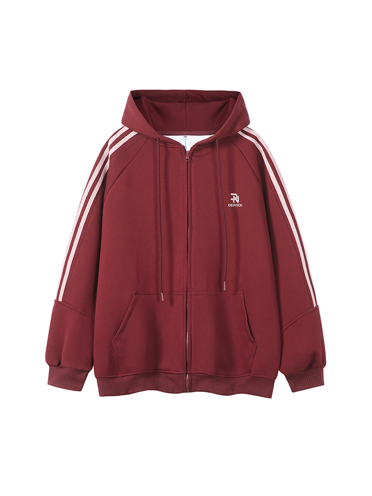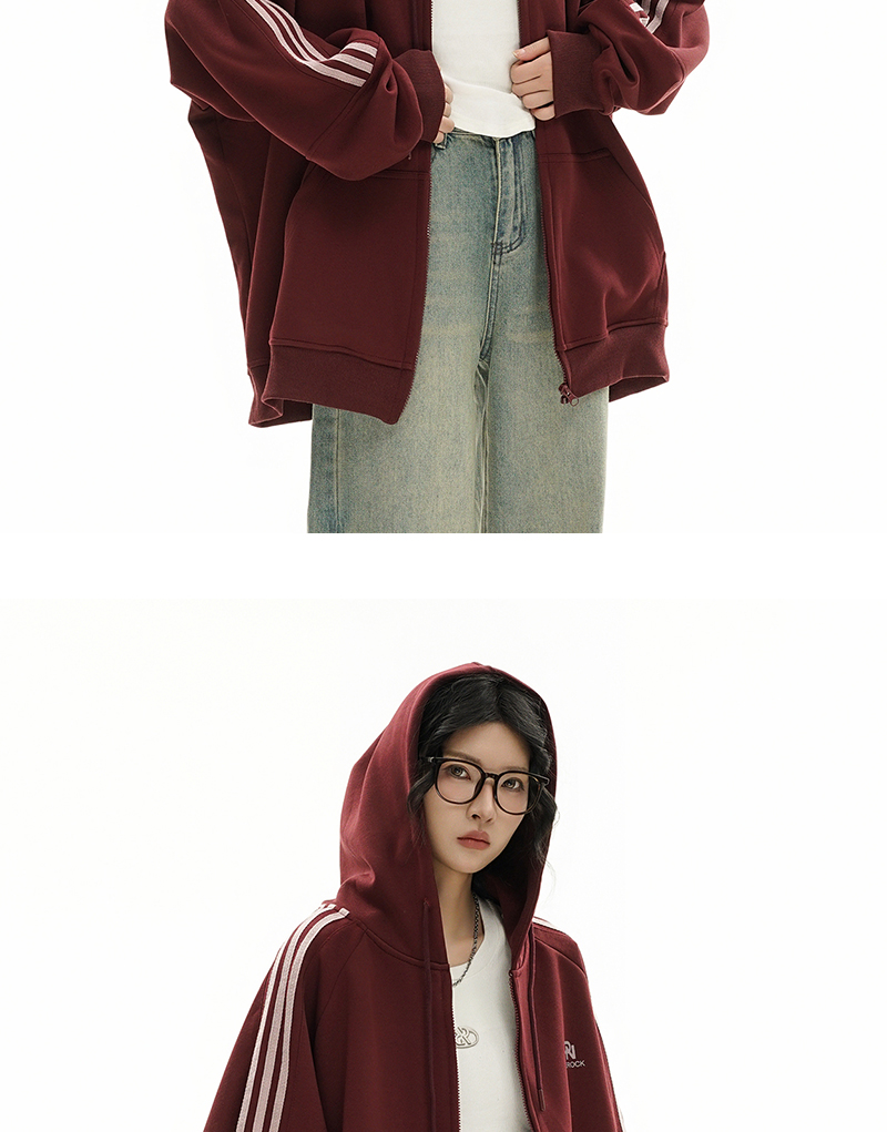 Wine Red Side Three Bars Hooded Sweatshirt Women's Autumn Clothing 2025 Loose Couple Outfit Heavy Weight Fleece Cardigan Outwear