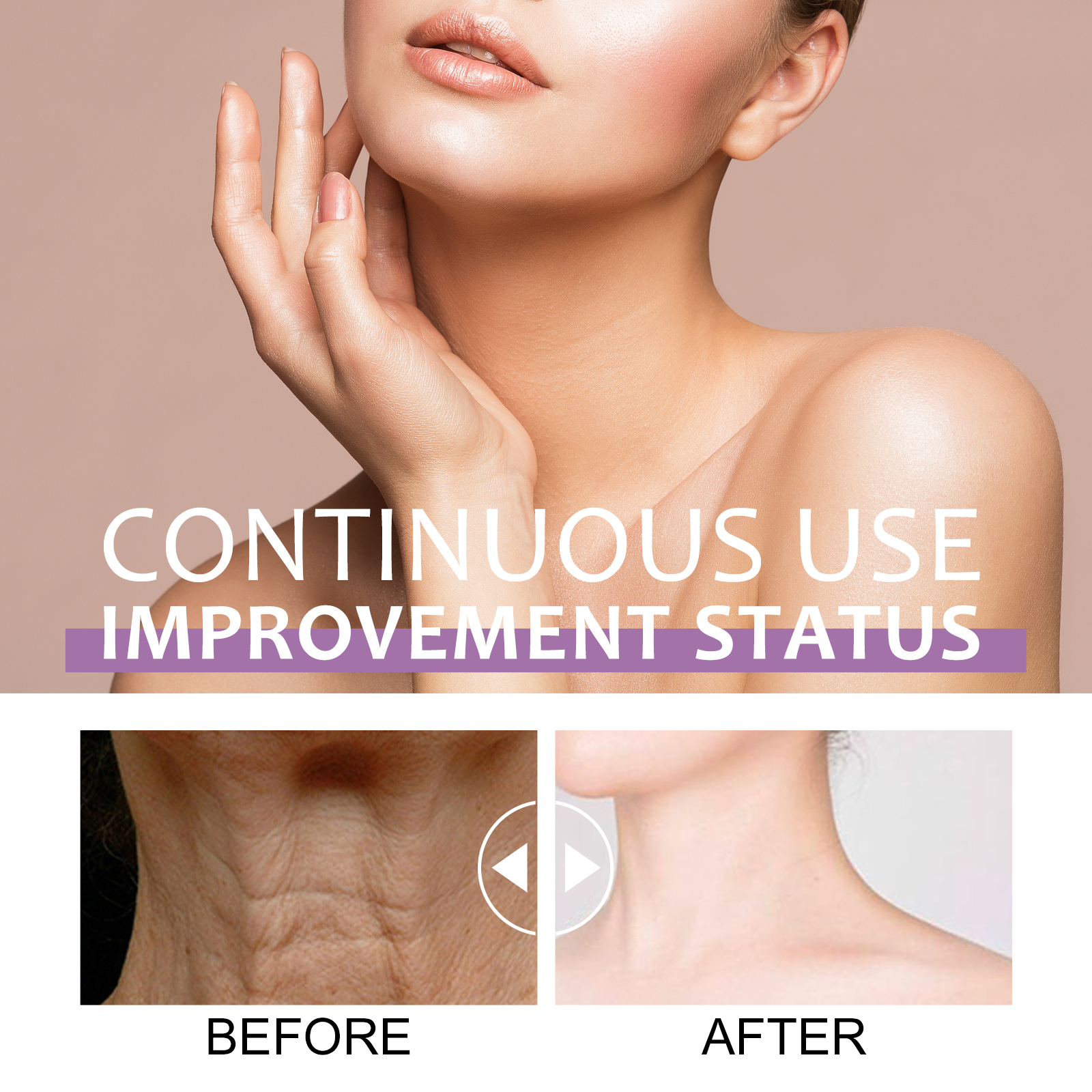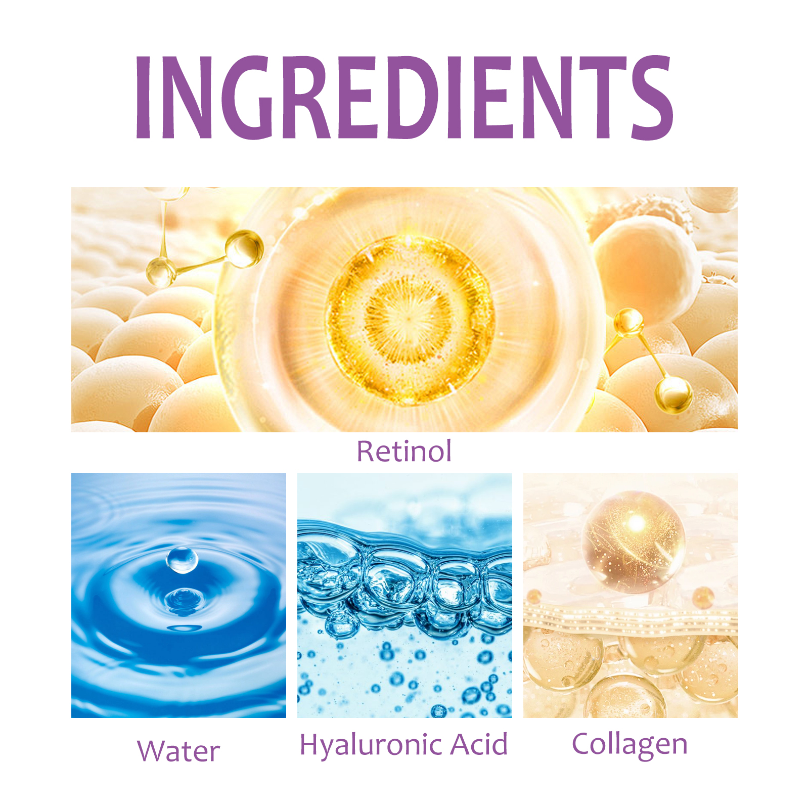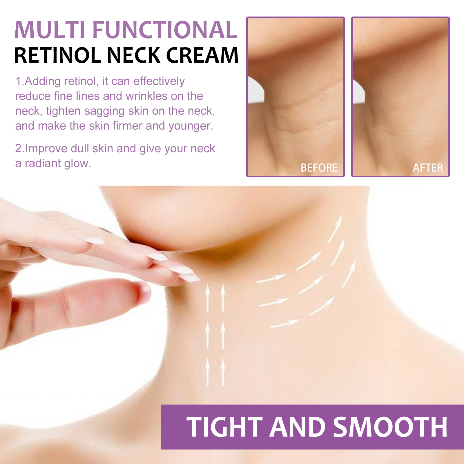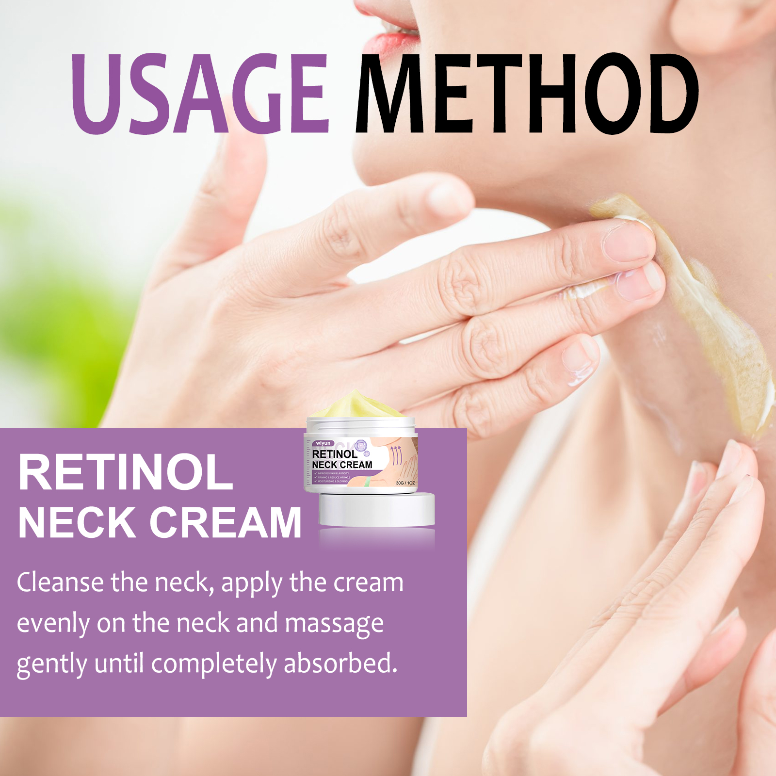 我们的视黄醇颈霜含有视黄醇、透明质酸、胶原蛋白。它可以有效减少颈部细纹、皱纹,紧致颈部松弛肌肤,令肌肤更紧致、更年轻;减少颈部的细纹,提亮紧致肤色;改善暗沉的皮肤,让你的脖子焕发光彩。它的使用方法很简单:洁肤后,将本品均匀涂抹于颈部,轻轻按摩至完全吸收。视黄醇颈霜改善皱纹,减少皱纹,紧致皮肤,改善黑暗和亮度,滋润肌肤。