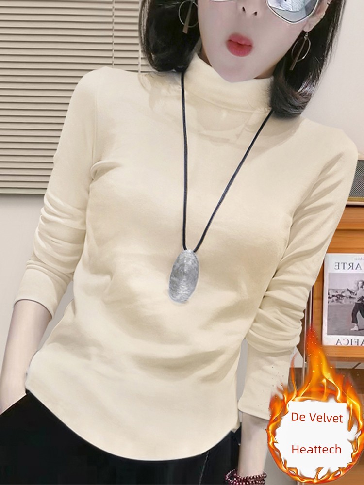 2025 Новинка Осень и Зима Дралон Утолщенная Heattech Рубашка с Полуворотником Женская Однотонная Внутренняя Одежда Приталенная с Длинным Рукавом Топ