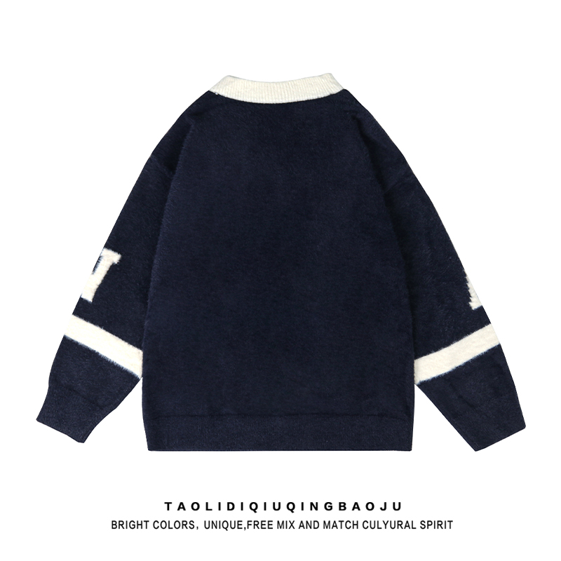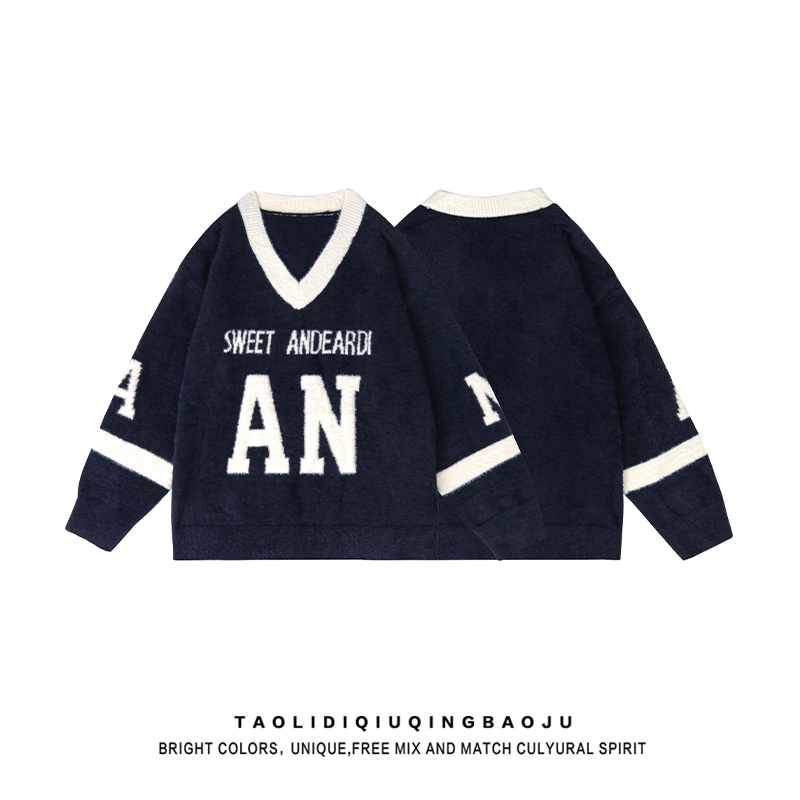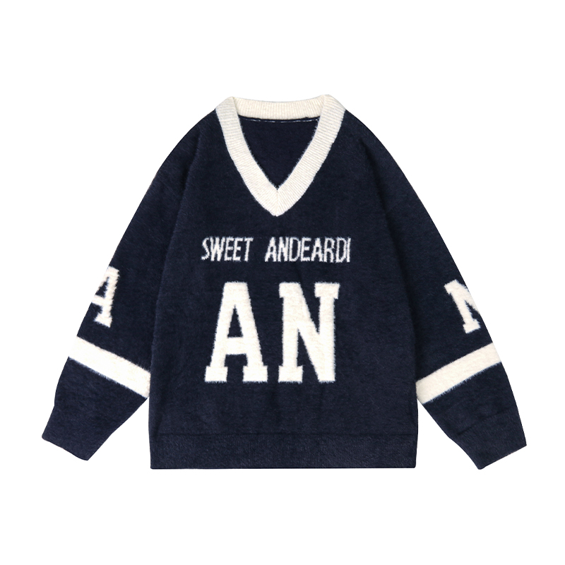 American Contrast Color Letter Jacquard Mohair Sweater Female Winter Comfortable Loose Lovers Wild V-neck Sweater