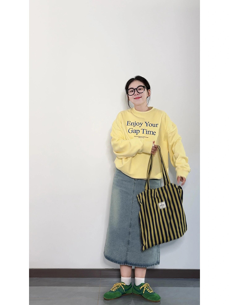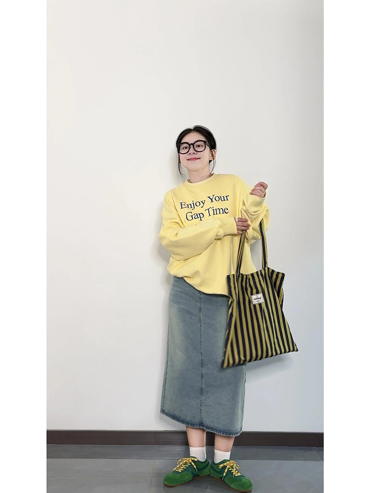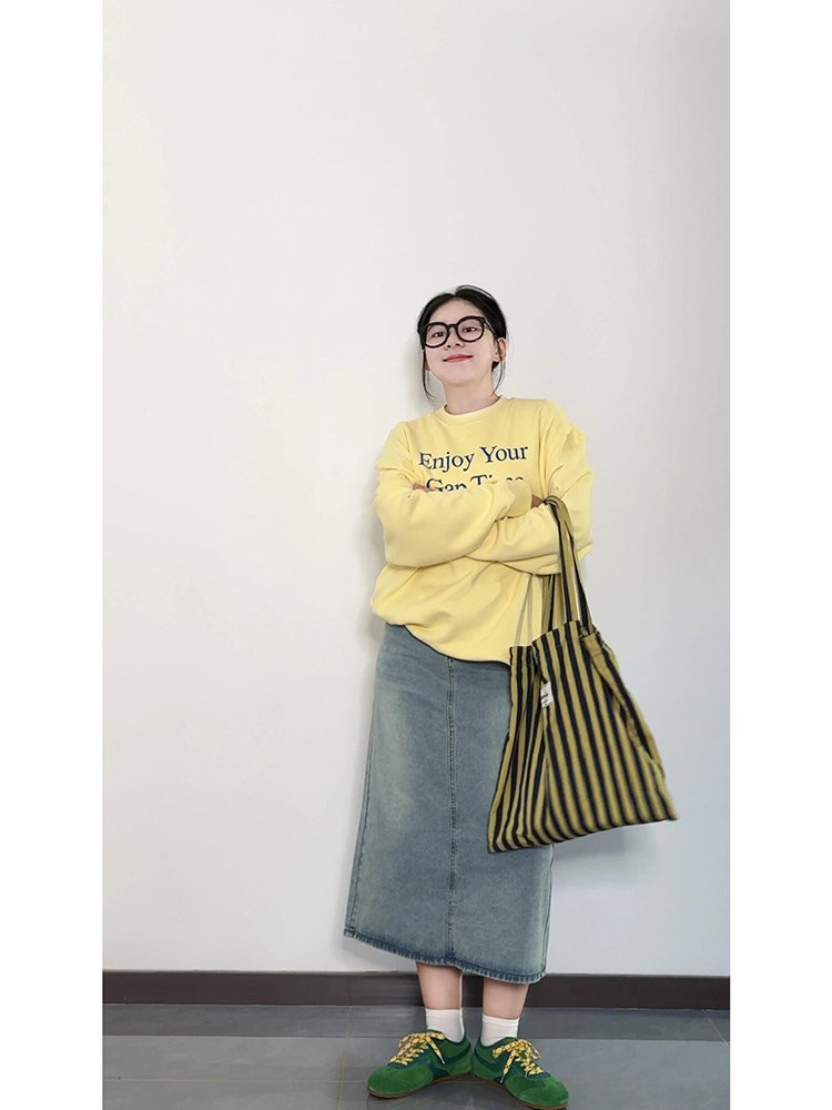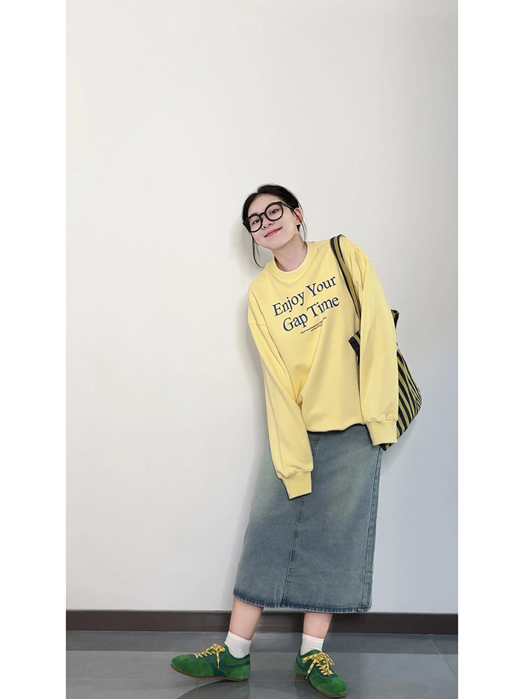 Американский Ретро Желтый Топ с Круглым Вырезом без Капюшона Женский Весна/Осень Маленький Свободный Корейский Стиль Ленивый Ветер Толстовка на Плечах