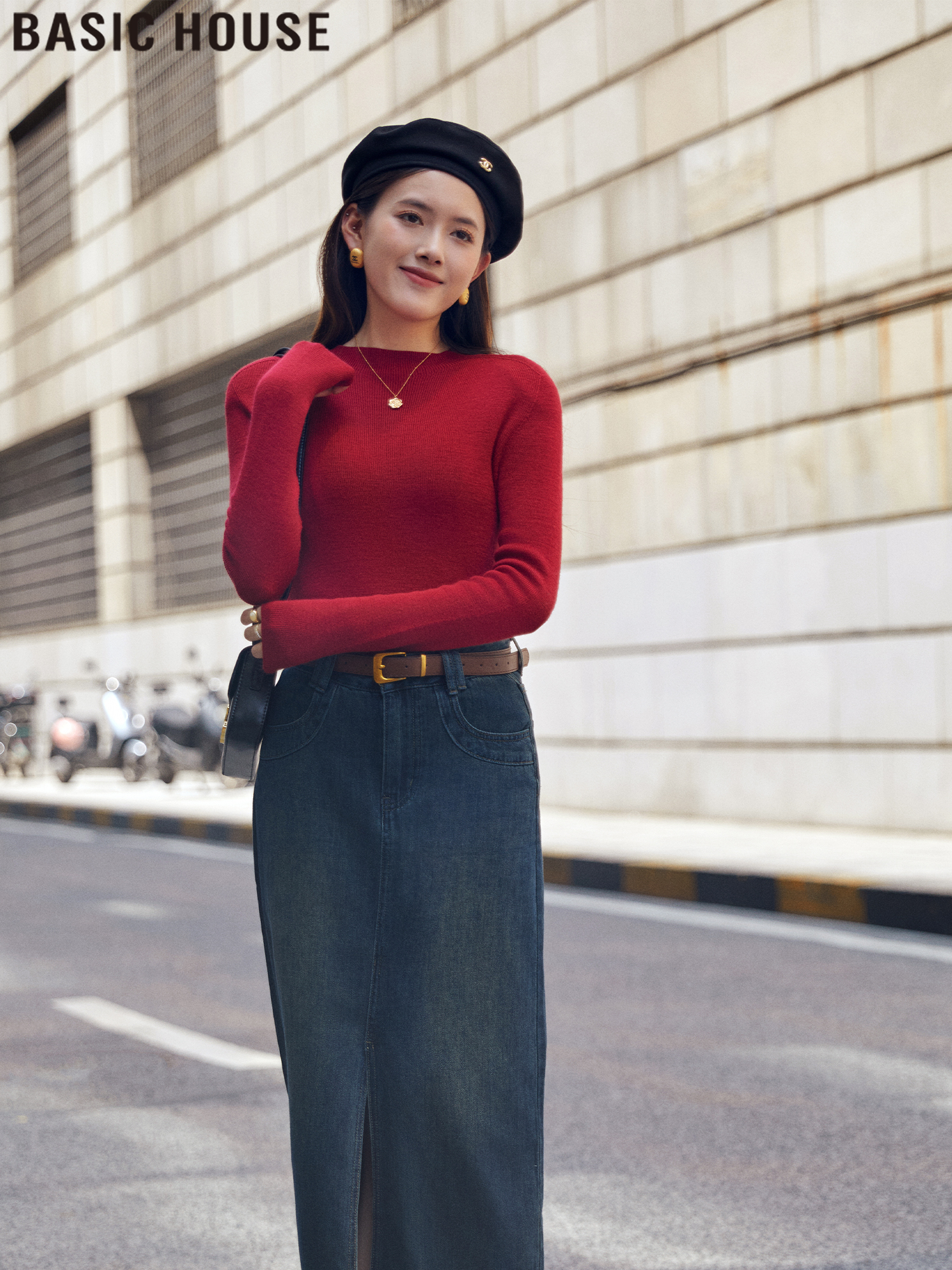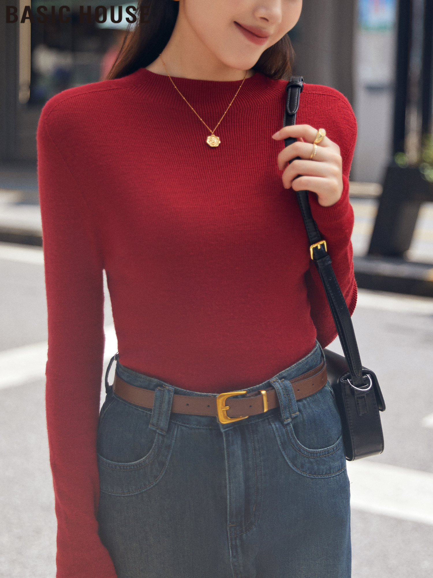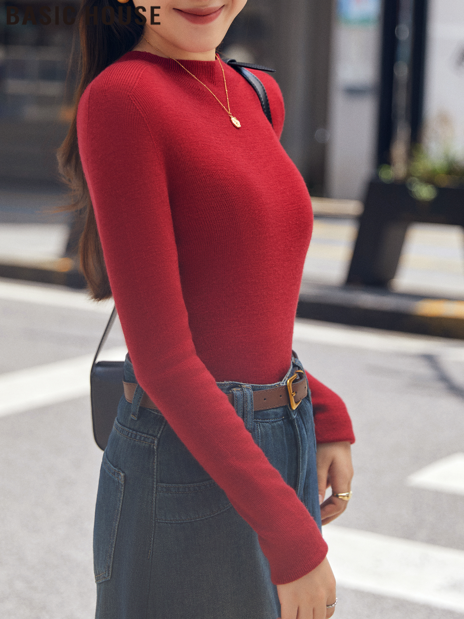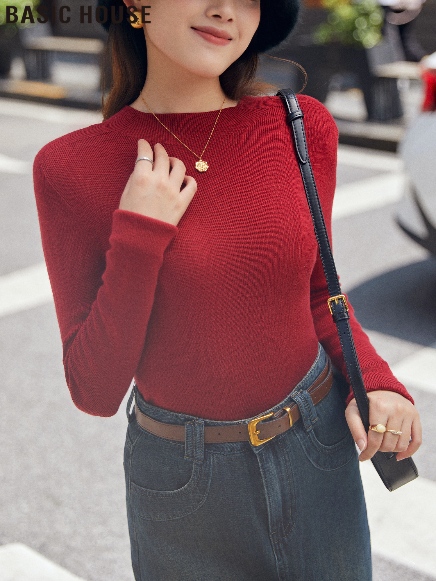Basic House/Baijiahao, агатово-красный, эластичный, приталенный, с круглым вырезом, базовый шерстяной трикотаж, женский