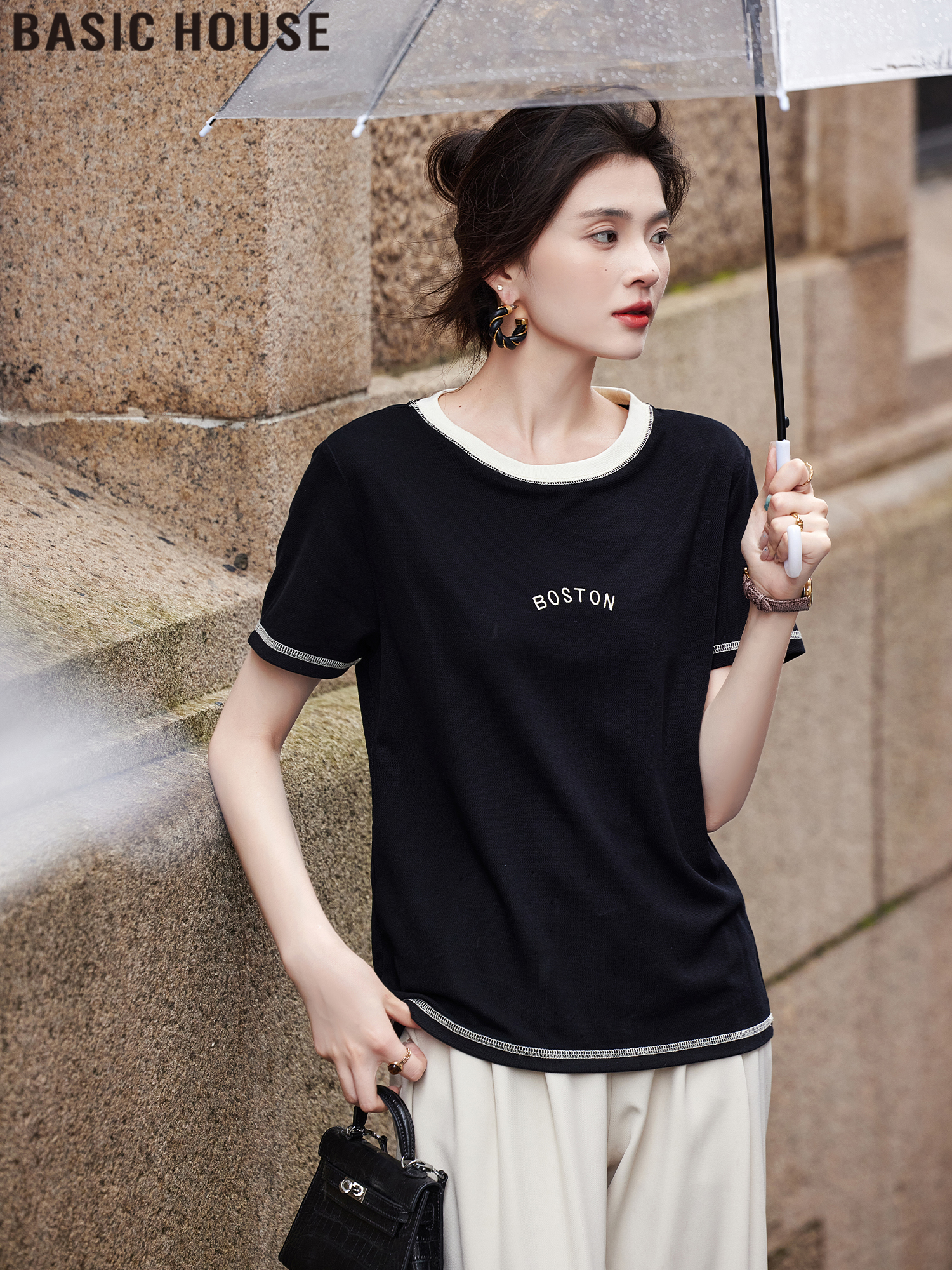 Basic House/Baijiahao Футболка с коротким рукавом и контрастным цветом, шириной плеч, свободная, с вышивкой, женская, новинка лета 2025
