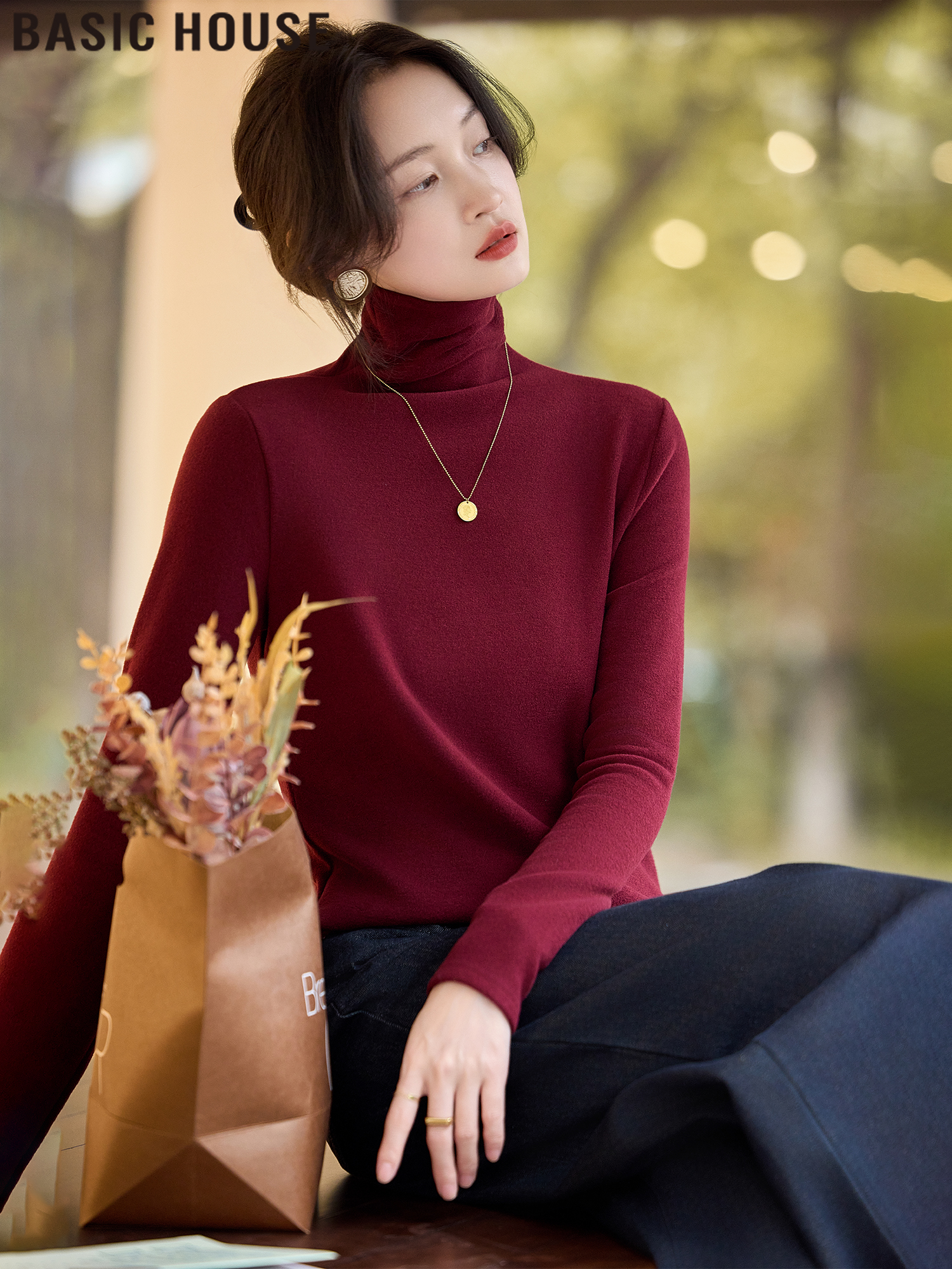 Базовый дом/Baijiahao Элегантная Анкела Красная рубашка с воротником-гольф, нижний слой, с длинным рукавом, футболка, женская весна