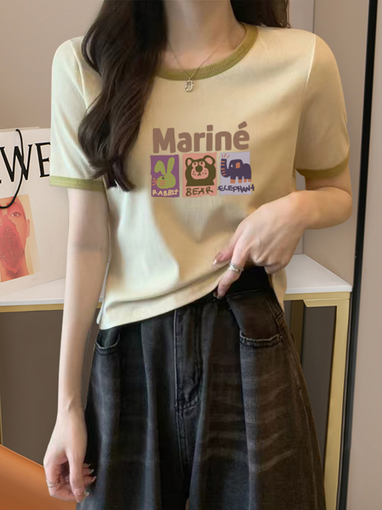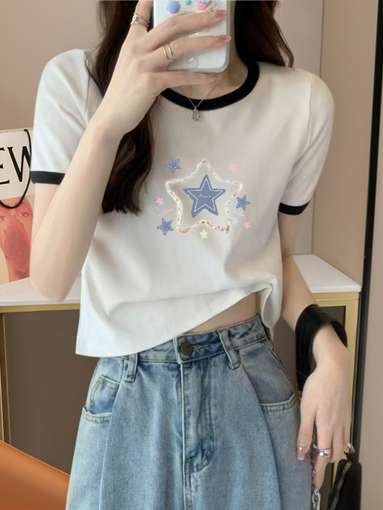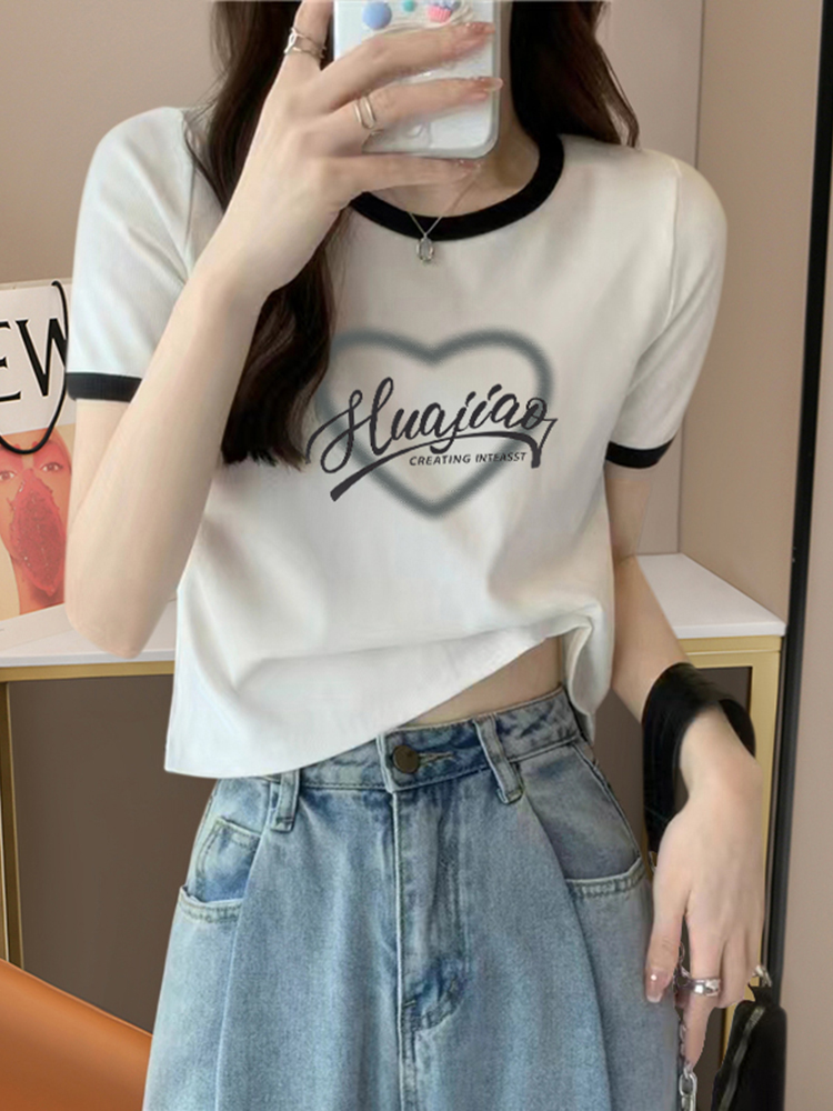 Контрастная стильная короткая футболка с рукавами на маленьком плече женская лето 2025 новое поступление маленький приталенный короткий топ мода