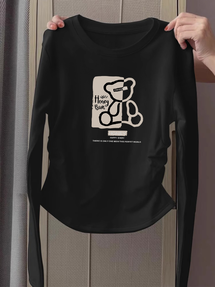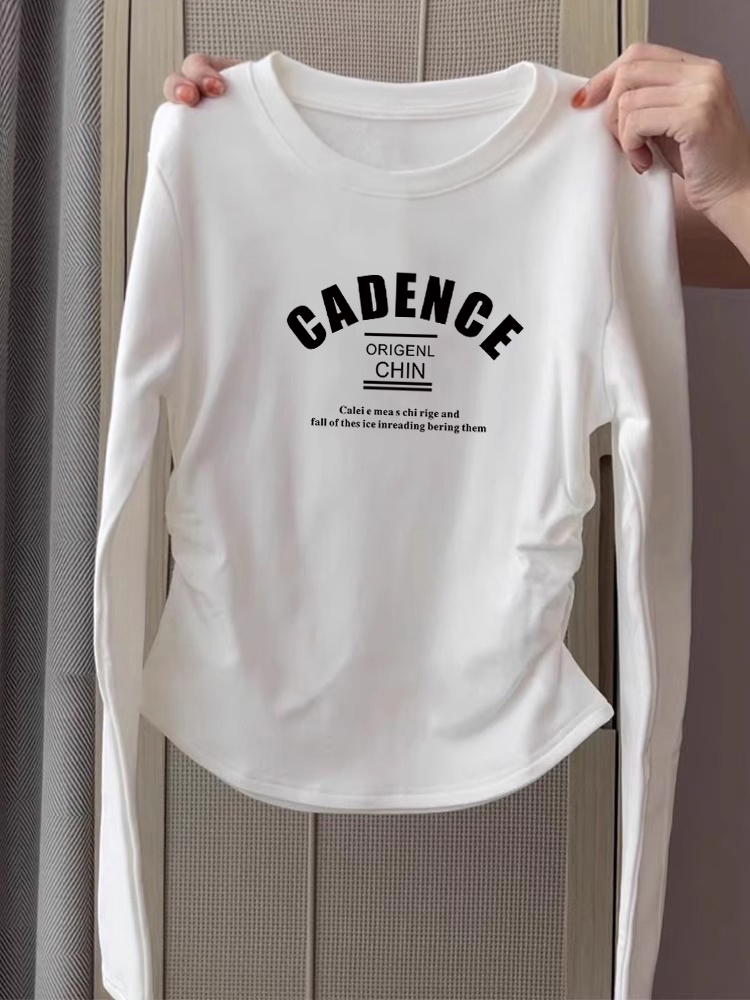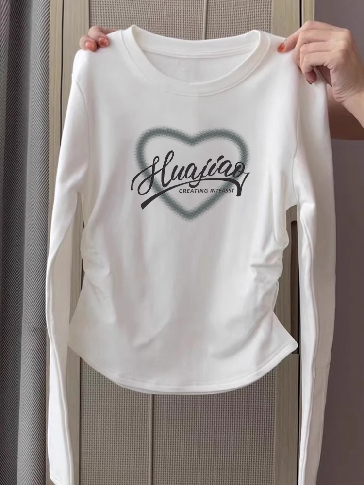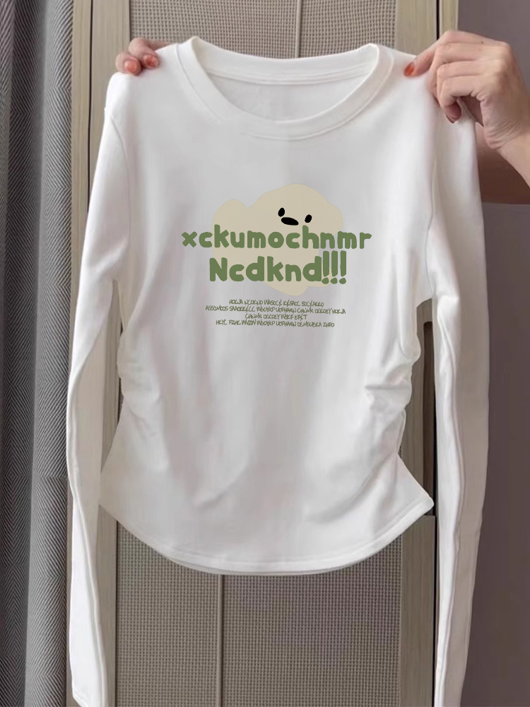 Хлопковая базовая рубашка женская весна-осень принт спущенное плечо круглый вырез длинный рукав футболка облегающая асимметричная короткая внутренняя одежда мода