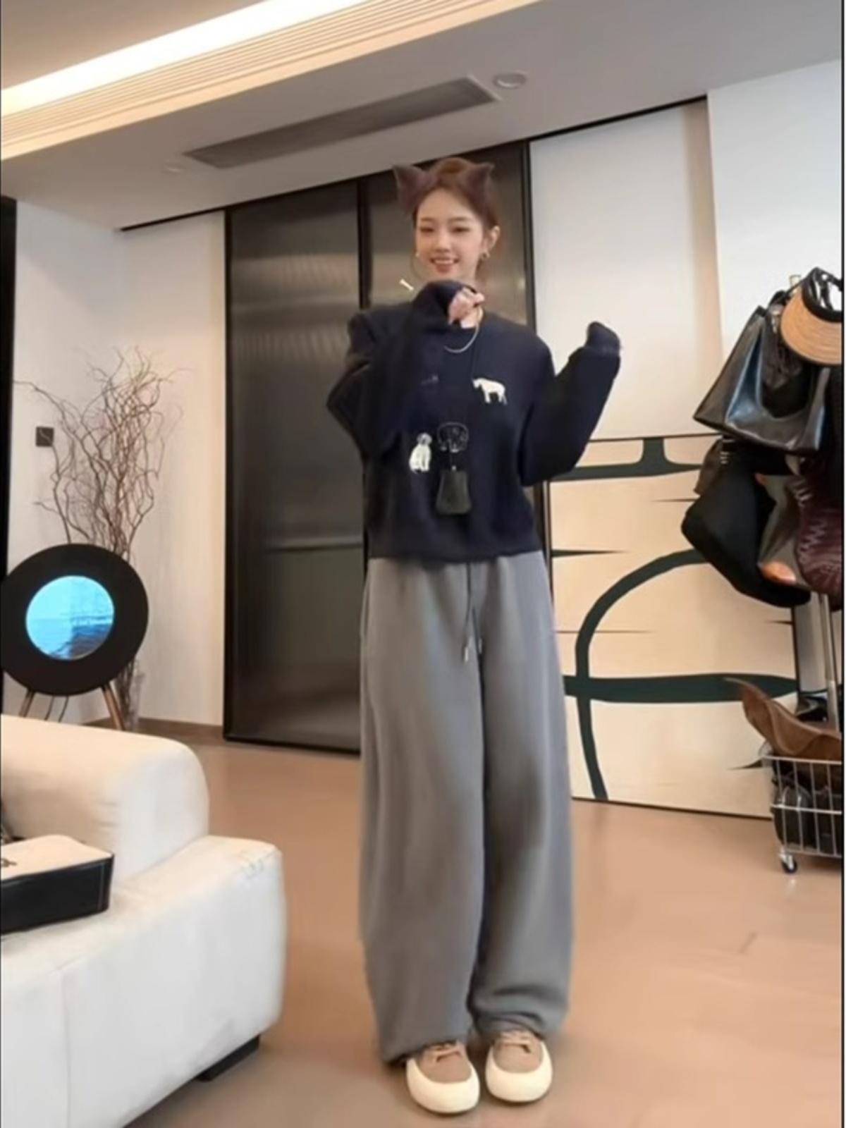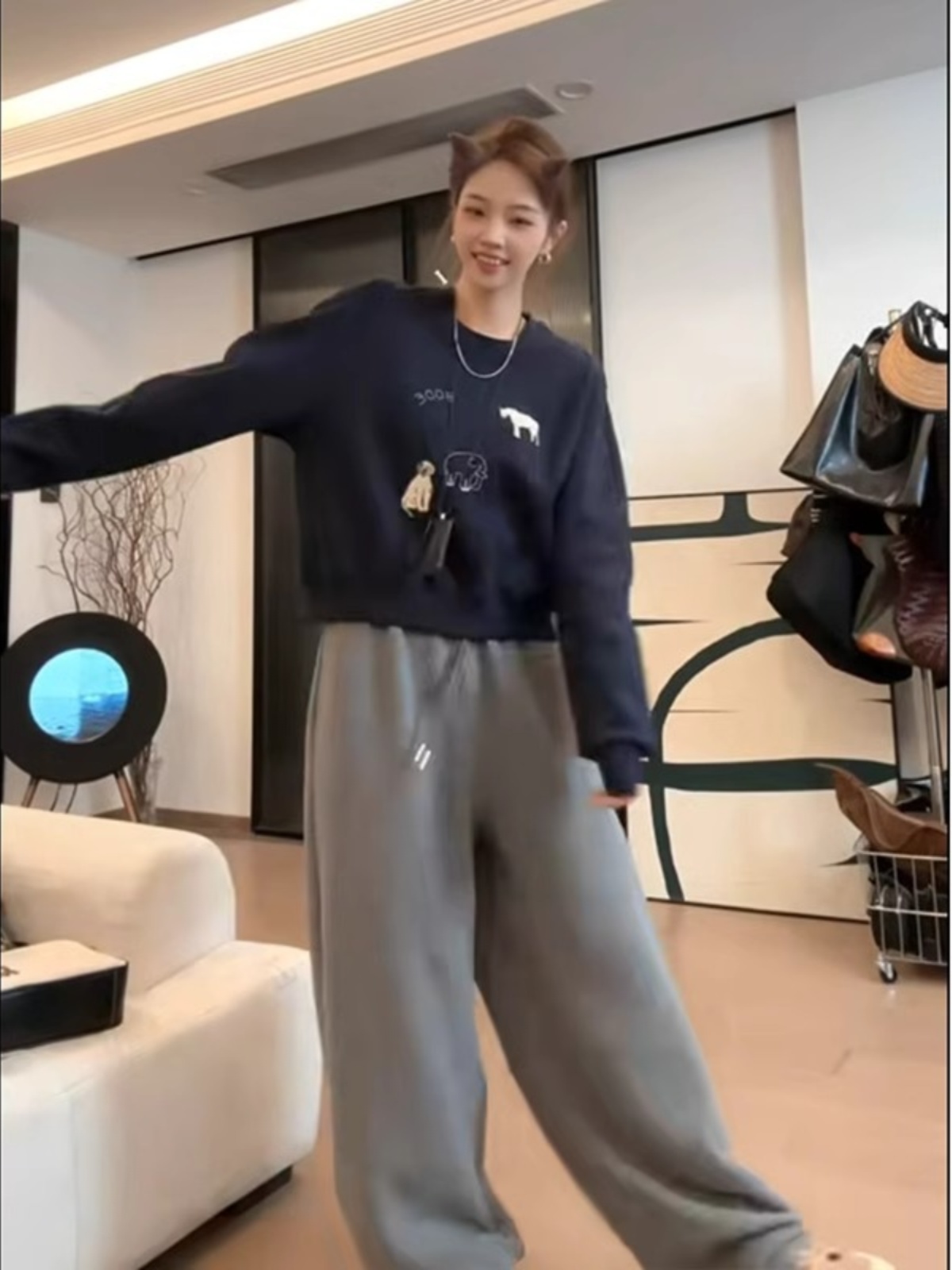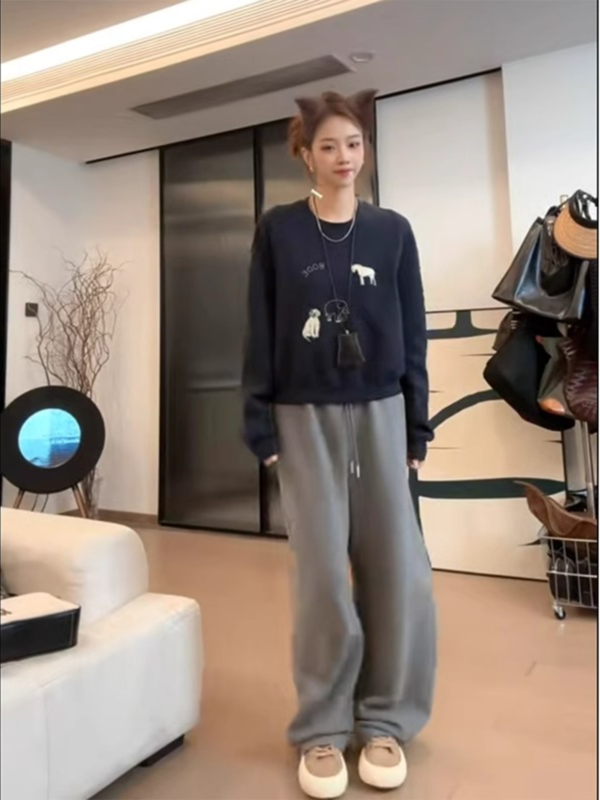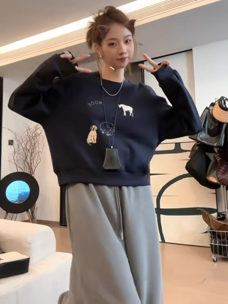 Европейские товары, темно-синий, трехмерный принт в стиле мультфильма, повседневный свитер с круглым вырезом, женский, ранняя осень 2025, новые поступления, антивозрастная модная одежда