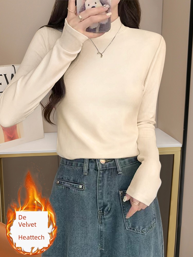 Женская нижняя рубашка с полувысоким воротником из дралона с флисовой подкладкой, утолщенная, облегающая, новинка 2025 года, женская осенняя и зимняя футболка с длинными рукавами