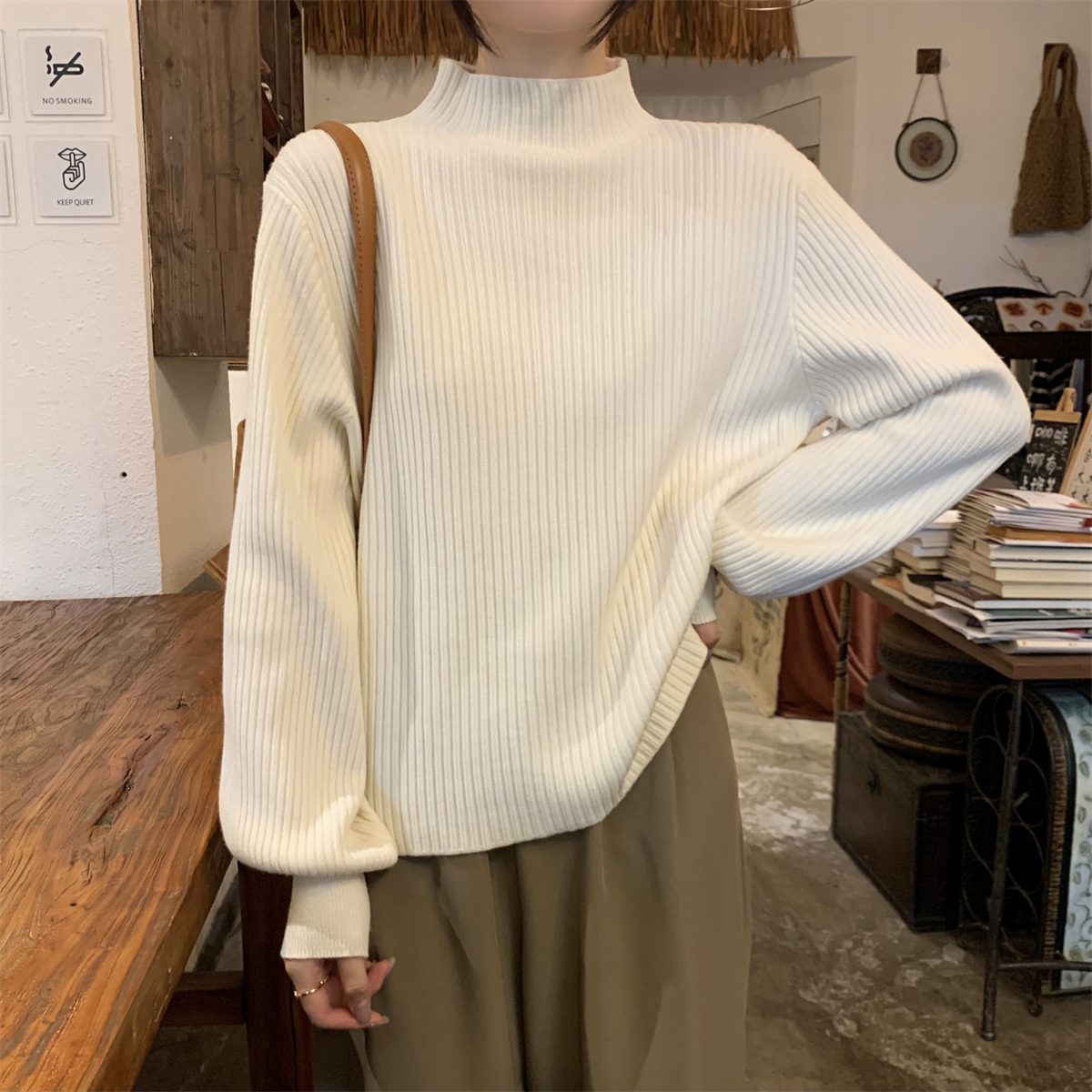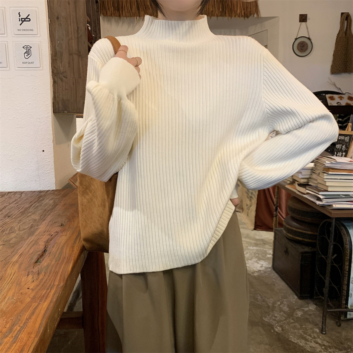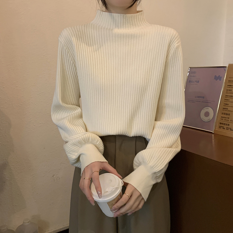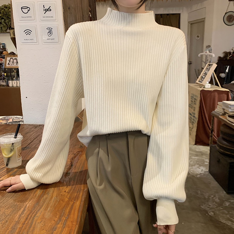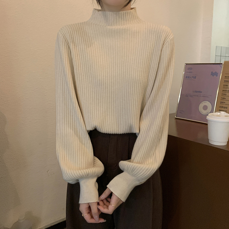 Японский ретро-свитер простого абрикосового цвета с воротником-стойкой, женский осенне-зимний свободный повседневный универсальный топ из клейкой пряжи