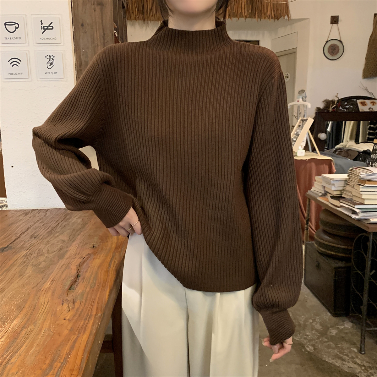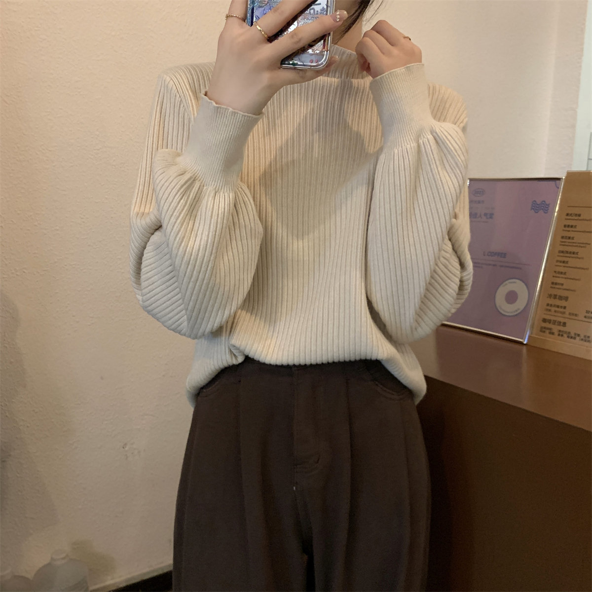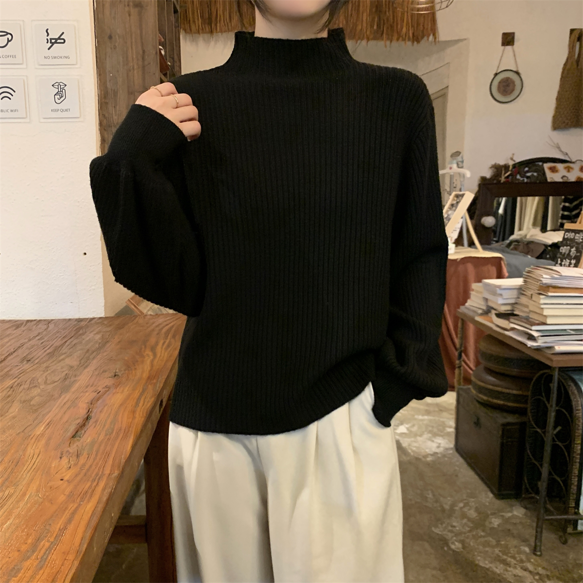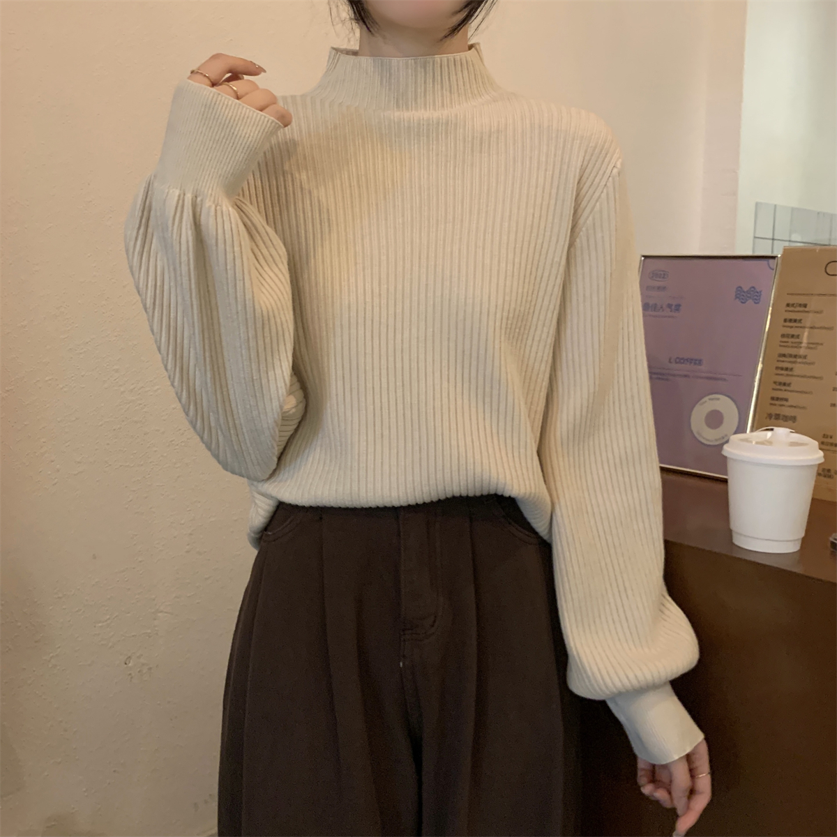 Японский ретро-свитер простого абрикосового цвета с воротником-стойкой, женский осенне-зимний свободный повседневный универсальный топ из клейкой пряжи