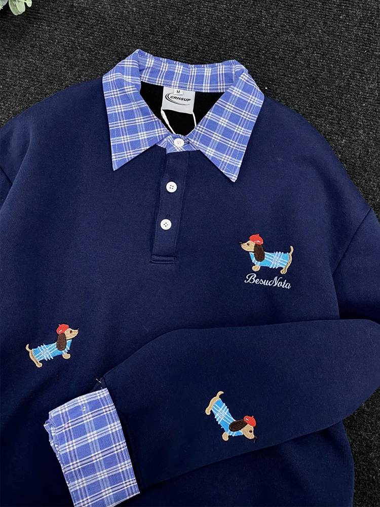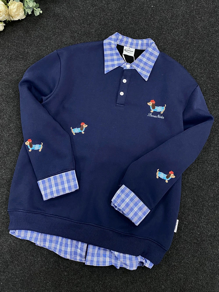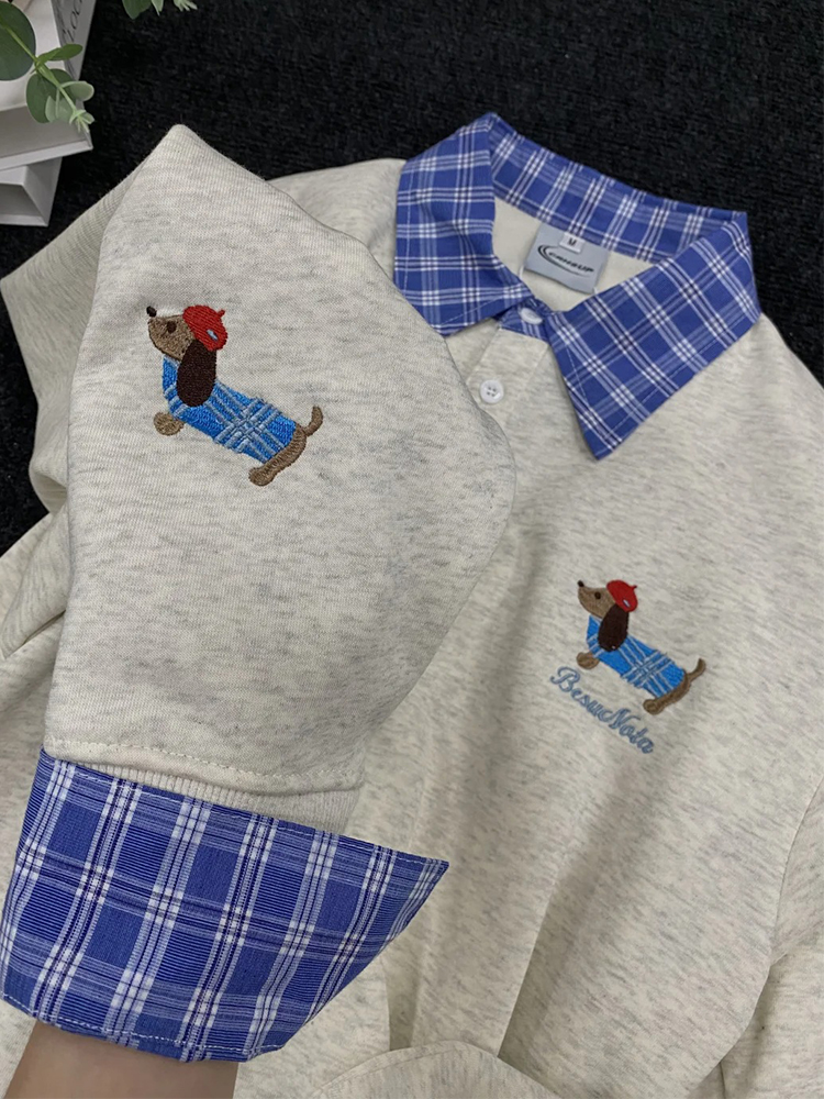 Свитер с воротником-поло и вышивкой щенка, женский, осенний, ленивый стиль, шикарный свободный парный пуловер, бархатная толстовка