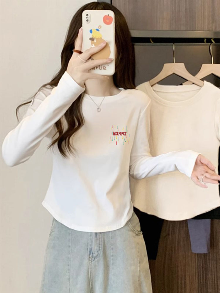 Весенне-осенняя футболка с длинным рукавом, женская новинка 2025 года, круглый вырез, западный стиль, молочно-белый топ, приталенный кроп-топ