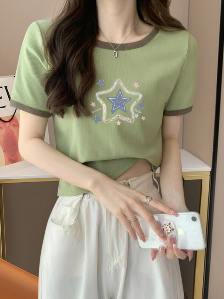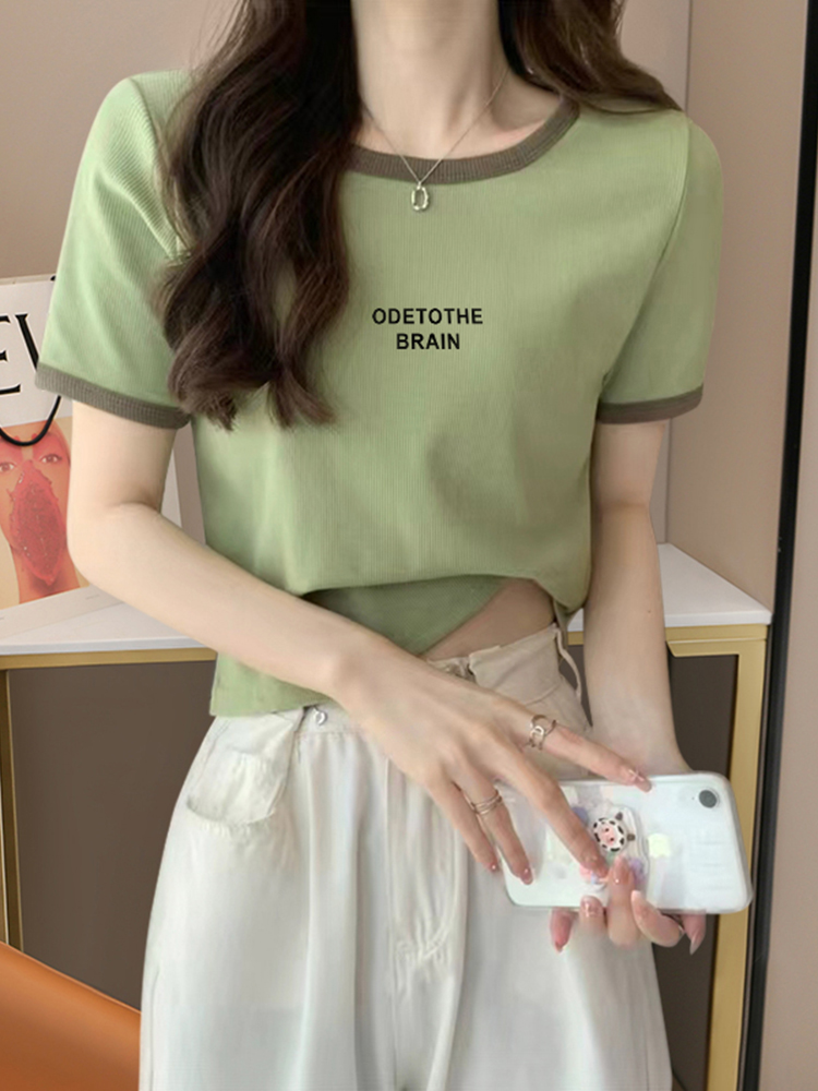 Весенне-летняя стильная универсальная хлопковая рубашка в западном стиле, короткая, приталенная, новинка, короткий рукав с контрастным цветом, женская футболка