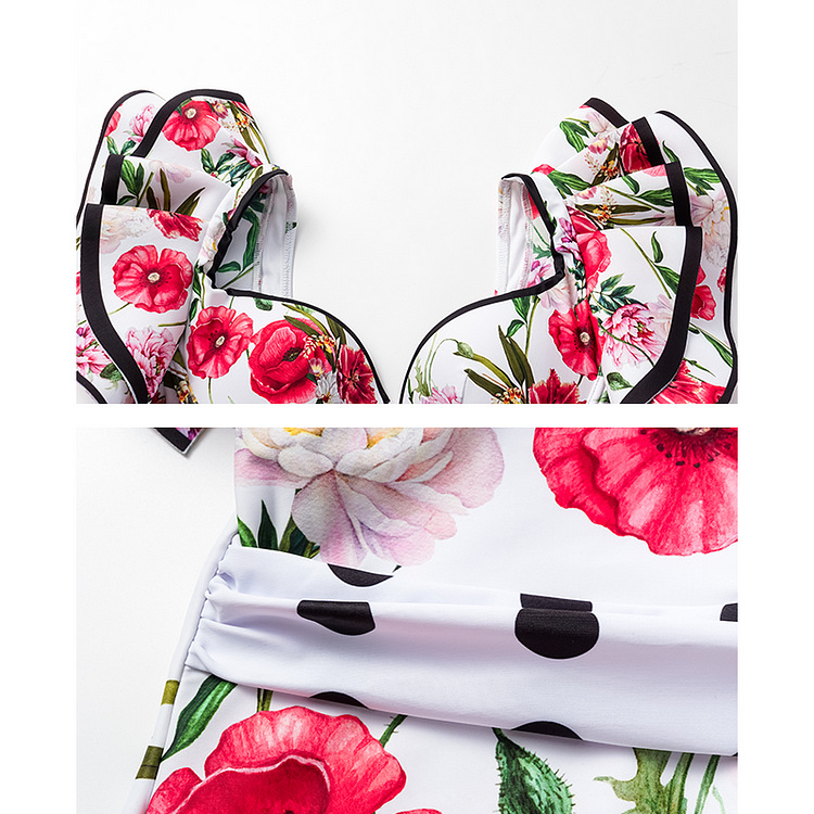 This stylish swimsuit set features a vibrant floral print on soft chiffon polyester. The elegant one-piece design comes with a matching skirt, perfect for a chic beach look. Ideal for summer outings, this swimsuit offers both comfort and style, making you stand out effortlessly.