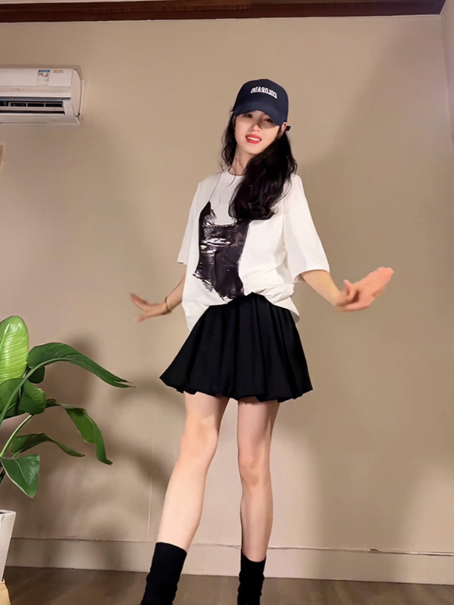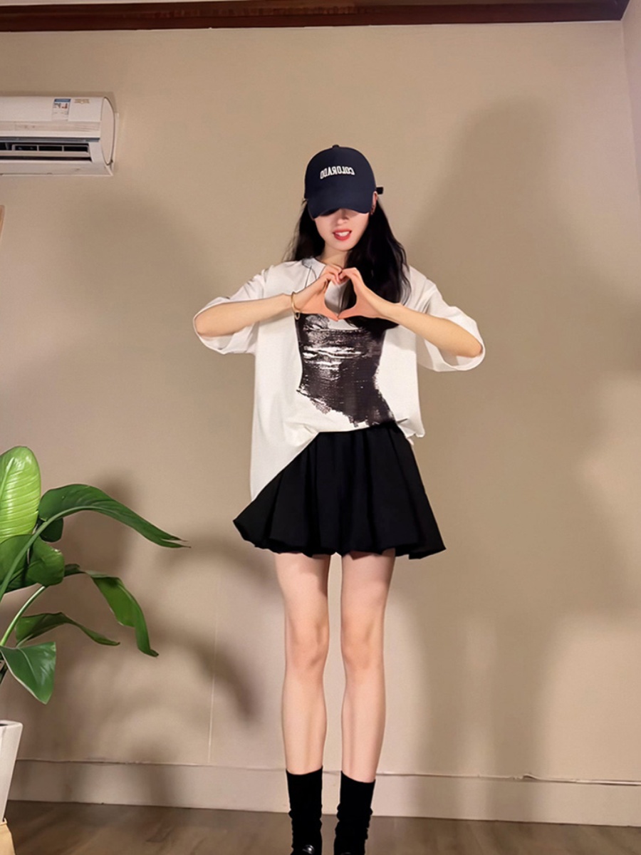 美式复古落肩短袖女夏季新款印花性感气质圆领T恤宽松百搭上衣潮