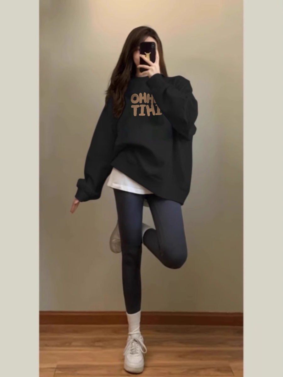 黑色连帽卫衣 女春秋2025新款宽松长袖上衣 时尚圆领Oversize外套 女