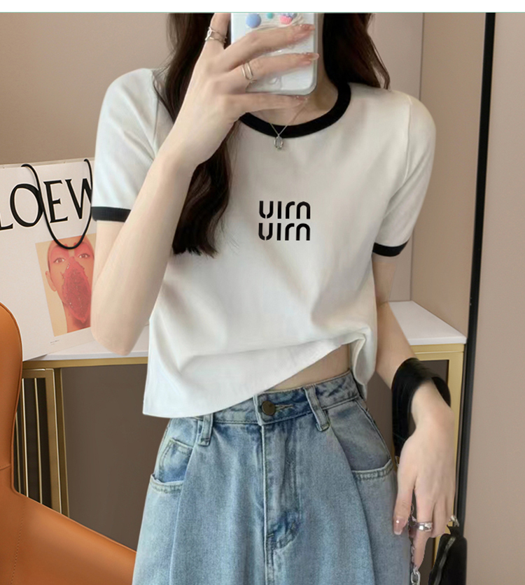 纯棉短袖T恤 女士2025夏季新款西装风修身显瘦百搭短款圆领撞色Ins风