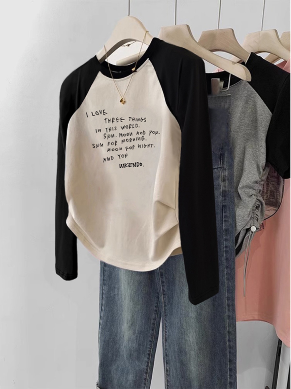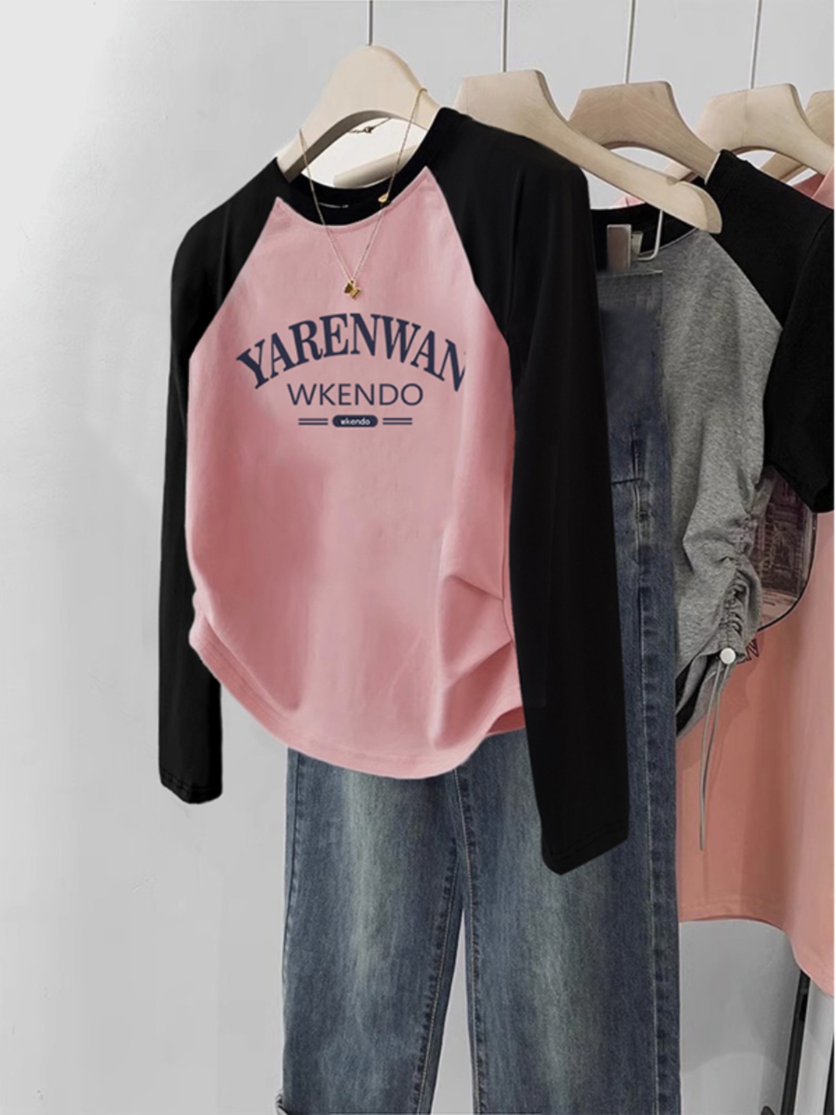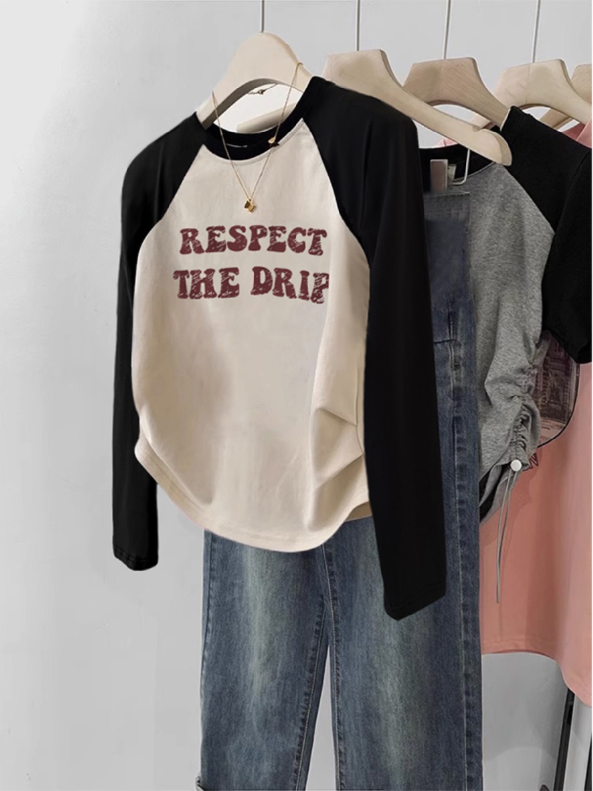 T恤 加大码 2025 春秋新款 设计感 小众风格 插肩长袖 美式复古 修身短款上衣 服装