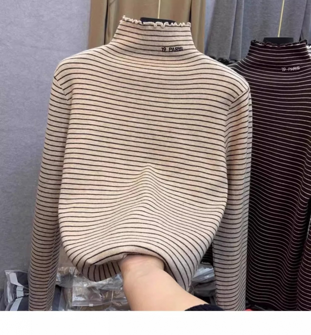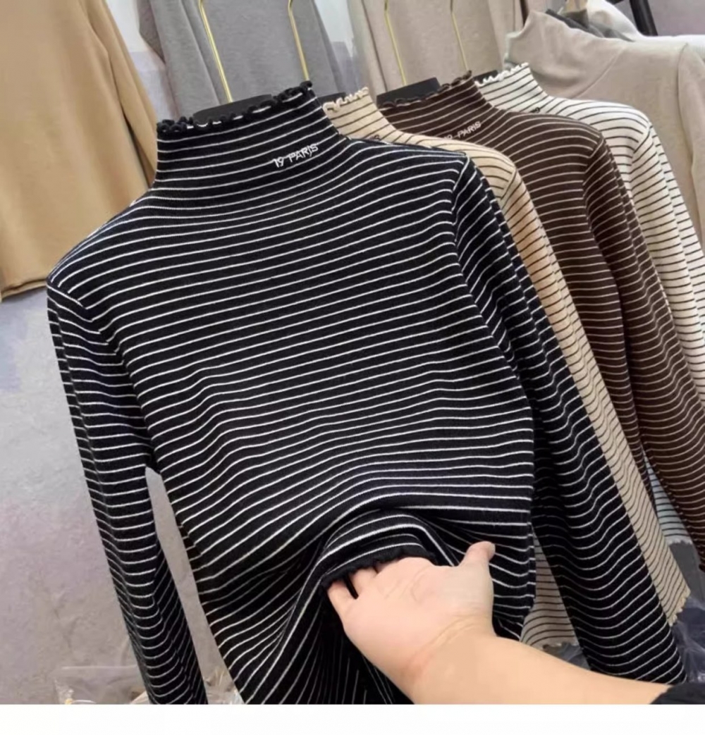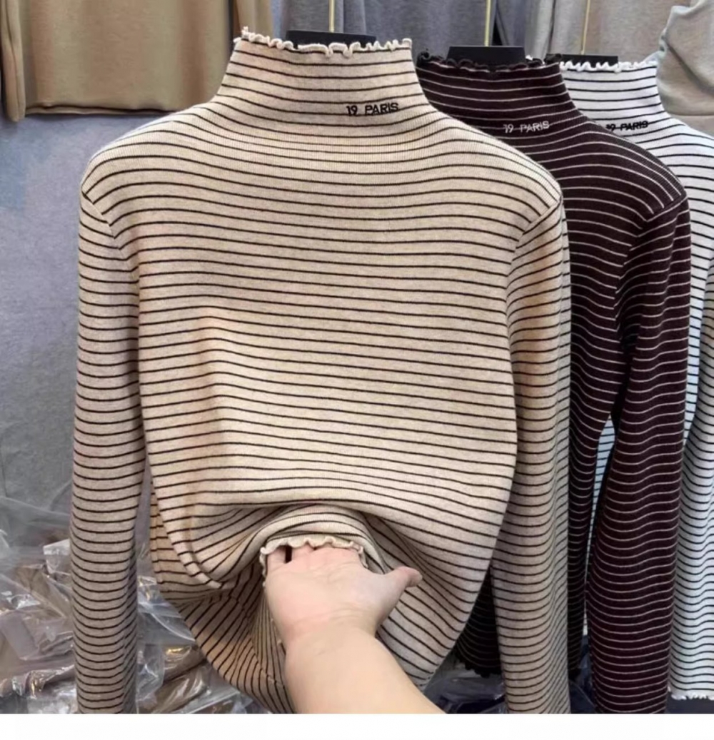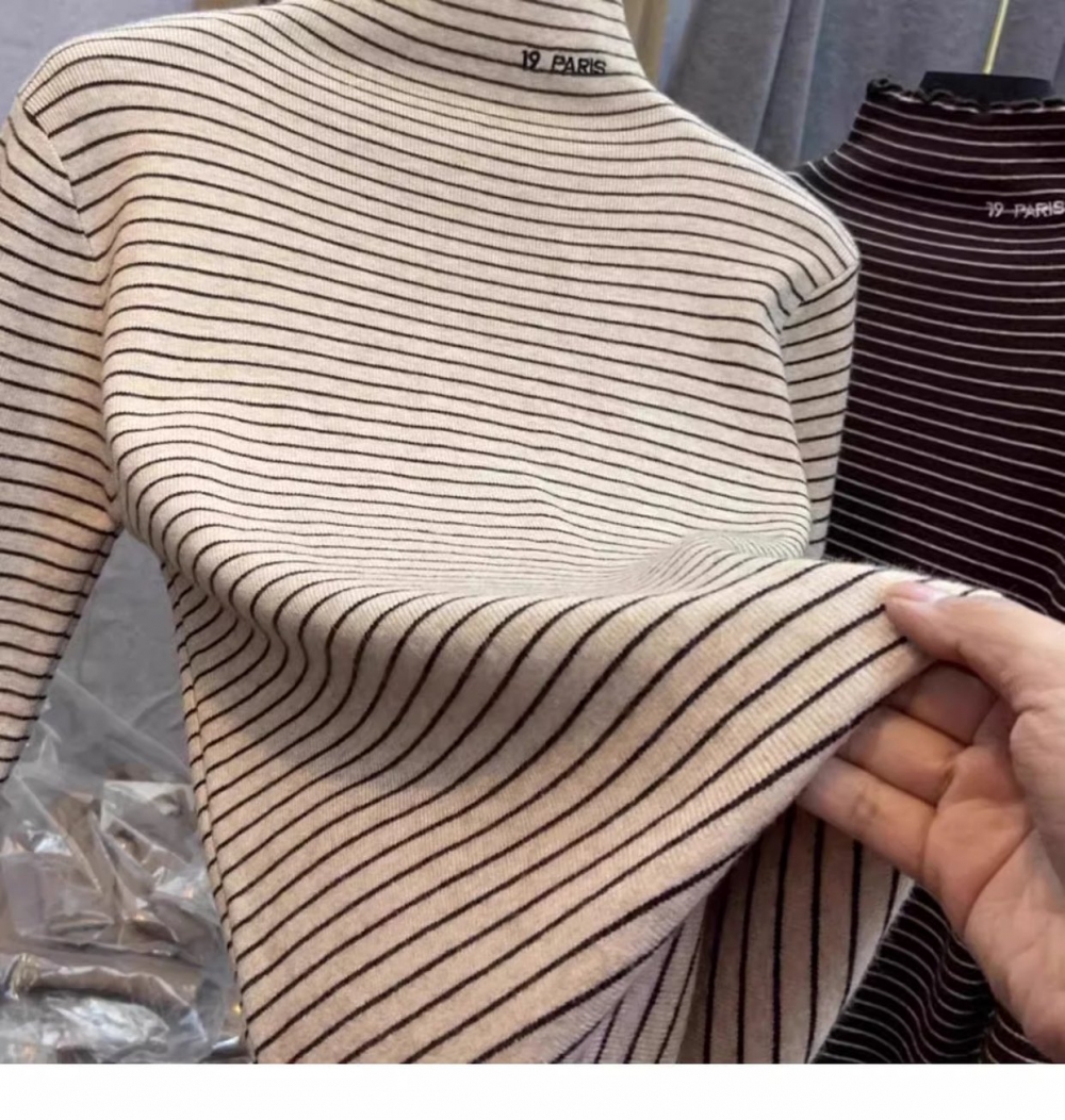 秋冬新款女士条纹加绒修身打底衫