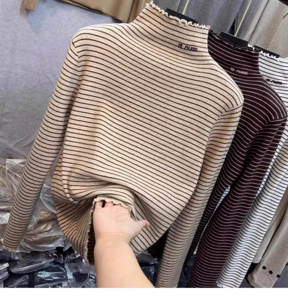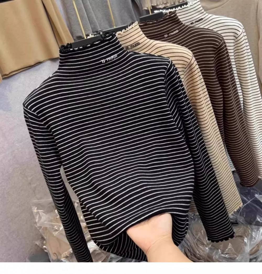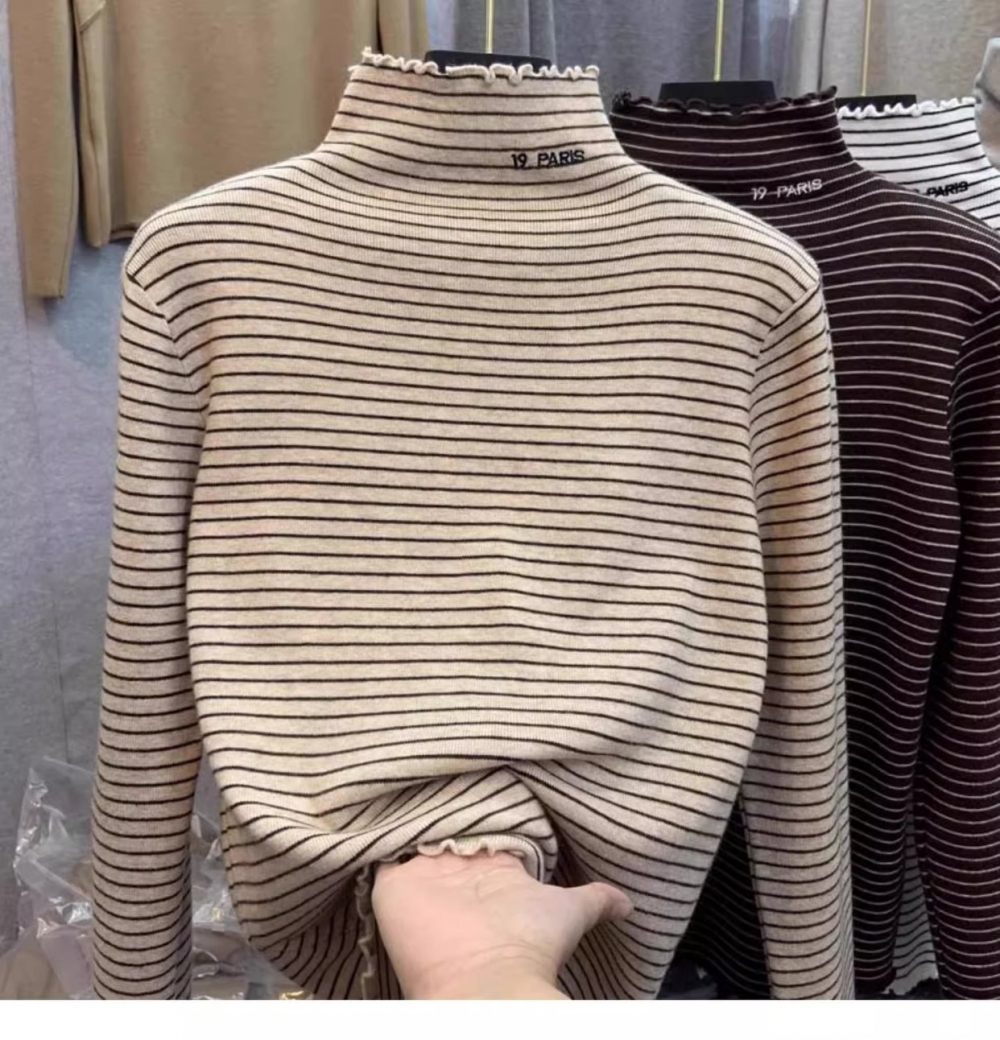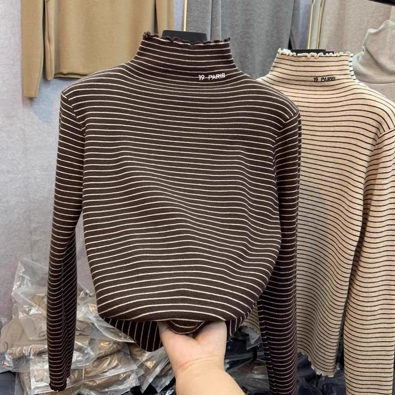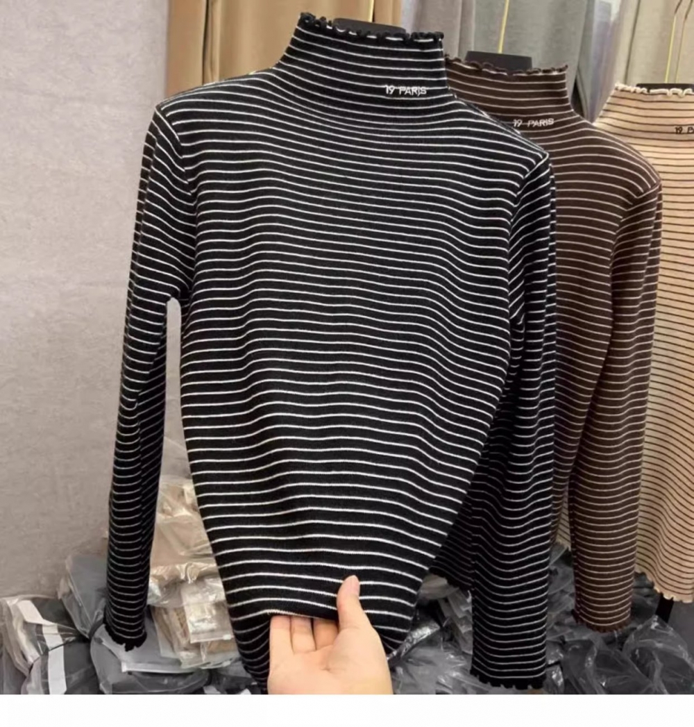 秋冬新款女士条纹加绒修身打底衫