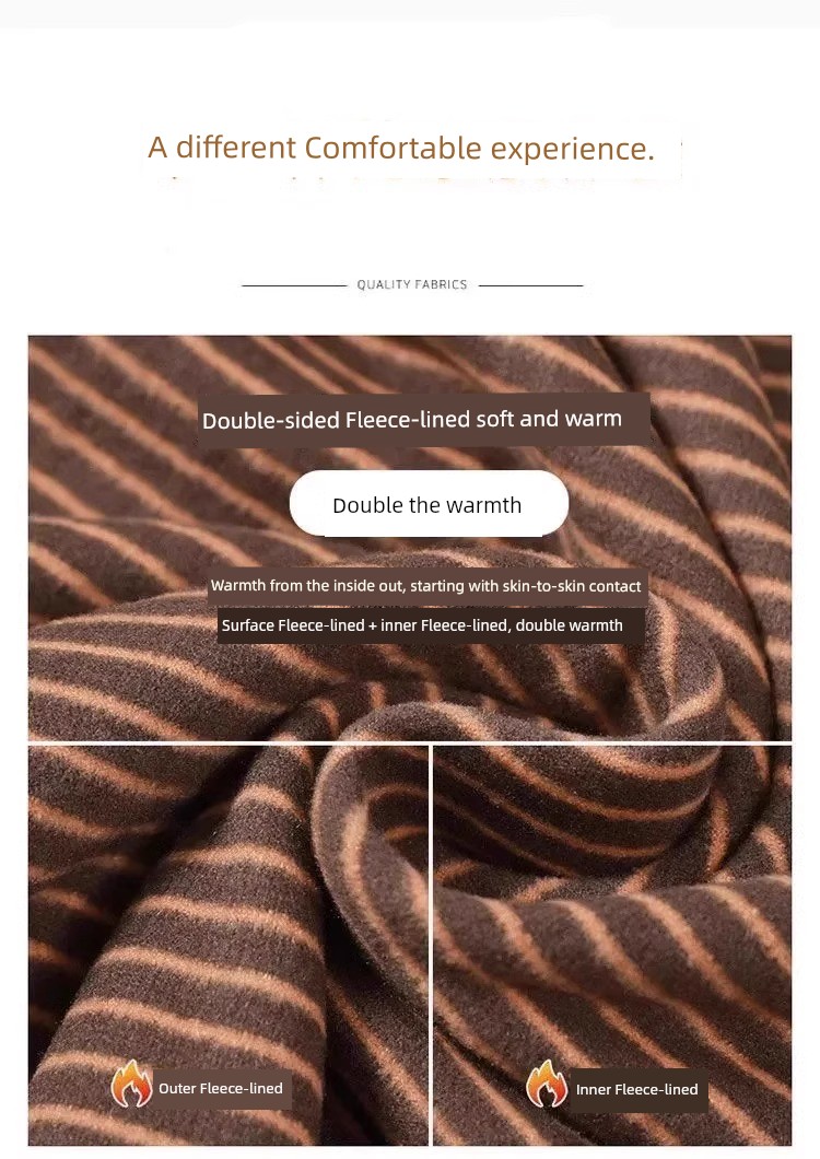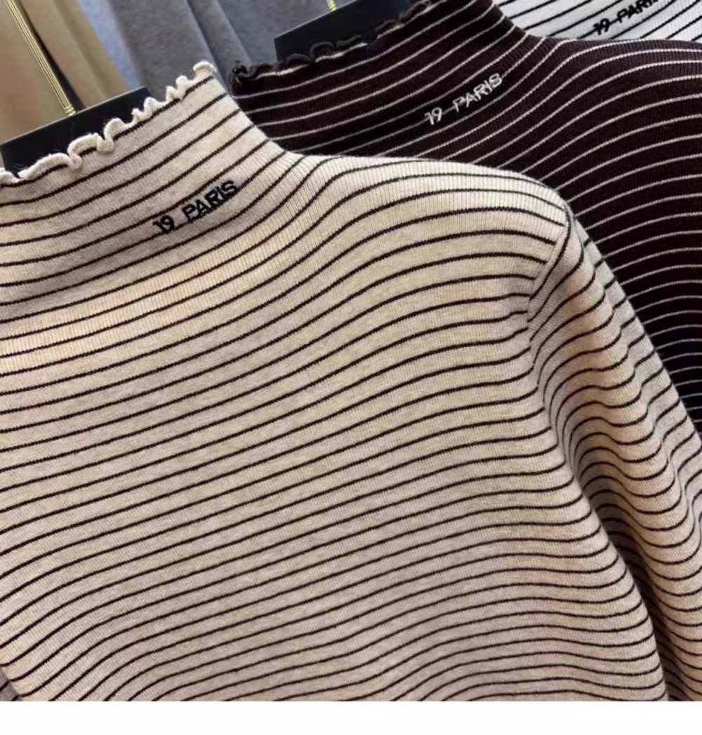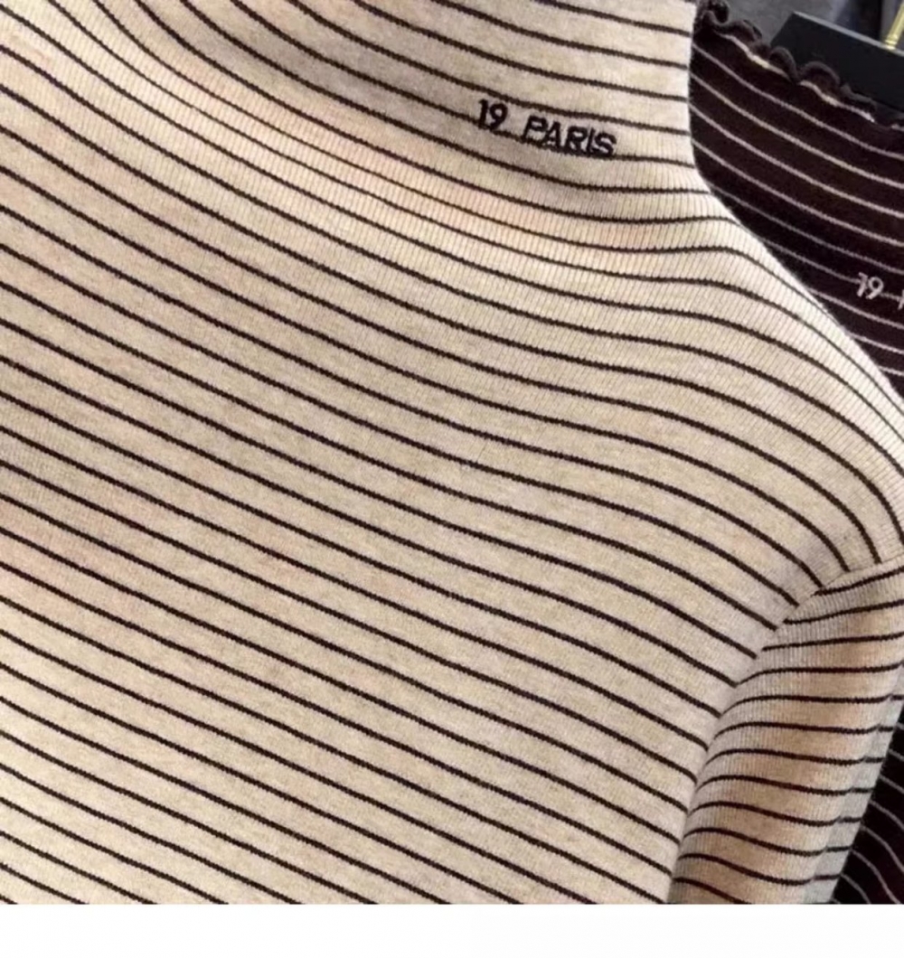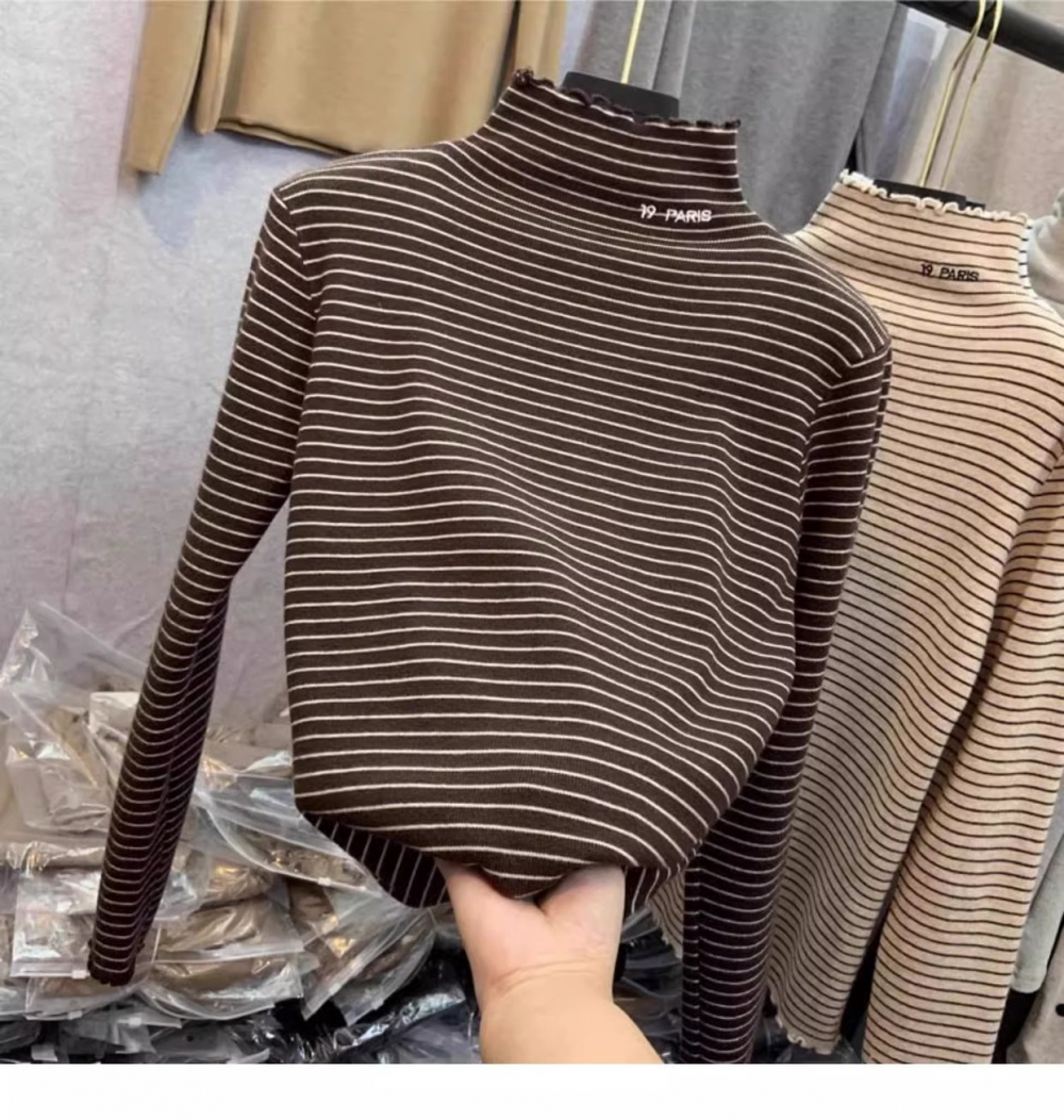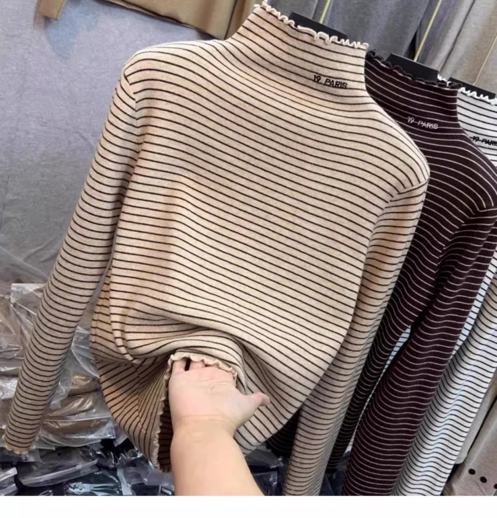 秋冬新款女士条纹加绒修身打底衫