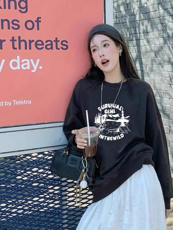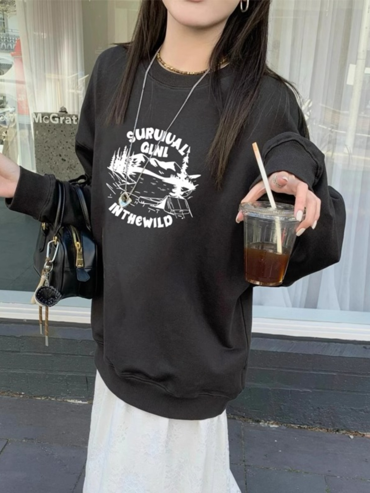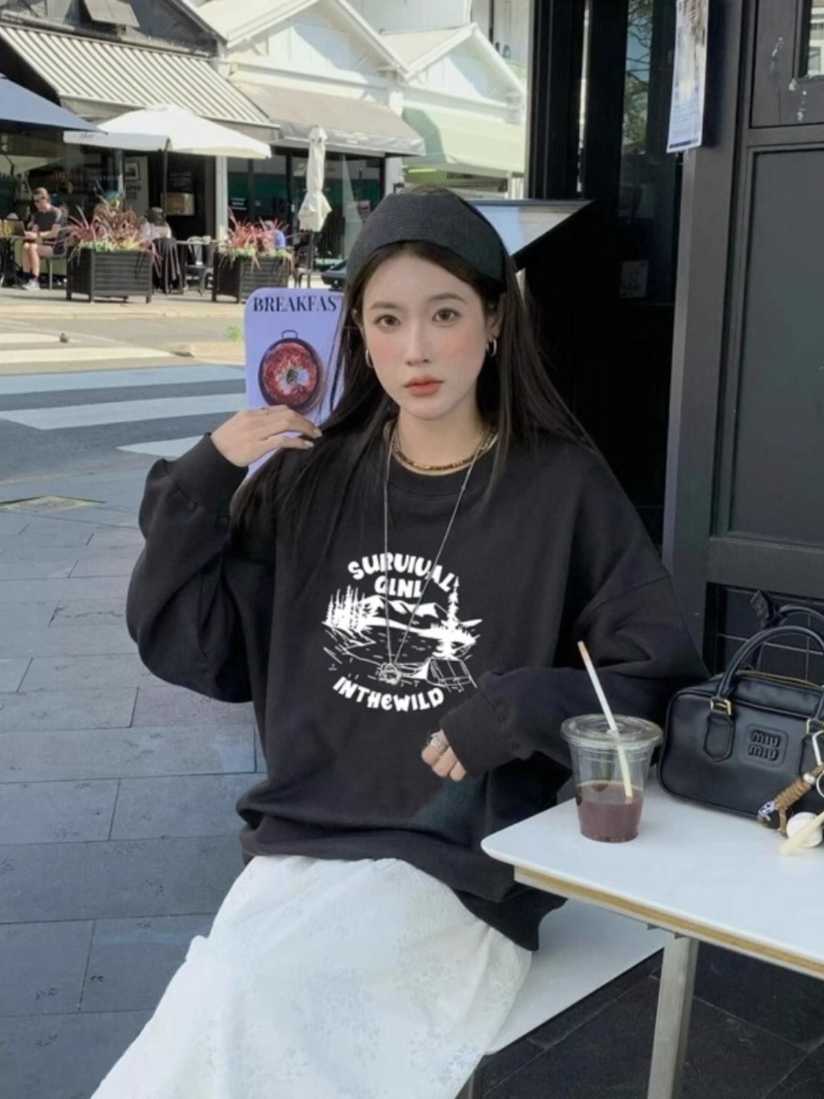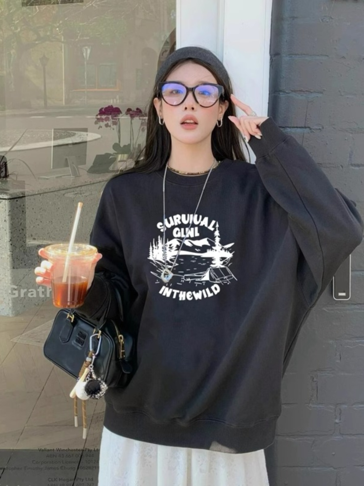 American Retro Black plus Velvet Sweatshirt Women's Spring & Fall New Design Sense Loose Casual Oversize round Neck Tops