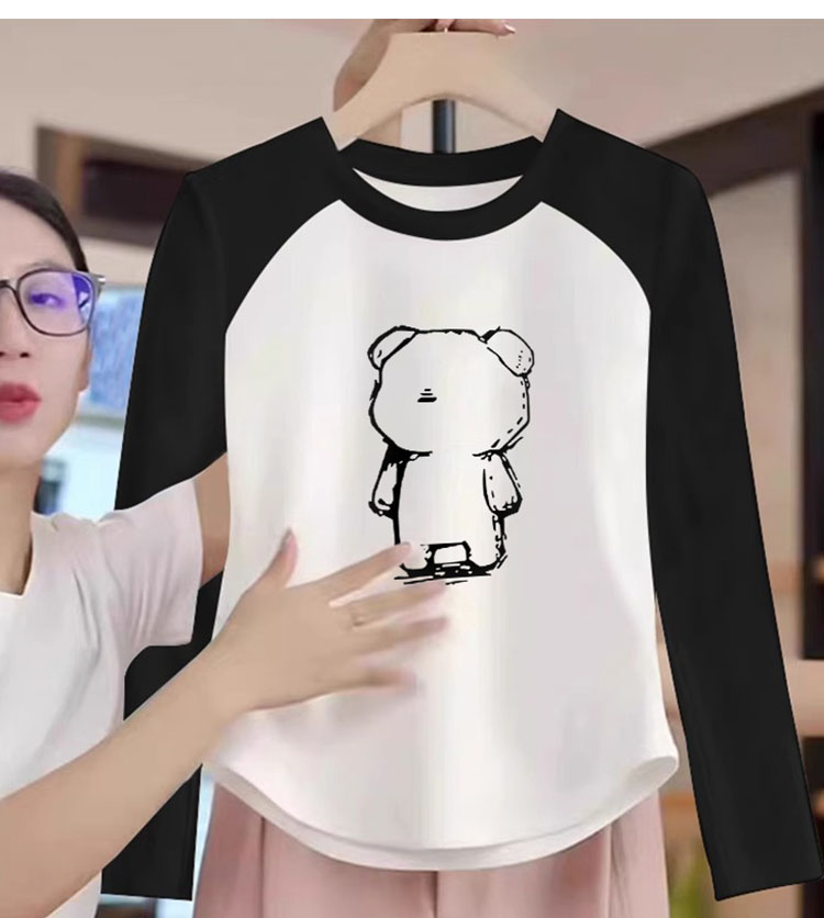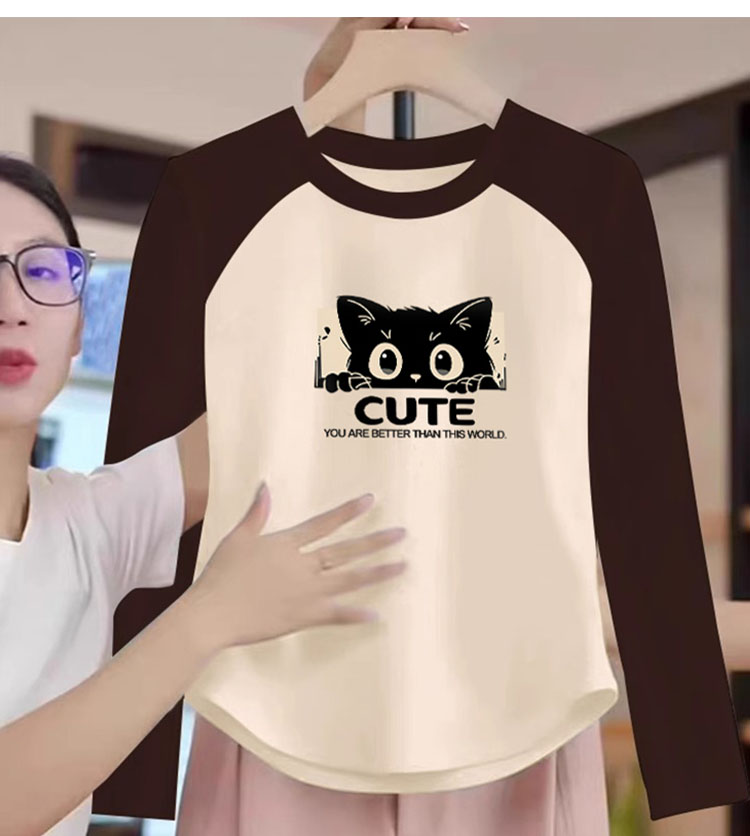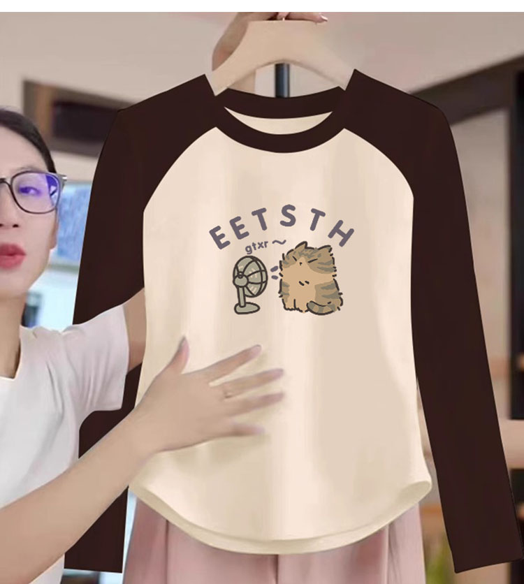 Contrast Color Raglan Long Sleeves T-shirt Women's Clothing Spring & Fall New Arrival Western Style Fashion Slim Looking Short Inner Wear Curved Hem Tops