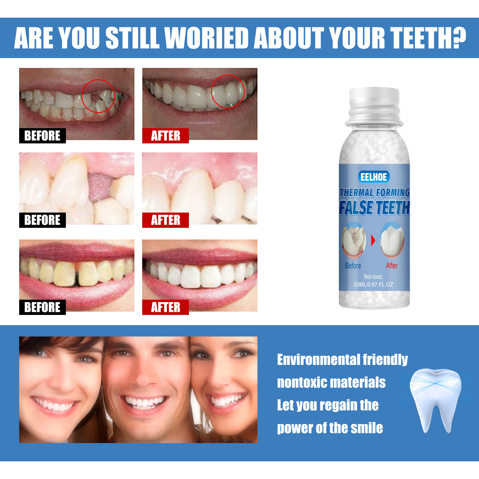 我们的可塑形牙胶含有PE。它可以让你的牙齿变得亮白,增加个人自信感。它的使用方法很简单:1.根据缺牙的大小(12粒,多不重要)把它放在滚烫的热水里;2.用勺子搅拌几次,材料就会融合在一起。就像橡胶泥一样,它可以随意塑造。3.大约一分钟后,白色颗粒变成半透明。你可以塑造牙齿。额外的材料可以帮助固定相邻牙齿的后部。4.在室温下冷却后,材料变硬。你可以把它戴在缺失的牙齿上(用冷水冲洗以加速冷却);5.如果义齿有指纹,成型后可用细砂纸稍加打磨。使牙缝避免灰尘和细菌,适合各种场合。