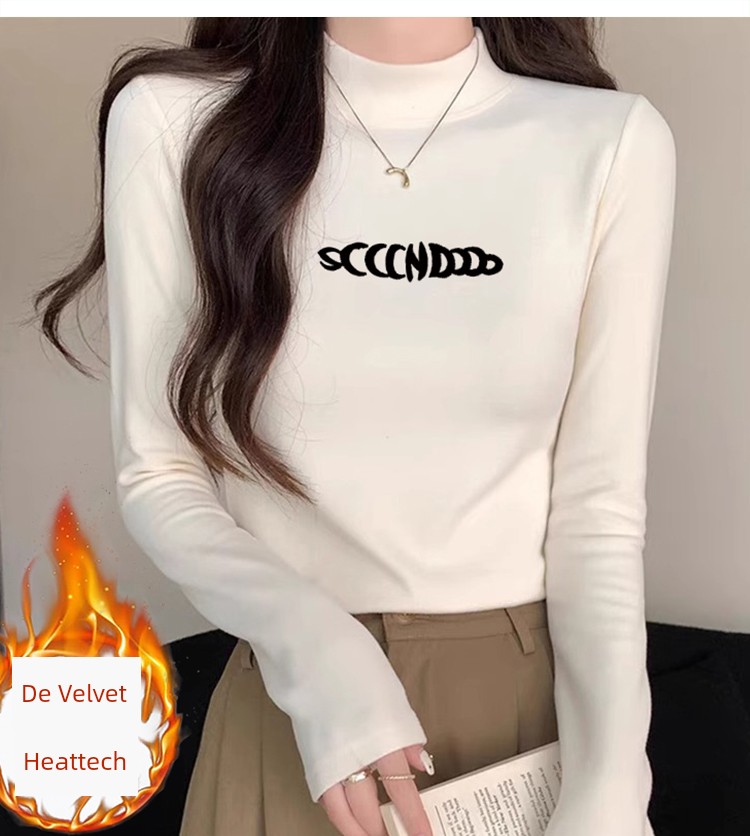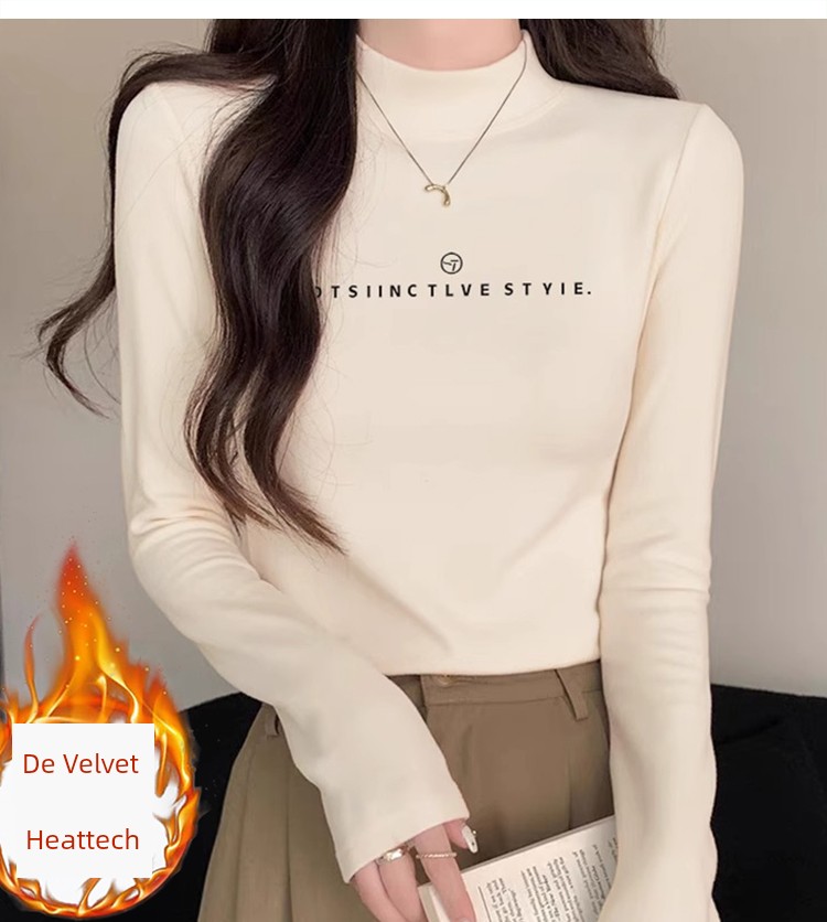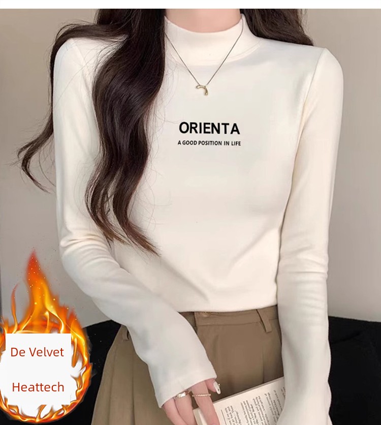 Half Turtleneck Bottoming Shirt Women's Autumn and Winter Clothing Dralon Thickened Long Sleeves T-Shirt Fleece Lined Sanded Middle Collar Inner Wear Blouse Isn Fashion