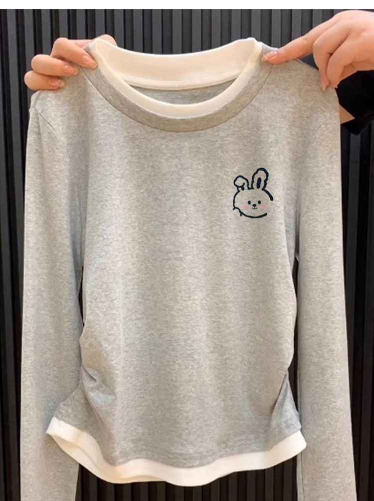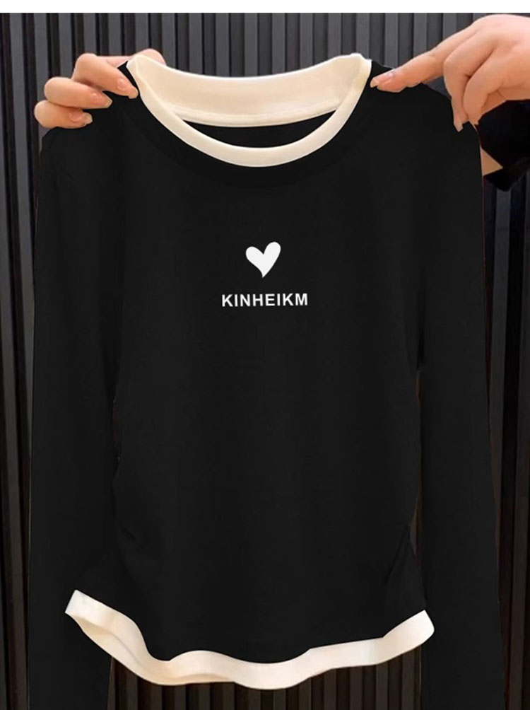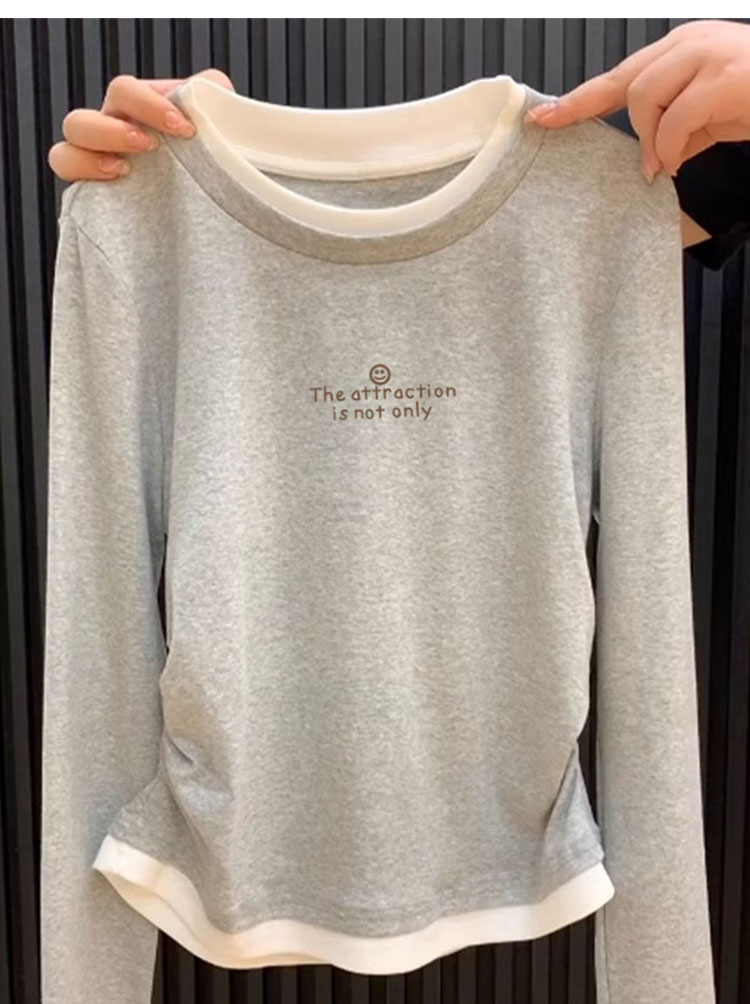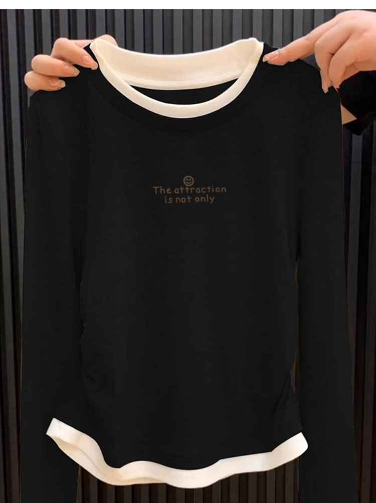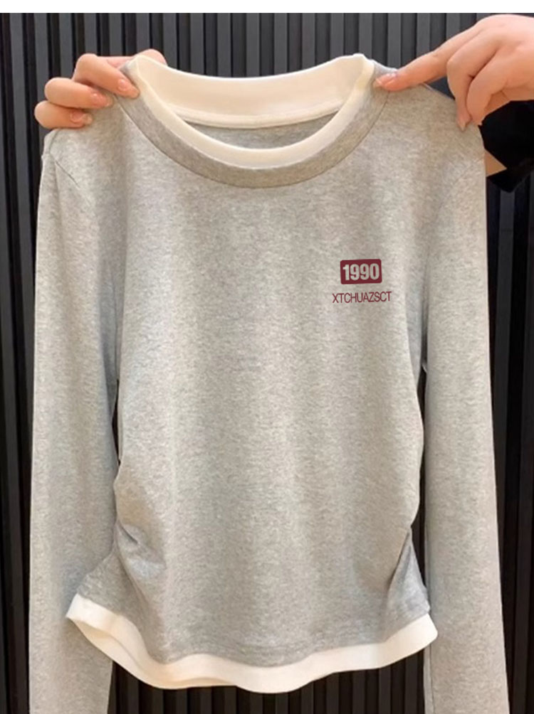 Stylish Contrast Colors False-Two-Piece Long Sleeves T-shirt Female Fall/Winter Slim Ruched plus Houde Velvet Inner Bottoming Shirt Tops